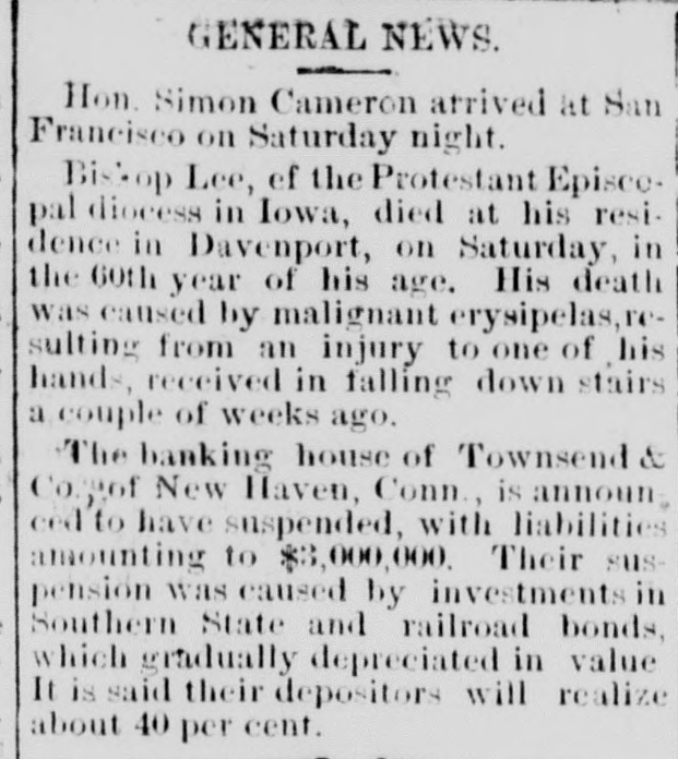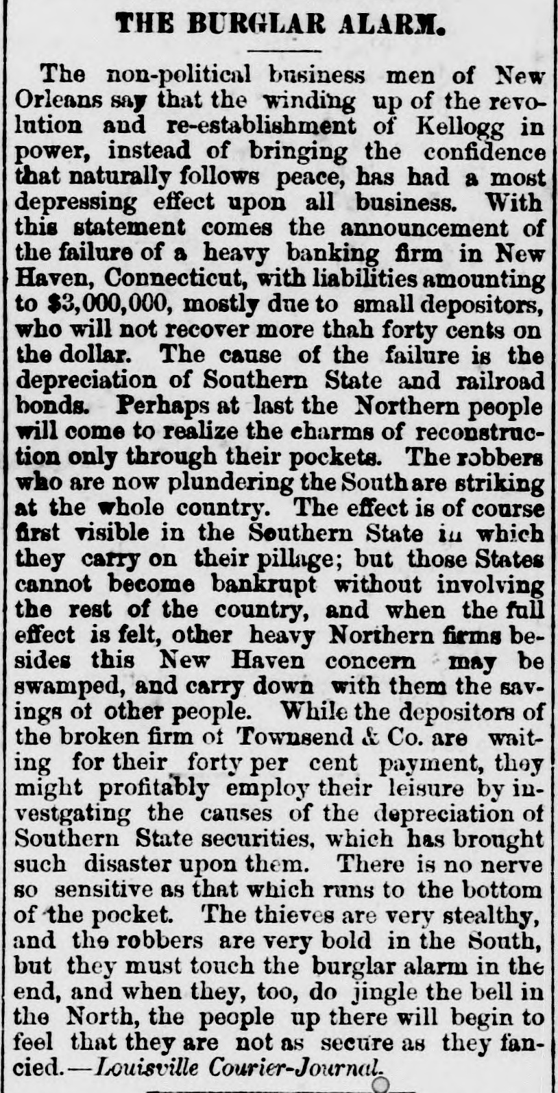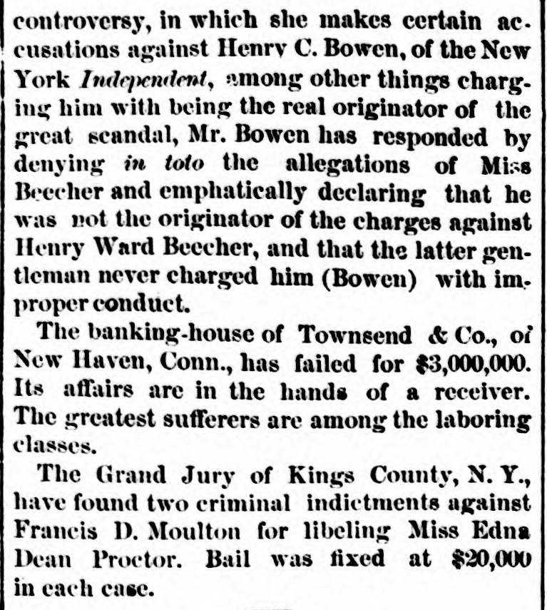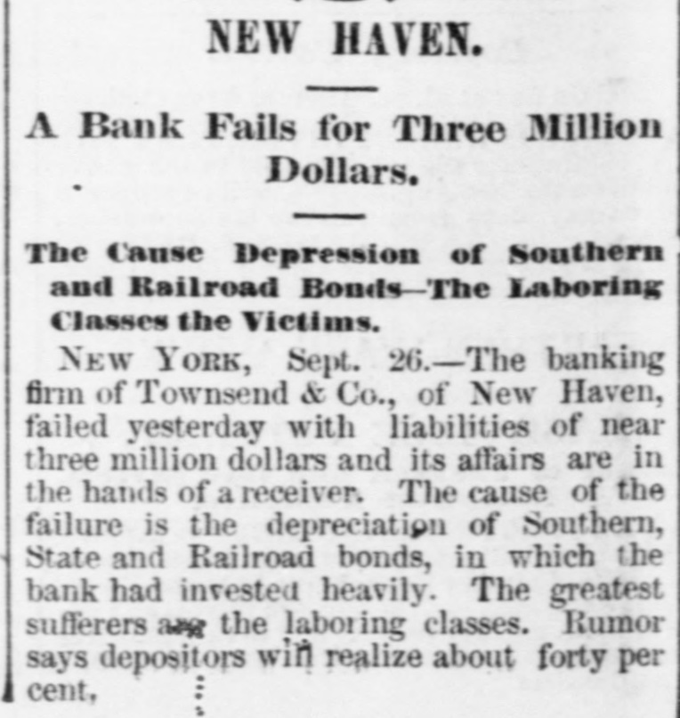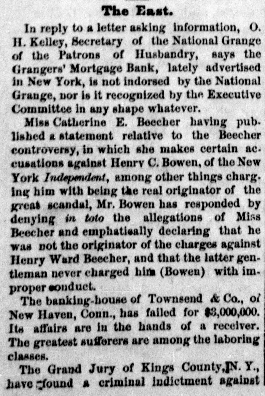 [CONTINCE FROM FIRST PAGE.] Seward, she was hauled off the reef last might. Taylor, the Texas Murderer. GALVESTON. September 26.-A News spe. cial from Indianola says Judge Borden taken or. dered the prisoner. William Taylor, back to jail in Galveston. His attorneys. feeling it impossible to get their witnesses The postponed moving for bail. eteamship here. Morgan left at 3 P. M. with sol- the OD board. under guard of the diers. prisoner The military companies were escorted to the steamer by the Indianola brass who band and a large number of citizens. showed their appreciation by hearty cheers. They were addressed by Hon. W. H. Crain in behalf of the citizens. The prisoner. William Taylor, and military arrived here this morning. Boating. RIVERSIDE. via St. Johns. N. B., September Morris started with forty strokes At to the minute. Brown with thirty-six. the half mile post Morris led by about half a length. They turned the stake boat at the same moment in 18:10. Brown won the race by nearly a length. Time-36:50. The distance was five miles. The Edgefield Troubles. AUGUSTA, September 26.-The troubles in A Edgefield. South Carolina, are ended. letter from J. L. Addison, a resident of Edgefield, states that Edward Tennant. captain of the county colored militia com. pany, delivered up their arms to Lieutenant Leahy, commanding a detachment of United States troops. The negroes have returned to their homes. International Rifle Shooting. CREEDMOOR, L. I., September 26.-In the international rifle match here to day the Americans won the first event of 800 yards by 326 to 317 for the Irish team. Fulton, of the Americans, made fifty. eight, and Hamilton made the same for the Irish. being the best shooting ever witmessed. The betting is $100 to $75 in favor of the Americans. The international rifle match took place to-day. at Creedmoor range. On the arrival of the trains from New York, a steady the stream of passengers flowed towards gateway of the range. which presented a picturesque appearance. The white tents dotted its surface. and flags of various nations were suspended over the entrance: among those standards. the American and Irish colors held the most conspicuous place. The reserved space. extending for about twenty fee: behind the marksmen, was surrounded by a rope, and crowding against this were dense lines of spectators, among whom: the Irish element was prominent. In the inclosure were the members of the American and Irish teams and their reserves. the scorer. and a few invited guests. Major Leech. of the Irish club, and Colonel Wingate. captain of the American, were chosen to act as referees, and General Shaler as umpire. It was not until a quarter past eleven that the firing began, the first trial of skill being at 800 yards range. The shooting was witnessed with most lively interest. the frequent bull 8 eye exciting loud murmurs of applause among the spectaters, who at first also hailed them by rounds of hand clapping At the earnest request of the captains of both teams, these demonstrations were finally subdued as having a tendency to disturb the marksmen. The result of the competition, which lasted one hour and a quarter, was in doubt almost up to the close. when it was found that the Americans were the winners by nine points, the individual totals standing as follows: Irish team- 54, Walker 46, Johnson 50, Righy 52, Hamilton 58, Milner 57-total 317. American teamFulton 58. Gildersleeve 53, Dakin 53, Kefburn 53, Bodine 54. Yale 55-total 326. This splendid shooting won lavish compliments for both parties. Fulton, of the American team, and Ham ilton, Irish, each scored 58 points out of a possible 60. J. K. Miller, of the Irish team. who scored 57, made the next best record, but none of the Americans fell below 53, while Captain Walker, of the Irish team, scored but 46. The latter also made two geose eggs, while none of the Americans missed once. The result of the first contest gave great encouragement to the friends of the Ameriman riffemen. The shooting was followed by an intermission for luncheon; the members of the two teams accompanying the Irish party and the officers of the National Rifle Association were served with lunch in one of the tents. Congratulations were exchanged on the marksmanship displayed, and in a complimentary speech Major Leech presented to the Rifle Association.jin behalf of the Irish team. a handsome silver vase as a trophy to be subject to annual competition and as a memorial of the international match. The Americans won the rifle match, the total score of the three ranges standingAmericans 934; Irish 931. Trotting at San Francisco. SAN FRANCISCO, September 26.-The tollowing is the summary of the trotting race vesterday: 23111 Purdy Occident 11222 Blackbird 32333 Time-2:21, 2:24 4, 2:25 4, 2:28, 2:28 4. Wife Murder. BOSTON, September 26.-At Newtonville last night Samuel Barker shot his wife fatally. Both were dissipated negroes. Failed. NEW HAVEN, Conn., September 26.-The banking firm of Townsend & Co., with liabilities of nearly three million dollars, has been taken in charge by a receiver. Investments in Southern State and railroad bonds, which have gradually depreciated. compelled their suspension. It is said the depositors will realize about forty per cent. 1. o. 0. F. ATLANTA, Ga., September 26-The Grand Lodge adjourned after a week's festivity and important business. The delegates express the highest praise of Southern hospitality, which, it is certainly hoped, they will echo at home. The Grand Lodge meets next year at Indianapolis. Municipal Election in Nashville. NASHVILLE. September 26. the muni-