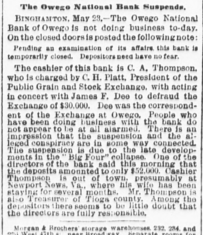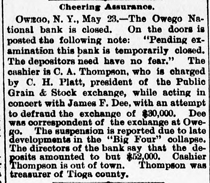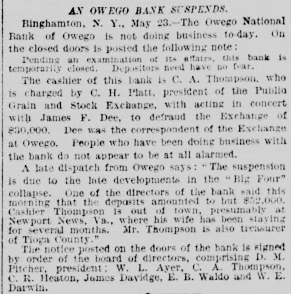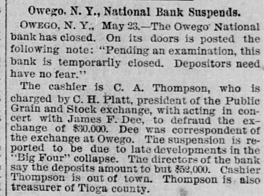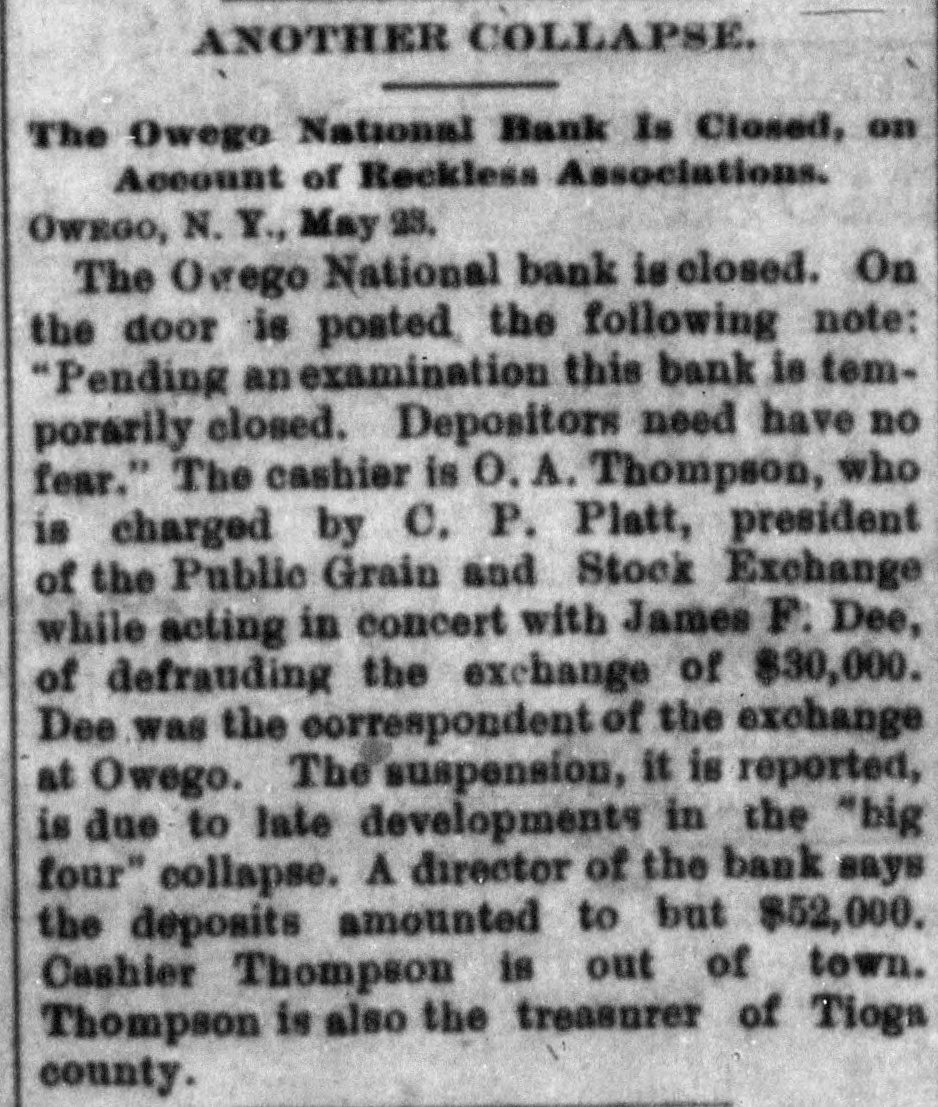ANOTHER COLLAPSE. The Owego National Bank Is Closed, on Account of Reckless Associations. OWEGO, N. Y., May 23. The Owego National bank is closed. On the door is posted the following note: "Pending an examination this bank is temporarily closed. Depositors need have no fear." The cashier is O.A. Thompson, who is charged by c. P. Platt, president of the Public Grain and Stock Exchange while acting in concert with James F. Dee, of defrauding the exchange of $30,000. Dee was the correspondent of the exchange at Owego. The suspension, it is reported, is due to late developments in the "big four" collapse. A director of the bank says the deposits amounted to but $52,000. Cashier Thompson is out of own. Thompson is also the treasurer of Tioga county.