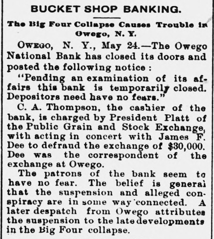 BUCKET SHOP BANKING. The Big Four Collapse Causes Trouble in Owego, N. Y. OWEGO, N. Y., May 24.-The Owego National Bank has closed its doors and posted the following notice : "Pending an examination of its affairs this bank is temporarily closed. Depositors need have no fears." C. A. Thompson, the cashier of the bank, is charged by President Platt of the Public Grain and Stock Exchange, with acting in concert with James F. Dee to defraud the exchange of $30,000. Dee was the correspondent of the exchange at Owego. The patrons of the bank seem to have no fear. The belief is general that the suspension and alleged conspiracy are in some way connected. A later despatch from Owego attributes the suspension to the late developments in the Big Four collapse.