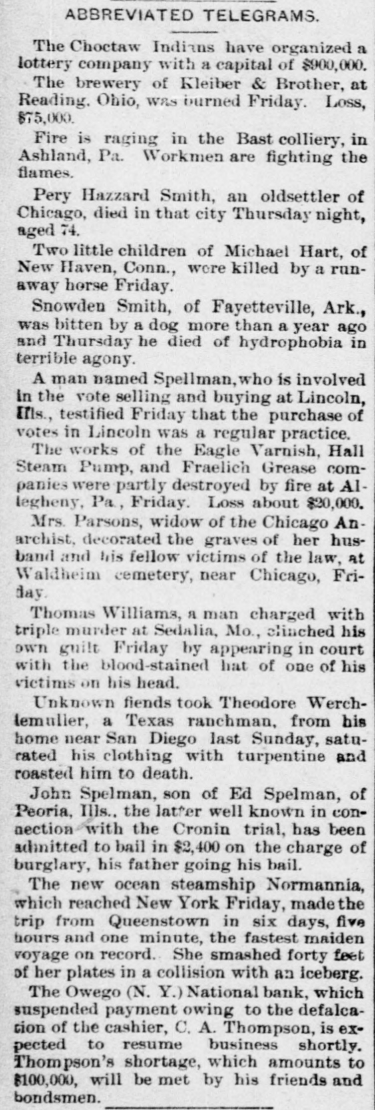 ABBREVIATED TELEGRAMS. The Choctaw Indians have organized a lottery company with a capital of $900,000. The brewery of Kleiber & Brother, at Reading. Ohio, W&S burned Friday. Loss, $75,000. Fire is raging in the Bast colliery, in Ashland, Pa. Workmen are fighting the flames. Pery Hazzard Smith, an oldsettler of Chicago, died in that city Thursday night, aged 74. Two little children of Michael Hart, of New Haven, Conn., wore killed by a runaway horse Friday. Snowden Smith, of Fayetteville, Ark., was bitten by a dog more than a year ago and Thursday he died of hydrophobia in terrible agony. A man named Spellman, who is involved In the vote selling and buying at Lincoln, Ifls., testified Friday that the purchase of votes in Lincoln was a regular practice. The works of the Eagle Varnish, Hall Steam Pump, and Fraelich Grease companies were partly destroyed by fire at Allegheny, Pa, Friday. Loss about $20,000. Mrs. Parsons, widow of the Chicago Anarchist, decorated the graves of her husband and his fellow victims of the law, at Waldheim cemetery, near Chicago, Friday. Thomas Williams, a man charged with triple murder at Sedalia, Mo., clinched his own guilt Friday by appearing in court with the blood-stained hat of one of his victims on his head. Unknown fiends took Theodore Werchtemuller, a Texas ranchman, from his home near San Diego last Sunday, saturated his clothing with turpentine and roasted him to death. John Spelman, son of Ed Spelman, of Peoria, Ills., the latter well known in connection with the Cronin trial, has been admitted to bail in $2,400 on the charge of burglary, his father going his bail. The new ocean steamship Normannia, which reached New York Friday, made the trip from Queenstown in six days, five hours and one minute, the fastest maiden voyage on record. She smashed forty feet of her plates in a collision with an iceberg. The Owego (N. Y.) National bank, which suspended payment owing to the defalcation of the cashier, C. A. Thompson, is expected to resume business shortly. Thompson's shortage, which amounts to $100,000, will be met by his friends and bondsmen.