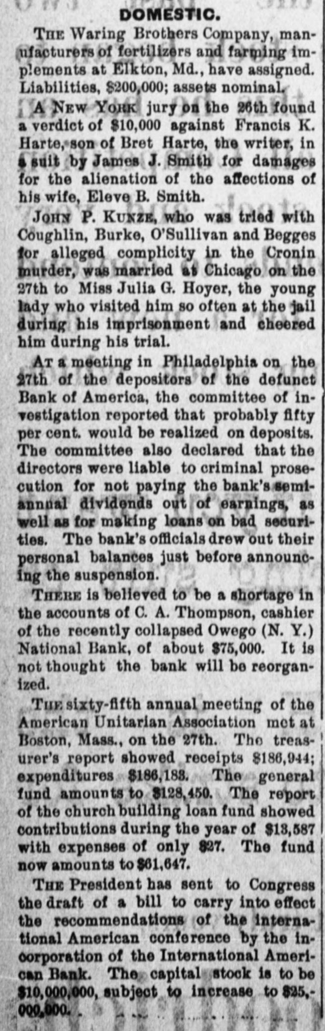 DOMESTIC. THE Waring Brothers Company, manufacturers of fertilizers and farming implements at Elkton, Md., have assigned. Liabilities, $200,000; assets nominal, A NEW YORK jury on the 26th found a verdict of $10,000 against Francis K. Harte, son of Bret Harte, the writer, in a suit by James J. Smith for damages for the alienation of the affections of his wife, Eleve B. Smith. JOHN P. KUNZE, who was tried with Coughlin, Burke, O'Sullivan and Begges for alleged complicity in the Cronin murder, was married at Chicago on the 27th to Miss Julia G. Hoyer, the young lady who visited him so often at the jail during his imprisonment and cheered him during his trial. AT a meeting in Philadelphia on the 27th of the depositors of the defunct Bank of America, the committee of investigation reported that probably fifty per cent. would be realized on deposits. The committee also declared that the directors were liable to criminal prosecution for not paying the bank's semiannual dividends out of earnings, as well as for making loans on bad securities. The bank's officials drew out their personal balances just before announcing the suspension. THERE is believed to be a shortage in the accounts of C. A. Thompson, cashier of the recently collapsed Owego (N. Y.) National Bank, of about $75,000. It is not thought the bank will be reorganized. THE sixty-fifth annual meeting of the American Unitarian Association met at Boston, Mass., on the 27th. The treasurer's report showed receipts $186,944; expenditures $186,183. The general fund amounts to $128,450. The report of the church building loan fund showed contributions during the year of $13,587 with expenses of only $27. The fund now amounts to $61,647. THE President has sent to Congress the draft of a bill to carry into effect the recommendations of the international American conference by the inoorporation of the International American Bank. The capital stock is to be $10,000,000, subject to increase to $25,000,000.