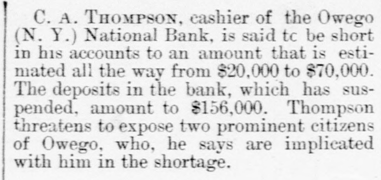 C. A. THOMPSON, cashier of the Owego (N. Y.) National Bank, is said tc be short in his accounts to an amount that is estimated all the way from $20,000 to $70,000. The deposits in the bank, which has suspended, amount to $156,000. Thompson threatens to expose two prominent citizens of Owego, who, he says are implicated with him in the shortage.