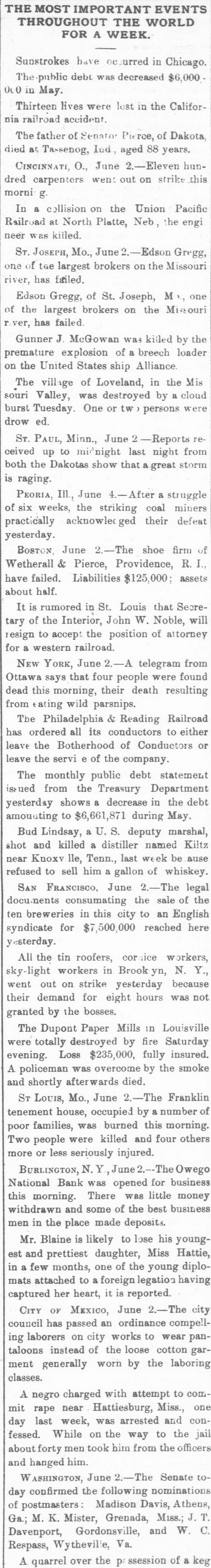 THE MOST IMPORTANT EVENTS THROUGHOUT THE WORLD FOR A WEEK. Sunstrokes have occurred in Chicago. The public debt was decreased $6,000 000 in May. Thirteen lives were lost in the California railroad accident. The father of Senator Pierce, of Dakota, died at Tassenog, Ind, aged 88 years. CINCINNATI, O., June 2.-Eleven hundred carpenters went out on strike this morni g. In a collision on the Union Pacific Railroad at North Platte, Neb, the engi neer was killed. Sr. JOSEPH, Mo., June 2.-Edson Gregg, one of tae largest brokers on the Missouri river, has failed. Edson Gregg, of St. Joseph, M., one of the largest brokers on the Missouri r.ver, has failed. Gunner J. McGowan was killed by the premature explosion of a breech loader on the United States ship Alliance. The village of Loveland, in the Mis souri Valley, was destroyed by a cloud burst Tuesday. One or tw persons were drow ed. Sr. PAUL, Minn., June 2-Reports received up to midnight last night from both the Dakotas show that a great storm is raging. PEORIA, III., June 4.-After a struggle of six weeks, the striking coal miners practically acknowled ged their defeat yesterday. BOSTON, June 2.-The shoe firm of Wetherall & Pierce, Providence, R. I., have failed. Liabilities $125,000; assets about half. It is rumored in St. Louis that Secretary of the Interior, John W. Noble, will resign to accept the position of attorney for a western railroad. NEW YORK, June 2.-A telegram from Ottawa says that four people were found dead this morning, their death resulting from eating wild parsnips. The Philadelphia & Reading Railroad has ordered all its conductors to either leave the Botherhood of Conductors or leave the servi e of the company. The monthly public debt statement issued from the Treasury Department yesterday shows a decrease in the debt amounting to $6,661,871 during May. Bud Lindsay, a U. S. deputy marshal, shot and killed a distiller named Kiltz near Knoxv lle, Tenn., last week be ause refused to sell him a gallon of whiskey. SAN FRANCISCO, June 2.-The legal documents consumating the sale of the ten breweries in this city to an English syndicate for $7,500,000 reached here yesterday. All the tin roofers, cornice workers, sky-light workers in Brook yn, N. Y., went out on strike yesterday because their demand for eight hours was not granted by the bosses. The Dupont Paper Mills in Louisville were totally destroyed by fire Saturday evening. Loss $235,000, fully insured. A policeman was overcome by the smoke and shortly afterwards died. ST LOUIS, Mo., June 2.-The Franklin tenement house, occupied by a number of poor families, was burned this morning. Two people were killed and four others more or less seriously injured. BURLINGTON, N. Y, June 2.--The Owego National Bank was opened for business this morning. There was little money withdrawn and some of the best business men in the place made deposits. Mr. Blaine is likely to lose his youngest and prettiest daughter, Miss Hattie, in a few months, one of the young diplomats attached to a foreign legation having captured her heart, it is reported. CITY OF MEXICO, June 2.-The city council has passed an ordinance compelling laborers on city works to wear pantaloons instead of the loose cotton garment generally worn by the laboring classes. A negro charged with attempt to commit rape near Hattiesburg, Miss., one day last week, was arrested and confessed. While on the way to the jail about forty men took him from the officers and hanged him. W ASHINGTON, June 2.-The Senate today confirmed the following nominations of postmasters Madison Davis, Athens, Ga.; M. K. Mister, Grenada, Miss.; J. T. Davenport, Gordonsville, and W. C. Respass, Wytheville, Va. A quarrel over the p ssession of a keg