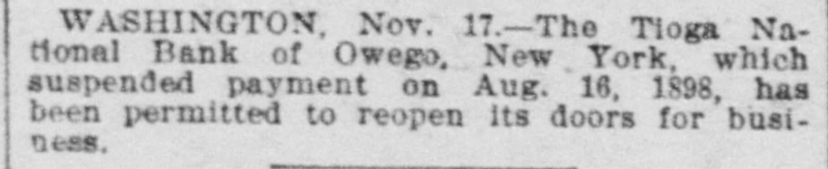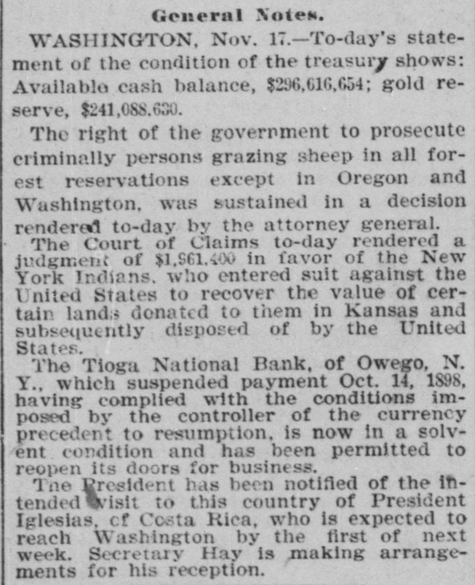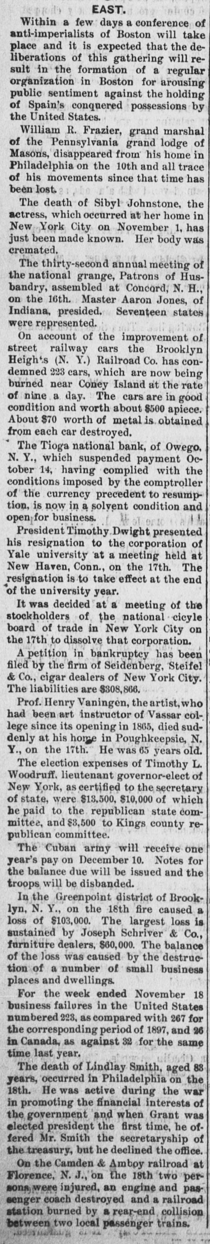 the Woman's Christian Temperance union Mrs. L. M. N. Stevens, of Maine, was elected president. The strike of coal miners in the Virden (III.) district, which has been the cause of rioting and bloodshed, has been brought to an end. Chase, Isherwood & Co., the oldest tobacco firm in Ohio, has gone out of business. The Tioga national bank at Owego, N. Y., which suspended recently, has resumed business. The union coal miners returned to work at Virden, Ill., after a lockout since April 1. The Missouri supreme court decided the law by which cities are compelled to sell franchises to corporations to be unconstitutional. Prairie fires in Gregory. Tripp and Todd counties, S.D., caused the ruin of thousands of acres of range and the loss of many cattle. Robert McFadden, William Henderson, John Kell and George Morgan were caught in the bottom of a shaft in Butte, Mont., by an explosion and fatally injured. The First national bank of Emporia, Kan., was closed by order of the comptroller of the treasury. and an hour !ater Charles S. Cross, the bank's president. committed suicide. Ethel Marlowe, a young and hand- the some astress, dropped dead on stage in New York. The report of Gen. G. N. Lieber, judge advocate general. for the year ended August 31, shows that there have been a total of 1,180 courts-martial during the year. Bishop Fowler announces that the Methodists are preparing to establish the churches in Cuba, Porto Rico and Philippines. The government has decided to investhe race troubles in South Carolina tigate in respect to the interference with the duties of federal officers. Mayor Ziegenheim has s vetoed the curfew bill passed by the St. Louis city council. The thirty-second annual meeting Hus- of the National grange, Patrons of bandry, began in Concord, N. H. Attheclosing session in St. Paul of the Woman's Christian Temperance union Mrs. M. B. Carse. of Illinois, one of the most prominent members. withdrew she from the organization. saying would not return until the temple fund was raised. The world's gold product for 1898 is placed at $275,000,000, against $237,000,000 in 1897. The total imports of gold in the ten months ended October 31, 1898, were $143,658,095 exceeding the exports by $129.396,246. The total money in circulation in the United States at the beginning of the present month was $1,866,575,782. against $1,706,732,904 at the corresponding date last year. Two battles took place between union white miners and negroes in Springside, a suburb of Pana, III., but no one was: riously injured. Secretary Long in his annual report three recommends the construction of first-class battleships and five first-class aa armored cruisers and recommends addition of 5,000 men to the navy. At citizens' mass meeting in Omaha a decided that the trans-Missisnext year. sippi it was exposition should be continued Col. F. C. Ainsworth, chief of the and pension office. war depart- that record in his annual report says disment, 13,296 cases were received and posed of during the past fiscal year. the a net increase of 43,489 cases over previous At Newport, year. R. I., the torpedo hour. boat made over 30 knots an in the proving Dupont her to be the fastest boat United States navy. Timothy Dwight, president of for Yale 12 college at New Haven. Conn., years, has resigned. Seidenberg. Steifel & Co., cigar dealin New York, failed for $500,000. ers said that Secretary Alger. in his and President will annual It is report, congress. McKinley, his annual message to be in recommend that the standing army basis of placed on a permanent peace 100,000 men. Schmidt. wholesale liquor deal W. Pittsburgh. Pa., filed his petition liabiler in in voluntary bankruptcy with ities of $818,000.