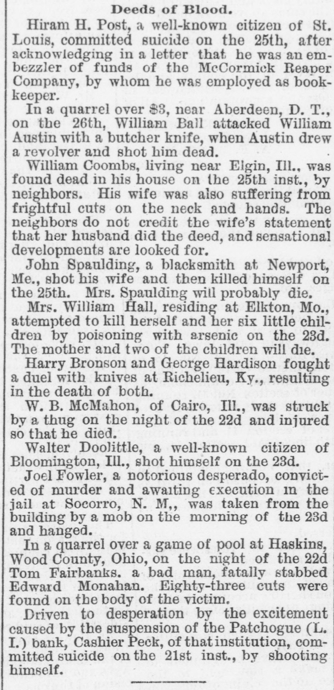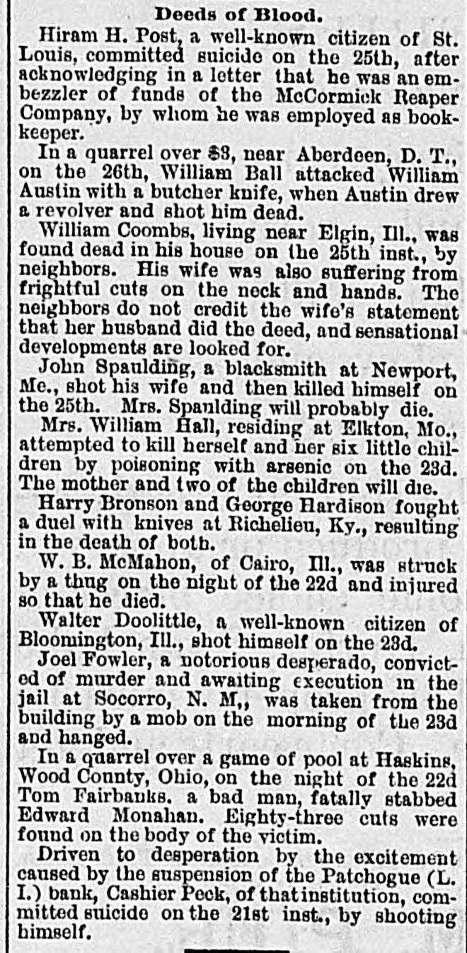 NEW-YORK, SATURDAY, JAN. 19. THE NEWS THIS MORNING. FOREIGN.-A new Spanish Ministry was formed Marquis Tseng held an interview yesterday. Vignaux defeated with Earl Granville. Monsignor Schaefer at billiards in Paris. General MeliCesare was murdered in Rome. The Glasgow Court of koff is serious'y ill. Inquiry held Captain Donaldson responsible for the Bolivia disaster. CONGRESS.-The Senate failed to pass the Mexican Treaty. The bill relating to the opium traffic with China was placed on the The House spent the day in a calendar. debate on the Fitz John Porter bill, speeches being made by General Slocum, Mr. Steele and Mr. Lyman. The debate will be continued to-day. DOMESTIC.-The coasting steamer City of Columbus has been wrecked at the west end of Martha's Dynamite Vineyard and about 100 lives lost. works near Allentown, Penn., powder mills near Scranton, and a boiler at Rochester, N. H., exploded, New-Hampshire each killing several persons. A hotel and North Carolina felt earthquakes. at Las Vegas, New-Mexico, burned and the guests Testimony in the Nutt lost much property. There were ice-boat case is virtually ended. Judge E.K. Wilson was races on the Hudson. elected to succeed Senator Groome of Maryland. CITY AND SUBURBAN.-The Republican primaries A man was fatally were held last night. Edmund S. stabbed yesterday in Hudson-st. Tappan confessed that his brother John murdered The net reMrs. Maybee and her daughter. ceipts of the Pedestal Fund Loan Exhibition were Senor Juan de reported to be $13,792 51. Valera, the new Spanish Minister, arrived by the Charles Delmonico's will was Cephalonia. The Patchogue Bank susoffered for probate. Father McCarthey, of pended payment. Brooklyn, was fined in the Harlem Police The ribbon weavers Court for drunkenness. A man was of Paterson begun a strike. found dead in a building that was burned By the explosion of a on Wednesday. range, at Hunter's Point. one child was killed and The Rev. Arthur another fatally injured. Crosby, of Brooklyn, has accepted a call to San Gold value of the legal tender Francisco. Stocks silver dollar (4121₂ grains), 85.62 cents. opened higher and declined sharply; later they recovered and closed irregular and unsettled. THE local observations mdicate generally cloudy weather, with chances of rain or snow, followed by clearing and colder weather. Temperature yesterday: Highest, 41°; lowest, 25°: average, 3318°.