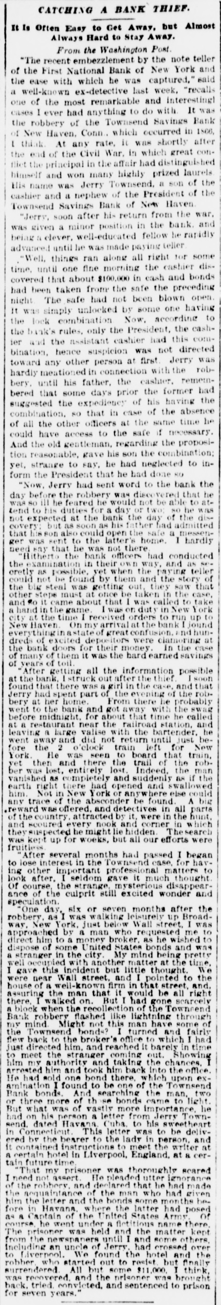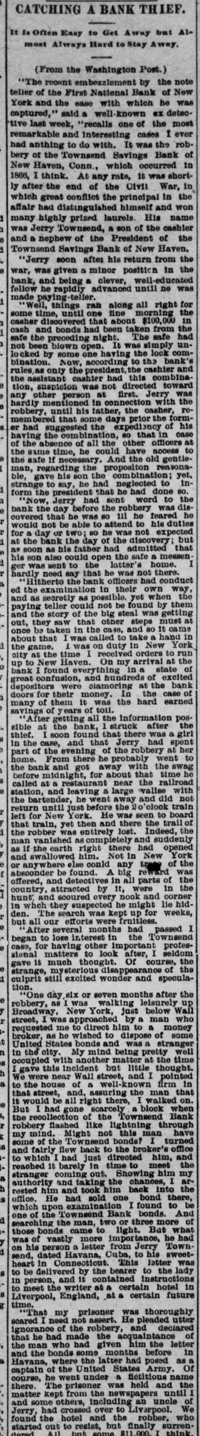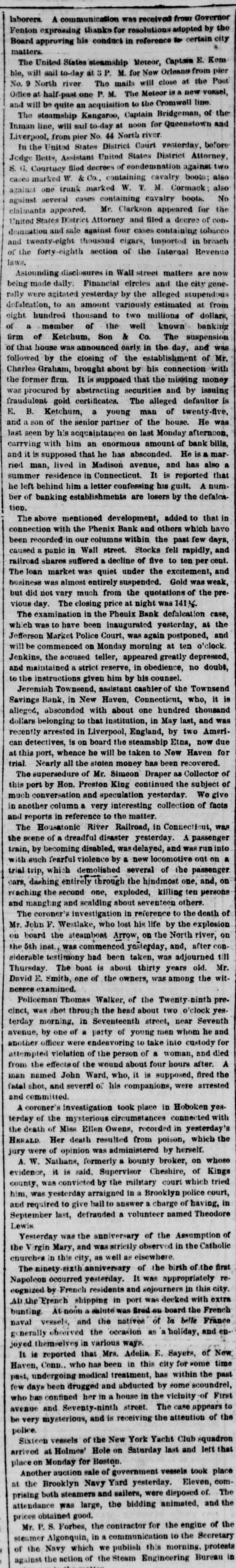 laborers. A communication was received from Governor Fenton expressing thanks for resolutions adopted by the Board approving his conduct in reference to certain city matters. The United States steamship Meteor, Captain E. Kem ble, will sail to-day at 3 P. M. for New Orleans from pier No. 9 North river The mails will close at the Post Office at half-past one P. M. The Meteor is a new vessel, and will be quite an acquisition to the Cromwell line. The steamship Kangaroo, Captain Bridgeman, of the Inman line, will sail to-day at noon for Queenstown and Liverpool, from pier No. 44 North river. In the United States District Court vesterday, before Jedge Betts, Assistant United States District Attorney, S. G. Courtney filed decrees of condemnation against two cases marked W. & Co., containing cavalry boots; also against one trunk marked W. T. M. Cormack; also against several cases containing cavalry boots. No claimants appeared. Mr. Clarkson appeared for the United States District Attorney and filed a decree of condemnation and sale against four cases containing tobacco and twenty-eight thousand cigars, imported in breach of the forty-eighth section of the Internal Revenue laws. Astounding disclosures in Wall street matters are now being made daily. Financial circles and the city generally were agitated yesterday by the alleged stupendous defalcation, to an amount variously estimated at from eight hundred thousand to two millions of dollars, of a member of the well known banking firm of Ketchum, Son & Co. The suspension of that house was announced early in the day, and was followed by the closing of the establishment of Mr. Charles Graham, brought about by his connection with the former firm. It is supposed that the missing money was procured by abstracting securities and by issuing fraudulent gold certificates. The alleged defaulter is E. B. Ketchum, a young man of twenty-five, and a son of the senior partner of the house. He was last seen by his acquaintances on last Monday afternoon, carrying with him an enormous amount of bank bills, and it is supposed that he has absconded. He is married man, lived in Madison avenue, and has also a summer residence in Connecticut. It is reported that he left behind him a letter confessing his guilt. A number of banking establishments are losers by the defalcation. The above mentioned development, added to that in connection with the Phenix Bank and others which have been recorded in our columns within the past few days, caused a panic in Wall street. Stocks fell rapidly, and railroad shares suffered a decline of five to ten per cent. The loan market was quiet under the excitement, and business was almost entirely suspended. Gold was weak, but did not vary much from the quotations of the previous day. The closing price at night was 1411/2. The examination in the Phenix Bank defalcation case, which was to have been inaugurated yesterday, at the Jefferson Market Police Court, was again postponed, and will be commenced on Monday morning at ten o'clock. Jenkins, the accused teller, appeared greatly depressed, and maintained a strict reserve, in obedience, no doubt, to the instructions given him by his counsel. Jeremiah Townsend, assistant cashier of the Townsend Savings Bank, in New Haven, Connecticut, who, it is alleged, absconded with about one hundred thousand dollars belonging to that institution, in May last, and was recently arrested in Liverpool, England, by two American detectives, is on board the steamship Etna, now due at this port, whence he will be taken to New Haven for trial. Nearly all the stolen money has been recovered. The supersedure of Mr. Simeon Draper as Collector of this port by Hon. Preston King continued the subject of much conversation and speculation yesterday. We give in another column a very interesting collection of facts and reports in reference to the matter. The Housatonic River Railroad, in Connecticut, was the scene of a dreadful disaster yesterday. A passenger train, by becoming disabled, s delayed, and was into with such fearful violence by a new locomotive out on a trial trip, which demolished several of the passenger cars, dashing entirely through the hindmost one, and, on reaching the second one, exploded, killing ten persons and manghing and scalding about seventeen others. The coroner's investigation in reference to the death of Mr. John F. Westlake, who lost his life by the explosion on board the steamboat Arrow, on the North river, on the 5th inst., was commenced yesterday, and, after considerable testimony had been taken, was adjourned till Thursday. The boat is about thirty years old. Mr. David E. Smith, one of the owners, was among the witnesses examined. Policeman Thomas Walker, of the Twenty-ninth precinct, was shot through the head about two o'clock yes. terday morning, in Seventeenth street, near Seventh avenue, by one of a party of young men whom he and another officer were endeavoring to take into custody for attempted violation of the person of a woman, and died from the effects of the wound about four hours after. A man named John Ward, who, it is supposed, fired the fatal shot, and several of his companions, were arrested and committed. A coroner's investigation took place in Hoboken yes. terday of the mysterious circumstances connected with the death of Miss Ellen Owens, recorded in yesterday's HERALD. Her death resulted from poison, which the jury were of opinion was administered by herself. A. W. Nathans, formerly a bounty broker, on whose evidence, it is said, Supervisor Cheshire, of Kings county, was convicted by the military court which tried him, was yesterday arraigned in a Brooklyn police court, and required to give bail to answer a charge of having, in September last, defrauded a volunteer named Theodore Lewis Yesterday was the anniversary of the Assumption of the Virgin Mary, and was strictly observed in the Catholic enurches in this city, as well as elsewhere. The minety-sixth anniversary of th
