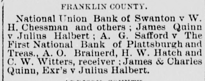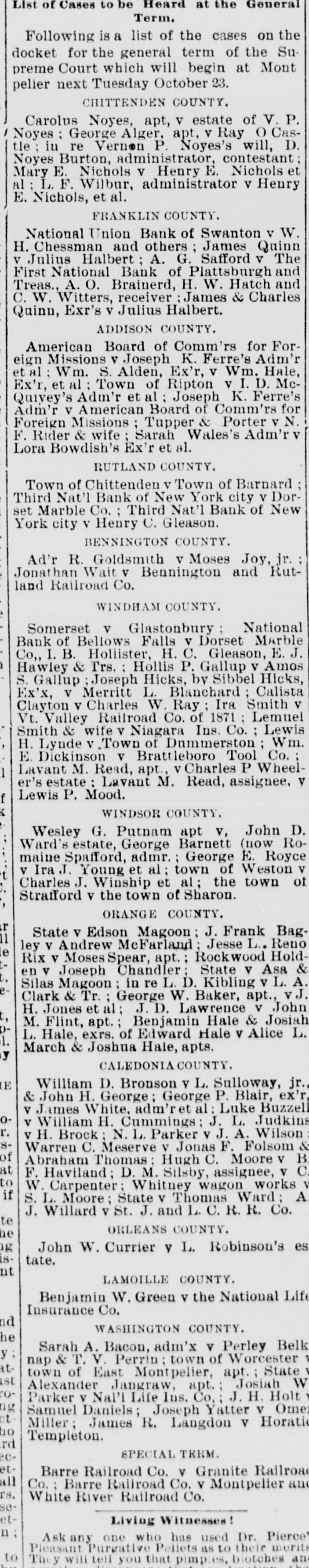 List of Cases to be Heard at the General Term. Following is a list of the cases on the docket for the general term of the Su- preme Court which will begin at Mont pelier next Tuesday October 23. CHITTENDEN COUNTY. Carolus Noyes, apt, v estate of V. P. Noyes; George Alger, apt, v Ray O Cas- tle; iu re Vernon P. Noyes's will, D. Noyes Burton, administrator, contestant; Mary E. Nichols v Henry E. Nichols et al; L. F. Wilbur, administrator v Henry E. Nichols, et al. FRANKLIN COUNTY. National Union Bank of Swanton v W. H. Chessman and others; James Quinn v Julius Halbert A. G. Safford v The First National Bank of Plattsburgh and Treas., A. O. Brainerd, H. W. Hatch and C. W. Witters, receiver: James & Charles Quinn, Exr's v Julius Halbert. ADDISON COUNTY. American Board of Comm'rs for For- eign Missions v Joseph K. Ferre's Adm'r etal; Wm. S. Alden, Ex'r, v Wm. Hale, Ex'r, et al: Town of Ripton v I. D. Mc- Qurvey's Adm'r et al; Joseph K. Ferre's Adm'r v American Board of Comm'rs for Foreign Missions; Tupper & Porter v N. F. Rider & wife; Sarah Wales's Adm'r v Lora Bowdish's Ex'r et al. RUTLAND COUNTY. Town of Chittenden v Town of Barnard; Third Nat'l Bank of New York city v Dor- set Marble Co. Third Nat'l Bank of New York city v Henry C. Gleason. BENNINGTON COUNTY. Ad'r R. Goldsmith v Moses Joy, jr.; Jonathan Wait v Bennington and Rut- land Railroad Co. WINDHAM COUNTY. Somerset v Glastonbury: National Bank of Bellows Falls v Dorset Marble Co,, I. B. Hollister, H. C. Gleason, E. J. Hawley & Trs. Hollis P. Gallup v Amos S. Gallup; Joseph Hicks, by Sibbel Hicks, Ex'x, v Merritt L. Blanchard; Calista Clayton v Charles W. Ray; Ira Smith v Vt. Valley Railroad Co. of 1871; Lemuel Smith & wife v Niagara Ins. Co.; Lewis H. Lynde v Town of Dummerston; Wm. E. Dickinson v Brattleboro Tool Co.; Lavant M. Read, apt., v Charles P Wheel- er's estate: Lavant M. Read, assignee, v Lewis P. Mood. WINDSOR COUNTY. Wesley G. Putnam apt v, John D. Ward's estate, George Barnett (now Ro- maine Spafford, admr.; George E. Royce v Ira J. Young et al; town of Weston v Charles J. Winship et al; the town of Strafford v the town of Sharon. ORANGE COUNTY. State v Edson Magoon; J. Frank Bag- eley v Andrew McFarland; Jesse L.. Reno Rix v Moses Spear, apt.; Rockwood Hold- en v Joseph Chandler; State v Asa & Silas Magoon; in re L. D. Kibling v L. A. Clark & Tr.; George W. Baker, apt., vJ. H. Jones et al; J. D. Lawrence v John M. Flint, apt.; Benjamin Hale & Josiah D. L. Hale, exrs. of Edward Hale v Alice L. March & Joshua Hale, apts. CALEDONIA COUNTY. William D. Bronson v L. Sulloway, jr.. & John H. George; George P. Blair, ex'r, v James White, adm'ret al: Luke Buzzell v William H. Cummings; J. L. Judkins v H. Brock; N. L. Parker v J. A. Wilson Warren C. Meserve v Jonas F. Folsom & Abraham Thomas; Hugh C. Moore v B. F. Haviland; D. M. Silsby, assignee, v C. W. Carpenter; Whitney wagon works v S. L. Moore; State v Thomas Ward; A J. Willard v St. J. and L. C. R. R. Co. ORLEANS COUNTY. John W. Currier y L. Robinson's es- tate. LAMOILLE COUNTY. Benjamin W. Green v the National Life Insurance Co. WASHINGTON COUNTY. Sarah A. Bacon, adm'x v Perley Belk- nap & T. V. Perrin; town of Worcester v town of East Montpelier, apt.; State v Alexander Jangraw, apt.; Josiah W. Parker v Nal'l Life Ins. Co,; J. H. Holt v Samuel Daniels; Joseph Yatter v Omer Miller; James R. Langdon v Horatio Templeton. SPECIAL TERM. Barre Railroad Co. v Granite Railroad Co.; Barre Railroad Co. v Montpelier and White River Railroad Co.
