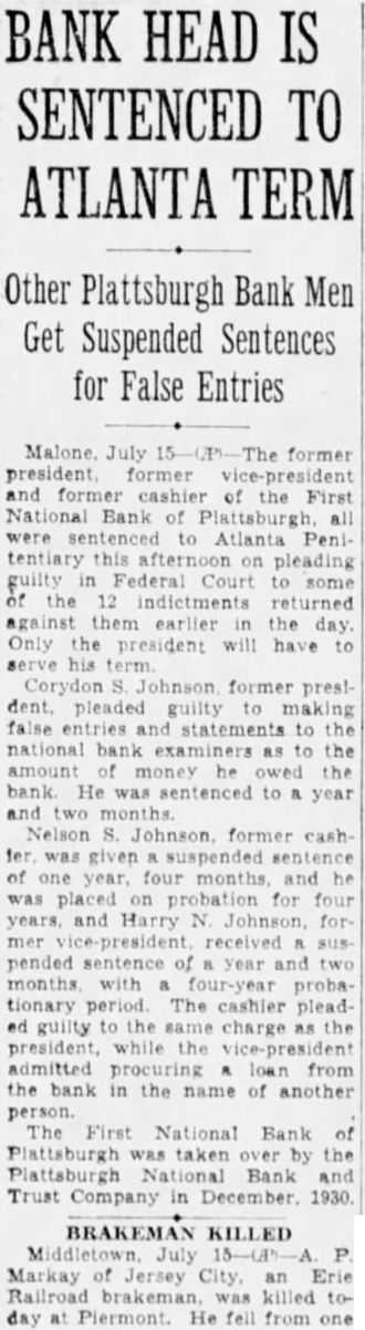 BANK HEAD IS SENTENCED TO ATLANTA TERM Other Plattsburgh Bank Men Get Suspended Sentences for False Entries Malone July former president former and former cashier of the First National Bank of Plattsburgh all were sentenced to Atlanta Penitentiary this afternoon on pleading guilty in Federal Court to some of the 12 indictments returned against them earlier the day. Only the president will have to serve his term Corydon Johnson former prestdent. pleaded guilty to making false entries and statements to the national bank examiners as to the amount of money he owed the bank. He was sentenced to a year and two months fer was given suspended sentence of one year, four months, and he was placed on probation for four years. and Harry N. Johnson, for pended sentence of a year and months with four-year probationary period. The cashier pleaded guilty to the same charge as the president, while the vice-president admitted procuring loan from the bank in the name of another person. The First National Bank of Plattsburgh was taken over by the Plattsburgh National Bank and Trust Company in December. 1930 BRAKEMAN KILLED Markay of Jersey City, an Erie Railroad brakeman. was killed today at Piermont. He fell from one