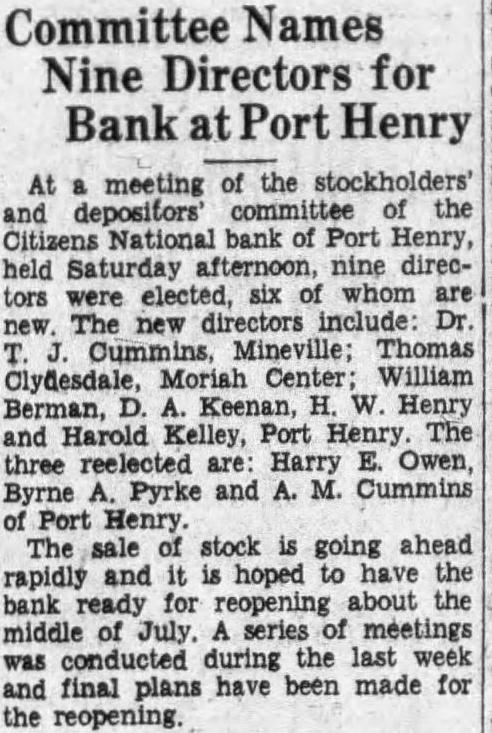Committee Names Nine Directors for Bank at Port Henry At a meeting of the stockholders' and depositors committee of the Citizens National bank of Port Henry, held Saturday afternoon, nine directors were elected, six of whom are new. The new directors include: Dr. T. J. Cummins, Mineville; Thomas Clydesdale, Moriah Center; William Berman, D. A. Keenan, H. W. Henry and Harold Kelley, Port Henry. The three reelected are: Harry E. Owen, Byrne A. Pyrke and A. M. Cummins of Port Henry. The sale of stock is going ahead rapidly and it is hoped to have the bank ready for reopening about the middle of July. A series of meetings was conducted during the last week and final plans have been made for the reopening.