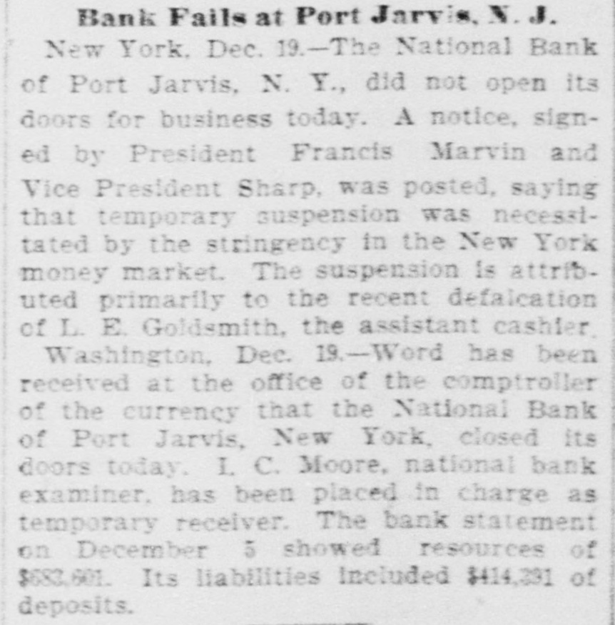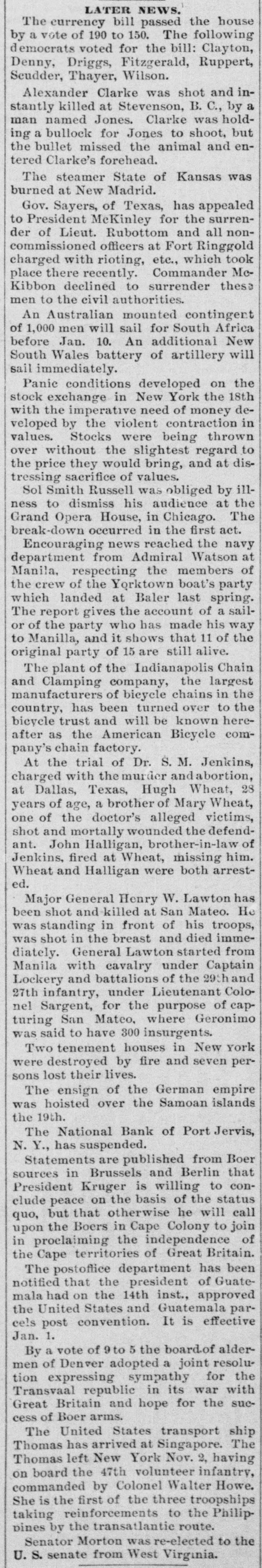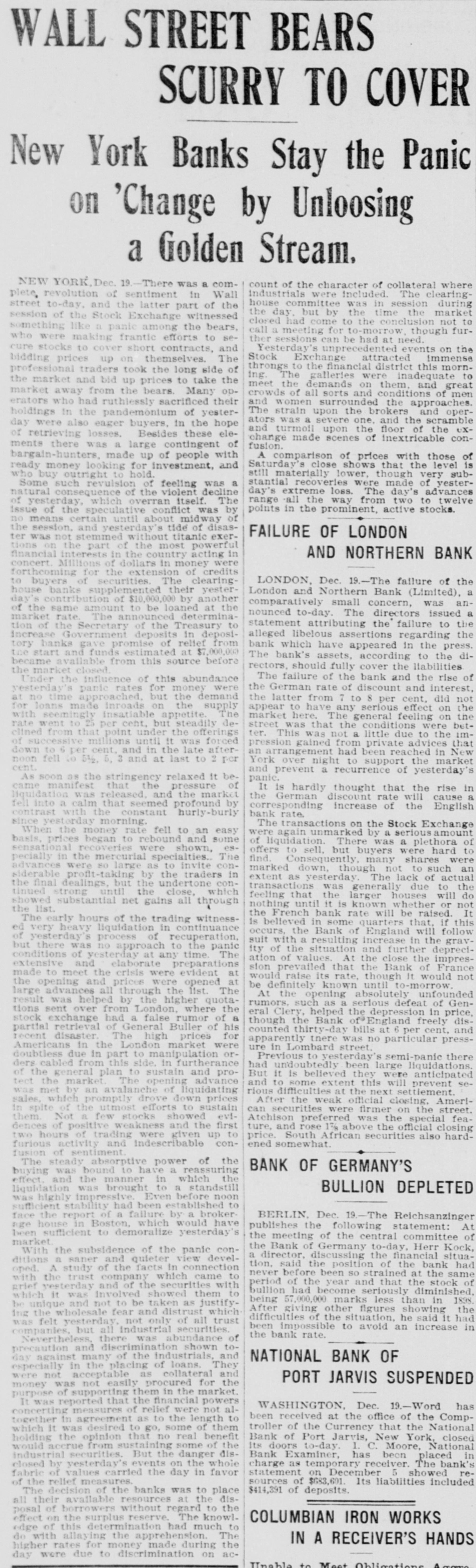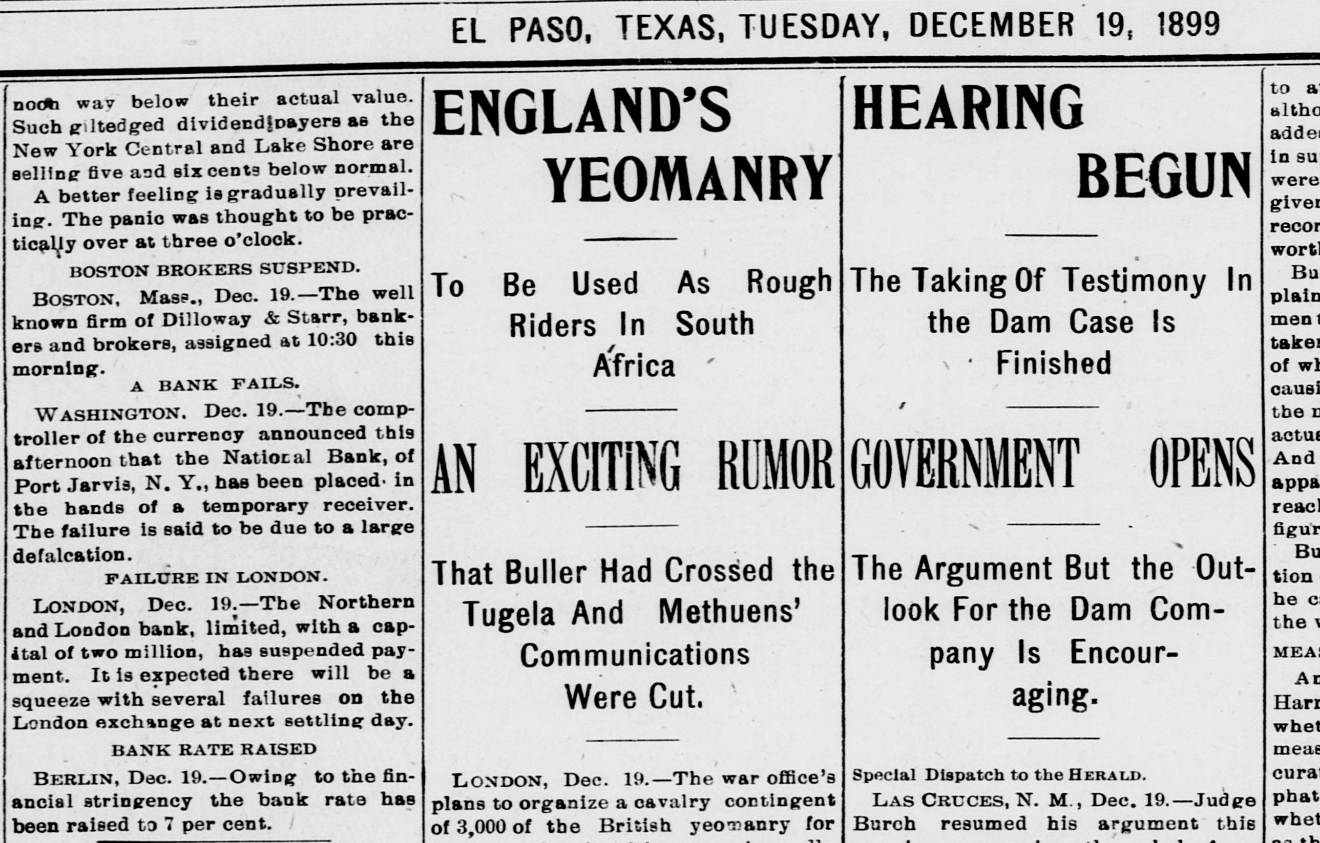 EL PASO, TEXAS, TUESDAY, DECEMBER 19, 1899 to a noon way below their actual value. altho HEARING ENGLAND'S Such giltedged dividend|payers as the added New York Central and Lake Shore are in su selling five and six cents below normal. were BEGUN YEOMANRY A better feeling is gradually prevailgiver ing. The panic was thought to be pracrecor tically over at three o'clock. worth BOSTON BROKERS SUSPEND. Bu To Be Used As Rough The Taking Of Testimony In plain BOSTON, Mase., Dec. 19.-The well men t known firm of Dilloway & Starr, bankthe Dam Case Is Riders In South take ers and brokers, assigned at 10:30 this of w Finished Africa morning. A BANK FAILS. causi the n WASHINGTON. Dec. 19.-The compactua troller of the currency announced this And afternoon that the National Bank, of OPENS appa AN EXCITING RUMOR GOVERNMENT Port Jarvis, N. Y., has been placed. in reach the hands of a temporary receiver. figur The failure is said to be due to a large Bu defalcation. tion FAILURE IN LONDON. That Buller Had Crossed the The Argument But the Outhe c LONDON, Dec. 19.-The - Northern look For the Dam Comthe y Tugela And Methuens' and London bank, limited, with a capMEA ital of two million, has suspended payCommunications pany Is EncourAr ment. It is expected there will be a Were Cut. Harr squeeze with several failures on the aging. London exchange at next settling day. whet meas BANK RATE RAISED cura: Special Dispatch to the HERALD. BERLIN, Dec. 19.-Owing to the finLONDON, Dec. 19.-The war office's phat LAS CRUCES, N. M., Dec. 19. Judge ancial stringency the bank rate has plans to organize a cavalry contingent whet been raised to 7 per cent. Burch resumed his argument this of 3,000 of the British yeomanry for with
