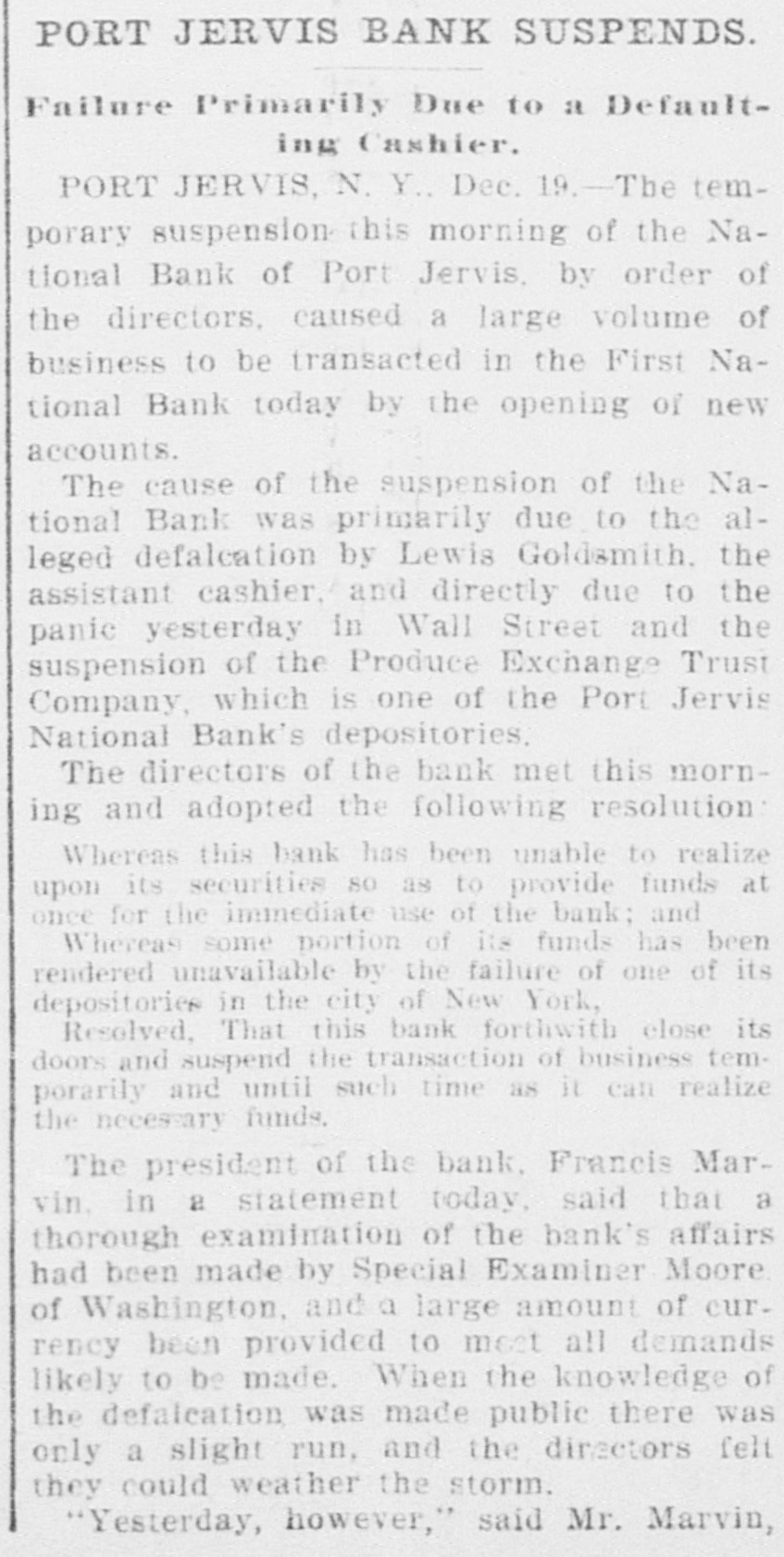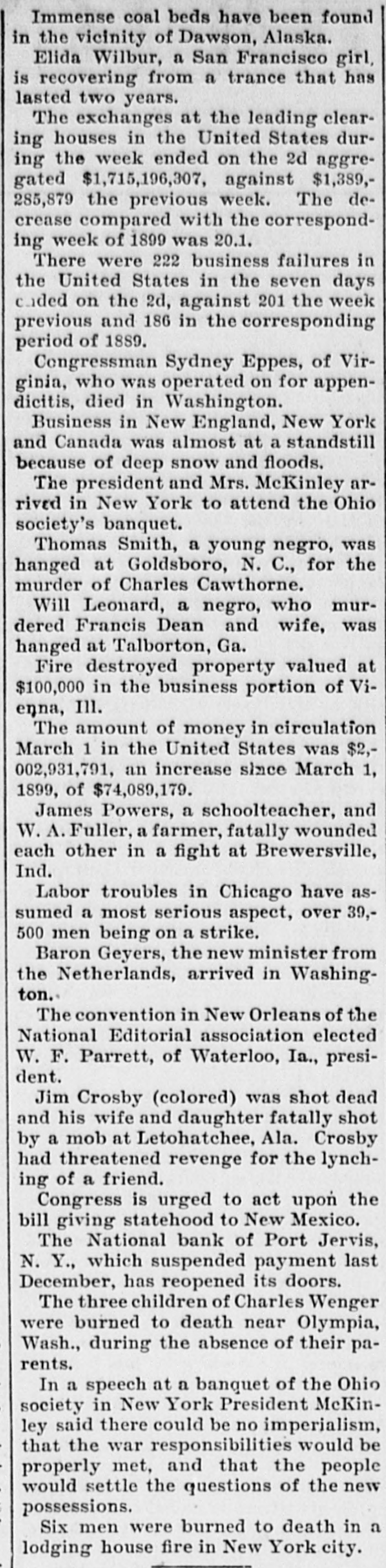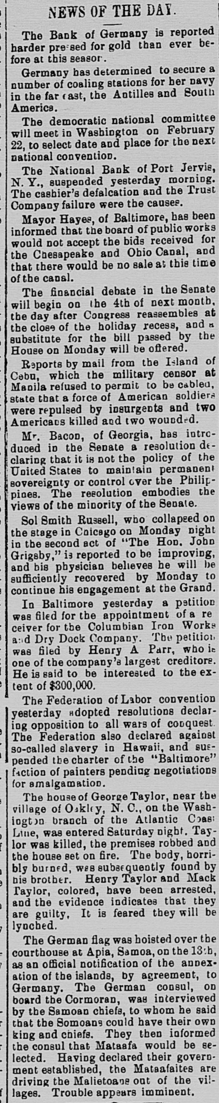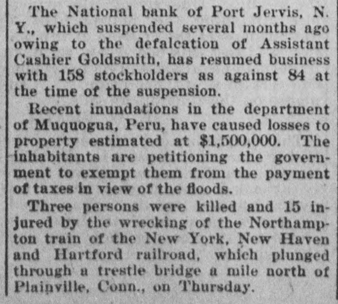 EL PASO, TEXAS, TUESDAY, DECEMBER 19, 1899 to a noon way below their actual value. altho HEARING ENGLAND'S Such giltedged dividend|payers as the added New York Central and Lake Shore are in su selling five and six cents below normal. were BEGUN YEOMANRY A better feeling is gradually prevailgiver ing. The panic was thought to be pracrecor tically over at three o'clock. worth BOSTON BROKERS SUSPEND. Bu To Be Used As Rough The Taking Of Testimony In plain BOSTON, Mase., Dec. 19.-The well men t known firm of Dilloway & Starr, bankthe Dam Case Is Riders In South take ers and brokers, assigned at 10:30 this of w Finished Africa morning. A BANK FAILS. causi the n WASHINGTON. Dec. 19.-The compactua troller of the currency announced this And afternoon that the National Bank, of OPENS appa AN EXCITING RUMOR GOVERNMENT Port Jarvis, N. Y., has been placed. in reach the hands of a temporary receiver. figur The failure is said to be due to a large Bu defalcation. tion FAILURE IN LONDON. That Buller Had Crossed the The Argument But the Outhe c LONDON, Dec. 19.-The - Northern look For the Dam Comthe y Tugela And Methuens' and London bank, limited, with a capMEA ital of two million, has suspended payCommunications pany Is EncourAr ment. It is expected there will be a Were Cut. Harr squeeze with several failures on the aging. London exchange at next settling day. whet meas BANK RATE RAISED cura: Special Dispatch to the HERALD. BERLIN, Dec. 19.-Owing to the finLONDON, Dec. 19.-The war office's phat LAS CRUCES, N. M., Dec. 19. Judge ancial stringency the bank rate has plans to organize a cavalry contingent whet been raised to 7 per cent. Burch resumed his argument this of 3,000 of the British yeomanry for with