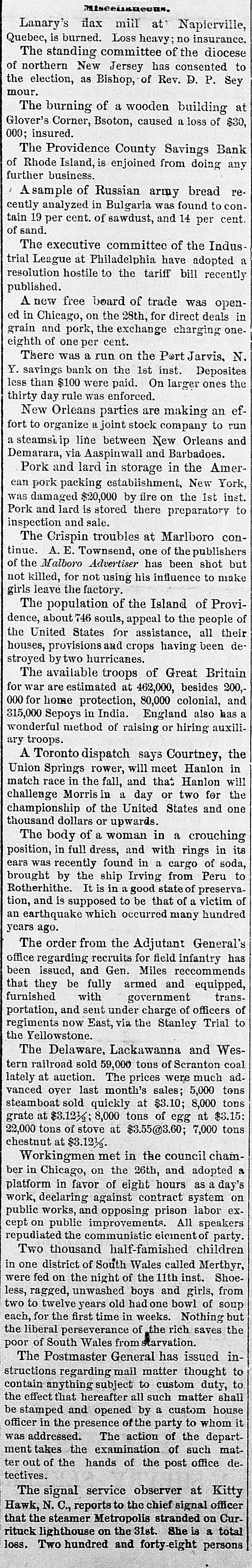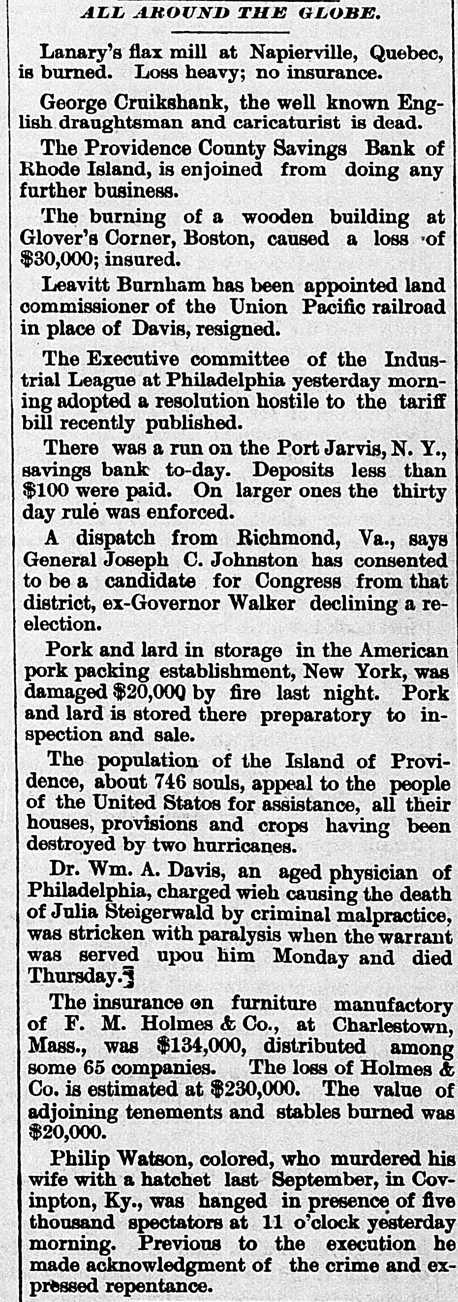 ALL AROUND THE GLOBE. Lanary's flax mill at Napierville, Quebec, is burned. Loss heavy; no insurance. George Cruikshank, the well known English draughtsman and caricaturist is dead. The Providence County Savings Bank of Rhode Island, is enjoined from doing any further business. The burning of a wooden building at Glover's Corner, Boston, caused a loss of $30,000; insured. Leavitt Burnham has been appointed land commissioner of the Union Pacific railroad in place of Davis, resigned. The Executive committee of the Industrial League at Philadelphia yesterday morning adopted a resolution hostile to the tariff bill recently published. There was a run on the Port Jarvis, N. Y., savings bank to-day. Deposits less than $100 were paid. On larger ones the thirty day rule was enforced. A dispatch from Richmond, Va., says General Joseph C. Johnston has consented to be a candidate for Congress from that district, ex-Governor Walker declining a reelection. Pork and lard in storage in the American pork packing establishment, New York, was damaged $20,000 by fire last night. Pork and lard is stored there preparatory to inspection and sale. The population of the Island of Providence, about 746 souls, appeal to the people of the United Statos for assistance, all their houses, provisions and crops having been destroyed by two hurricanes. Dr. Wm. A. Davis, an aged physician of Philadelphia, charged wieh causing the death of Julia Steigerwald by criminal malpractice, was stricken with paralysis when the warrant was served upou him Monday and died Thursday.] The insurance on furniture manufactory of F. M. Holmes & Co., at Charlestown, Mass., was $134,000, distributed among some 65 companies. The loss of Holmes & Co. is estimated at $230,000. The value of adjoining tenements and stables burned was $20,000. Philip Watson, colored, who murdered his wife with a hatchet last September, in Covinpton, Ky., was hanged in presence of five thousand spectators at 11 o'clock yesterday morning. Previous to the execution he made acknowledgment of the crime and expressed repentance.