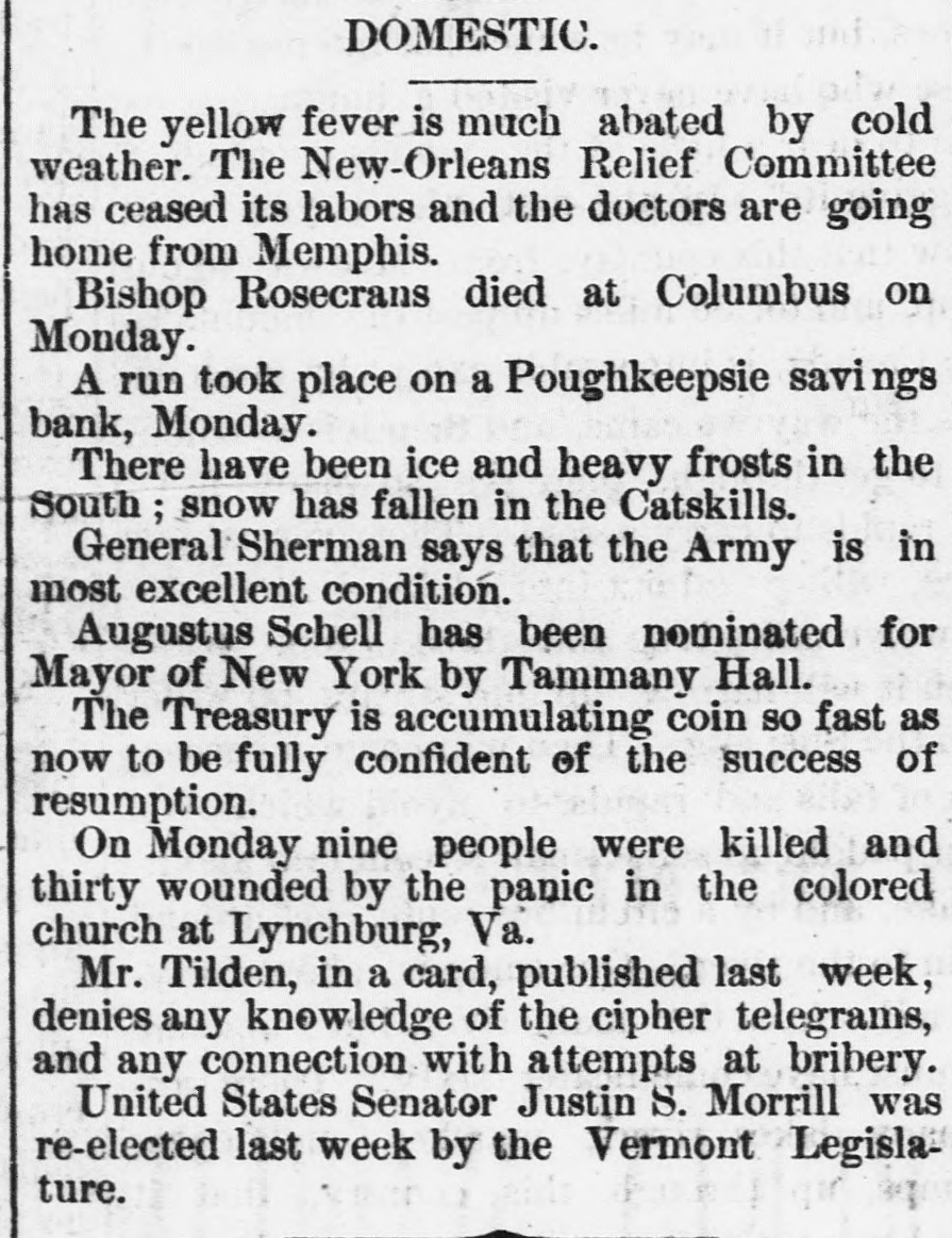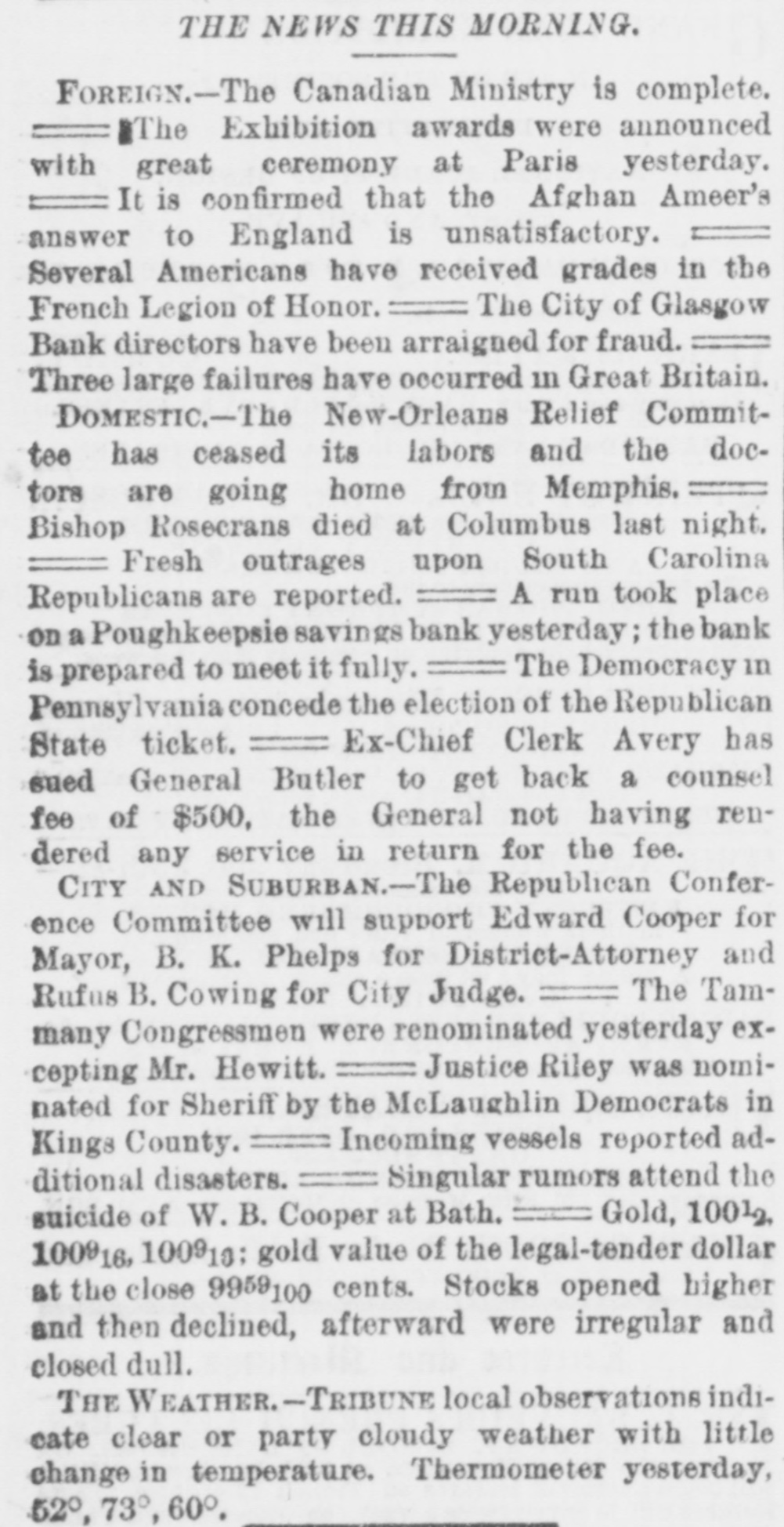THE NEWS THIS MORNING. FOREIGN.-The Canadian Ministry is complete. The Exhibition awards were announced with great ceremony at Paris yesterday. It is confirmed that the Afghan Ameer's answer to England is unsatisfactory. Several Americans have received grades in the The City of Glasgow French Legion of Honor. Bank directors have been arraigned for fraud. Three large failures have occurred in Great Britain. DOMESTIC.-The New-Orleans Relief Committee has ceased its labors and the doctors are going home from Memphis. Bishop Rosecrans died at Columbus last night. Fresh outrages upon South Carolina A run took place Republicans are reported. on a Poughkeepsie savings bank yesterday; the bank The Democracy in is prepared to meet it fully. Pennsylvania concede the election of the Republican ticket. Ex-Chief Clerk Avery has State sued General Butler to get back a counsel fee of $500, the General not having rendered any service in return for the fee. CITY AND SUBURBAN.-The Republican Conference Committee will support Edward Cooper for Mayor, B. K. Phelps for District-Attorney and The TamRufus B. Cowing for City Judge. many Congressmen were renominated yesterday excepting Mr. Hewitt. Justice Riley was nominated for Sheriff by the McLaughlin Democrats in Incoming vessels reported adKings County. ditional disasters. Singular rumors attend the Gold, 10012. suicide of W. B. Cooper at Bath. 100916, 10091s; gold value of the legal-tender dollar at the close 9959100 cents. Stocks opened higher and then declined, afterward were irregular and closed dull. THE WEATHER.-TRIBUNE local observations indicate clear or party cloudy weather with little change in temperature. Thermometer yesterday, 52°,73°,60°.