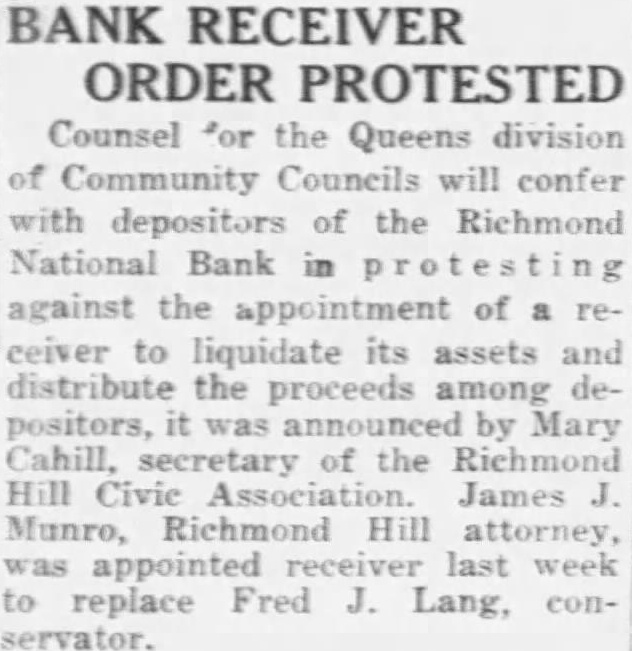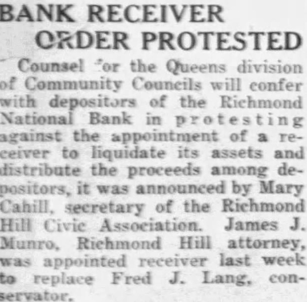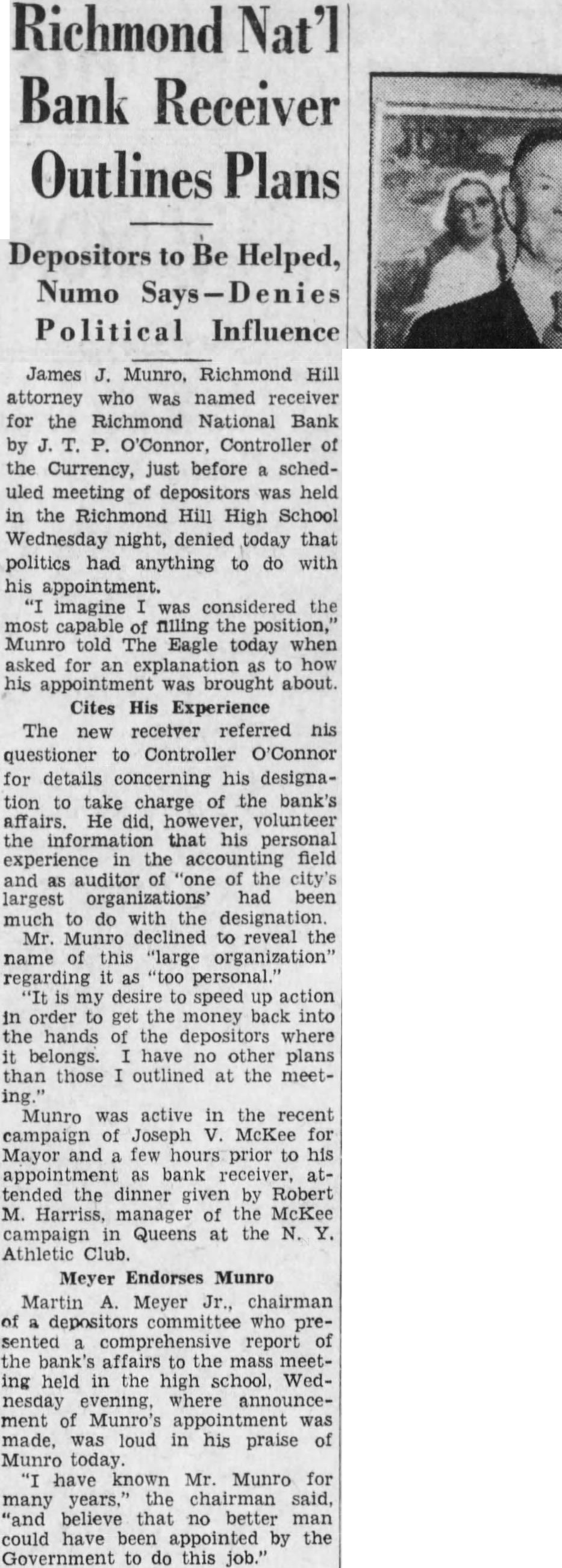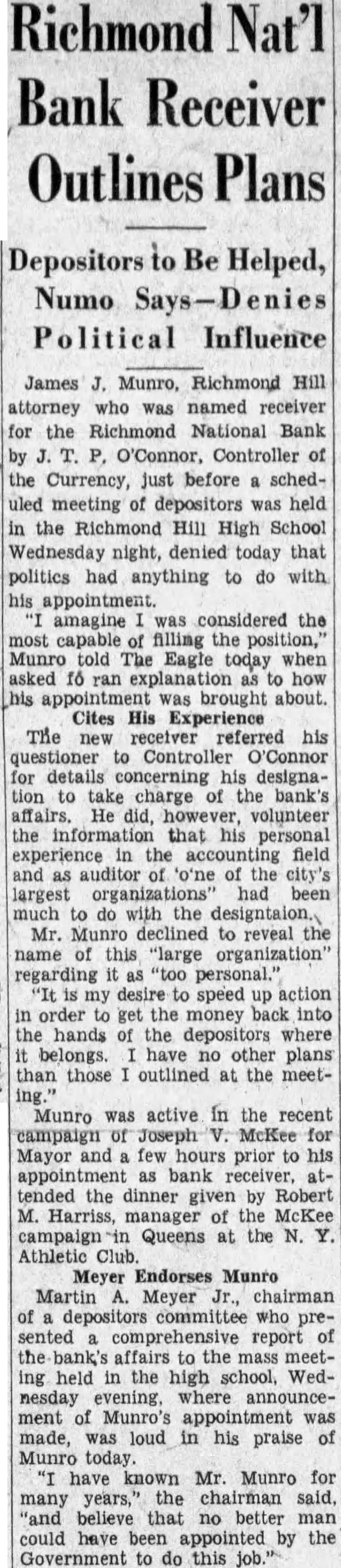 James Munro, Richmond Hill attorney who was named receiver for the Richmond National Bank by P. O'Connor, Controller of the Currency, just before scheduled meeting of depositors was held in the Richmond Hill High School Wednesday night, denied today that politics had anything to do with his appointment. imagine was considered the most capable filling the position," Munro told The Eagle today when asked for an explanation to how his appointment was brought about. Cites His Experience The new receiver referred his questioner to Controller O'Connor for details concerning his designation to take charge of the bank's affairs. He did, however, volunteer the information that his personal experience in the accounting field and auditor "one of the city's largest organizations' had been much do with the designation Munro declined to reveal the name this "large organization" regarding "too personal. my desire to speed up action in order to get the money back into the hands of the where belongs. have no other plans than those outlined at the meetMunro was active in the recent campaign of Joseph McKee for Mayor and few hours to his bank tended the dinner given by Robert M. Harriss, manager of the McKee campaign Queens at the Athletic Club. Meyer Endorses Munro Martin Meyer Jr., chairman of depositors committee who sented comprehensive report of the bank's affairs to the mass meeting held in the high school, Wednesday evening, where announcement of Munro's appointment made, was loud in his praise of Munro today. have known Mr. Munro for many years," the chairman said, "and believe that no better man could have been appointed by the Government to do this