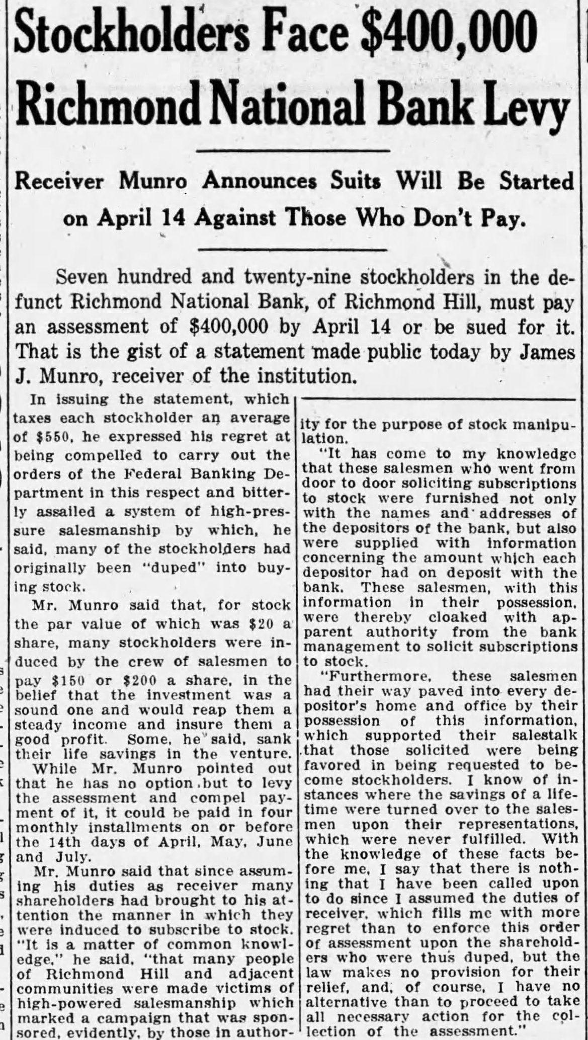 In issuing the statement, which taxes each stockholder an average of $550, expressed his regret at being compelled to carry out the orders of the Federal Banking Department this respect and bitterly assailed system by which, he said, many of the stockholders had originally been "duped" into buyMunro that, for stock the par value which was $20 share, many stockholders were induced by the crew of salesmen $200 share, in the belief that sound one and would reap them steady and them Mr. that he option to ment of could paid monthly installments before the days of April, June Munro that since assuming his tention the manner they matter common knowlpeople Hill adjacent which that sponsored, evidently. by those in author- for the purpose of stock manipulation. has come to knowledge that these salesmen door soliciting stock the the the but also were supplied amount which depositor on deposit These salesmen, information in their possession. thereby cloaked with parent from solicit subscriptions these salesmen had their paved into every positor's home and office by their salestalk that being being to come know of stances the savings time turned over the salesupon their never the bethat ing called the duties which fills me regret than enforce this order upon shareholdwho duped provision for their alternative than to take action for the collection assessment.