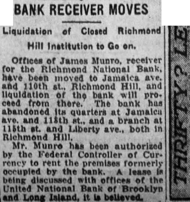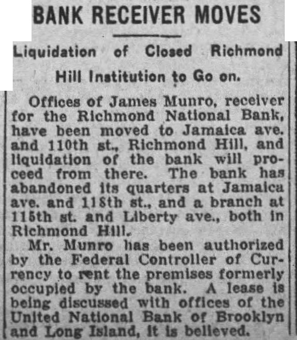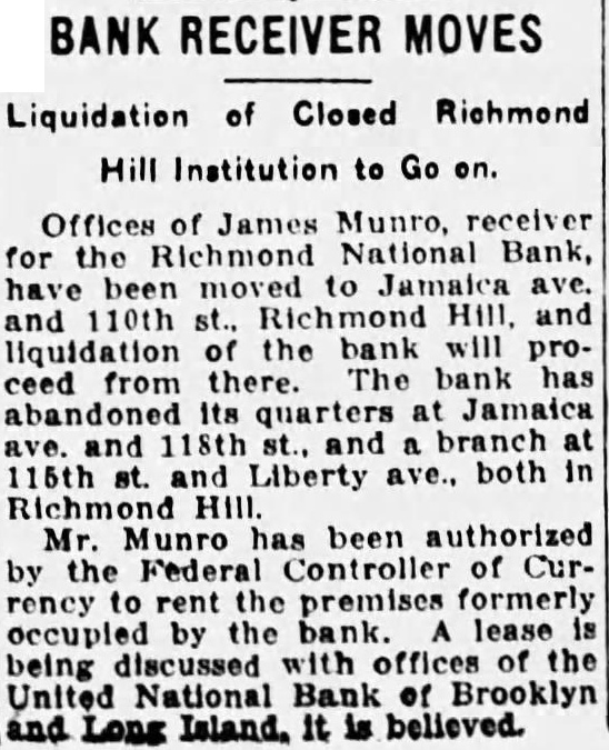 Offices James Munro, receiver for the Richmond National Bank, have been moved to Jamaica ave. and 110th st., Richmond Hill, and liquidation of the bank will proceed from there. The bank has abandoned its quarters at Jamaica and 118th st., and branch 115th Liberty ave., both in Richmond Hill. Mr. Munro has been authorized by the Federal Controller of Currency to rent the premises formerly occupied by the lease being discussed with offices of the United National Bank of Brooklyn and Long Island. it is believed.