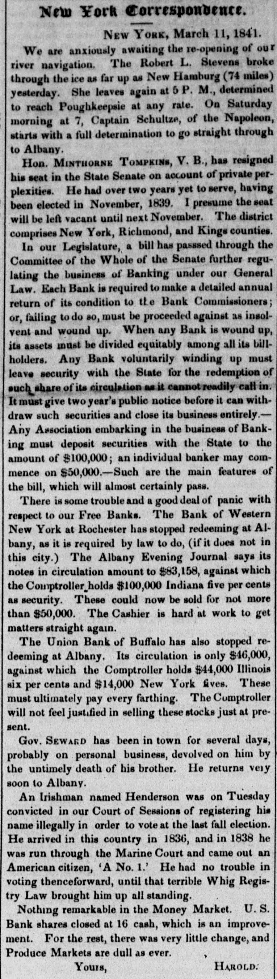 New York Correspondence. NEW YORK, March 11, 1841. We are anxiously awaiting the re-opening of our river navigation. The Robert L. Stevens broke through the ice as far up as New Hamburg (74 miles) yesterday. She leaves again at 5 P. M., determined to reach Poughkeepsie at any rate. On Saturday morning at 7, Captain Schultze, of the Napoleon, starts with a full determination to go straight through to Albany. Hon. MINTHORNE TOMPKINS, V. B., has resigned his seat in the State Senate on account of private perplexities. He had over two years yet to serve, having been elected in November, 1839. I presume the seat will be left vacant until next November. The district comprises New York, Richmond, and Kings counties. In our Legislature, a bill has passsed through the Committee of the Whole of the Senate further regulating the business of Banking under our General Law. Each Bank is required to make a detailed annual return of its condition to the Bank Commissioners; or, failing to do so, must be proceeded against as insolvent and wound up. When any Bank is wound up, its must be divided Bank up holders. assets Any voluntarily equitably winding among all its must billleave security with the State for the redemption of share of its circulation as it must two can It such give year's public notice cannot readily before it call with- in. draw such securities and close its business entirely.Any Association embarking in the business of Banking must deposit securities with the State to the amount of $100,000; an individual banker may commence on $50,000.-Such are the main features of the bill, which will almost certainly pass. There is some trouble and a good deal of panic with respect to our Free Banks. The Bank of Western New York at Rochester has stopped redeeming at Albany, as it is required by law to do, (if it does not in this city.) The Albany Evening Journal says its notes in circulation amount to $83,158, against which the Comptroller holds $100,000 Indiana five per cents as security. These could now be sold for not more than $50,000. The Cashier is hard at work to get matters straight again. The Union Bank of Buffalo has also stopped redeeming at Albany. Its circulation is only $46,000, against which the Comptroller holds $44,000 Illinois six per cents and $14,000 New York fives. These must ultimately pay every farthing. The Comptroller will not feel justified in selling these stocks just at present. Gov. SEWARD has been in town for several days, probably on personal business, devolved on him by the untimely death of his brother. He returns very soon to Albany. An Irishman named Henderson was on Tuesday convicted in our Court of Sessions of registering his name illegally in order to vote at the last fall election. He arrived in this country in 1836, and in 1838 he was run through the Marine Court and came out an American citizen, 'A No. 1.' He had no trouble in voting thenceforward, until that terrible Whig Registry Law brought him up all standing. Nothing remarkable in the Money Market. U.S. Bank shares closed at 16 cash, which is an improvement. For the rest, there was very little change, and Produce Markets are dull as ever. HAROLD: Yours,