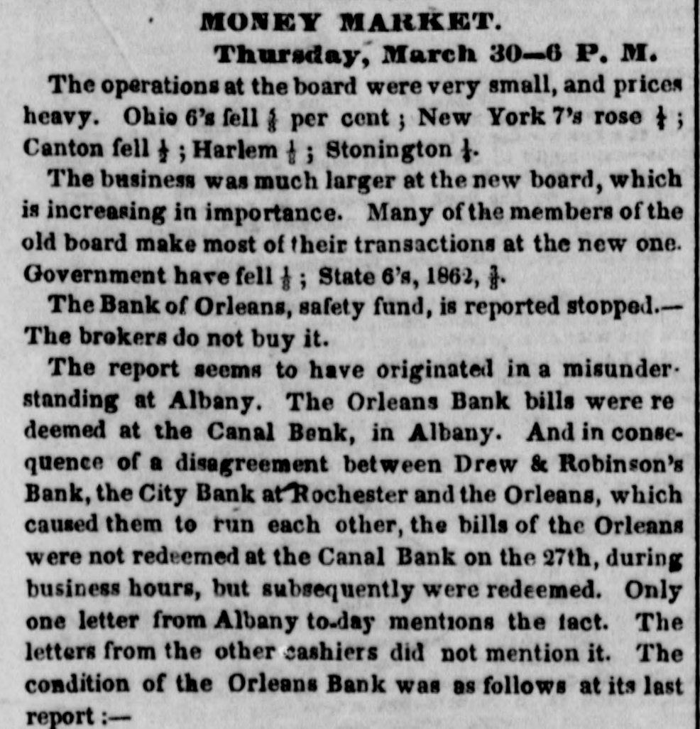 # MONEY MARKET. Thursday, March 30-6 P. M. The operations at the board were very small, and prices heavy. Ohio 6's fell ⅛ per cent; New York 7's rose ⅜; Canton fell ⅜; Harlem ⅜; Stonington ⅛. The business was much larger at the new board, which is increasing in importance. Many of the members of the old board make most of their transactions at the new one. Government have fell ⅛; State 6's, 1862, ⅜. The Bank of Orleans, safety fund, is reported stopped. The brokers do not buy it. The report seems to have originated in a misunderstanding at Albany. The Orleans Bank bills were redeemed at the Canal Bank, in Albany. And in consequence of a disagreement between Drew & Robinson's Bank, the City Bank at Rochester and the Orleans, which caused them to run each other, the bills of the Orleans were not redeemed at the Canal Bank on the 27th, during business hours, but subsequently were redeemed. Only one letter from Albany to-day mentions the fact. The letters from the other cashiers did not mention it. The condition of the Orleans Bank was as follows at its last report :-
