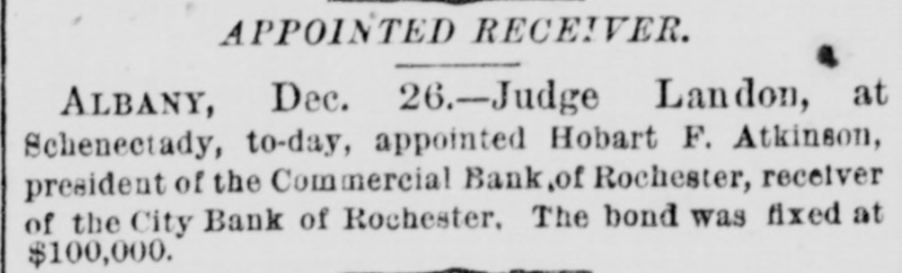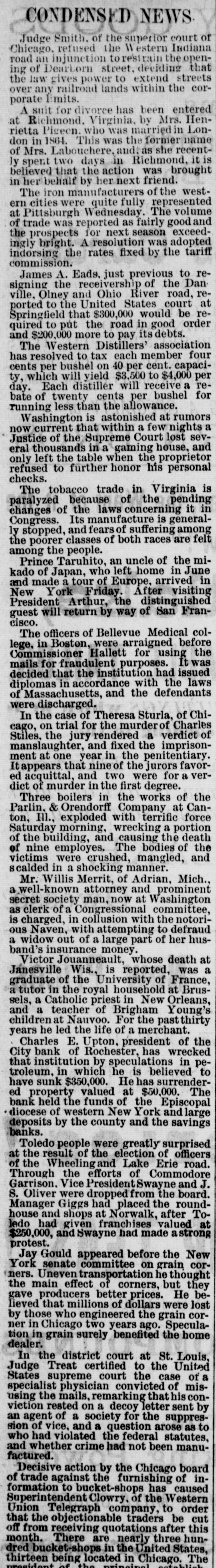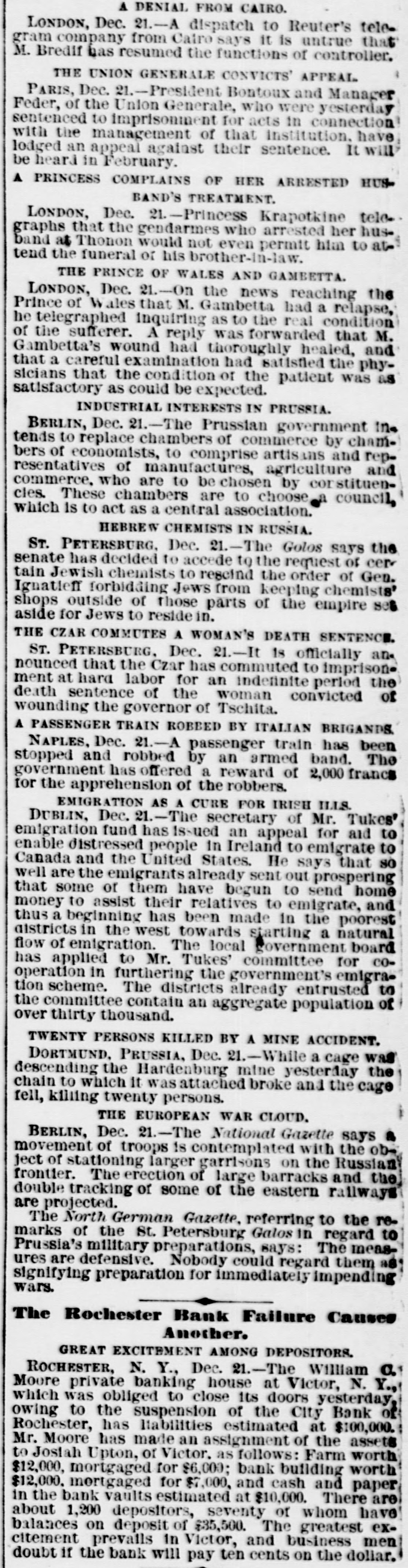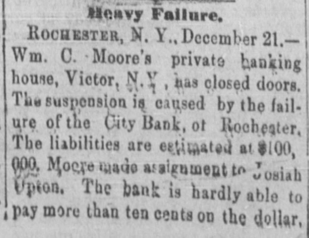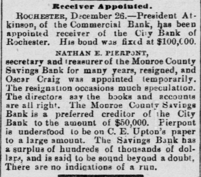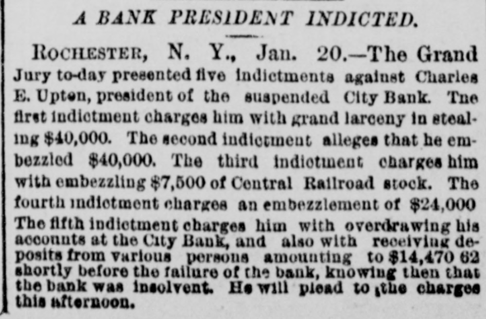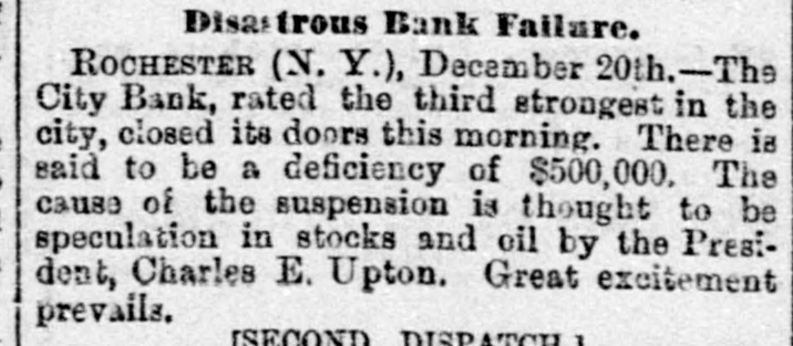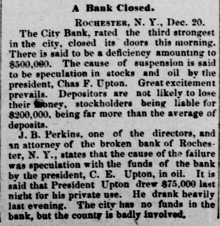 RUIN. GREASED The City Bank of Rochester, N.Y., Compelled to Close Its Doors. The Funds Used by Its Oil Truly Good President in Heavy Speculations. Something Like $330,000 Missing, Yet. and the Returns Not All in Great Indignation of the Losers by the Failure. 21 -The City bank, ROCHESTER, N. third Y., Dec. strongest in Rochester, The doas doors the yesterday morning. is said throughout the excitement people in closed Great ficiency rated its prevails to approximate of poor $500,000. city has the because of the interest No investigation suspended institution. cause of the failure, but taken place as claimed to the that Charles E. Upton, in oil stock speculations. used it president is freely of the bank, has lost heavily $350, and Investigation shows that with Upton which to carry oil his peculations 000 of the bank's money The bank held $500,in Upton paper. 000 on of deposits and the $800,000 Western New York bank. Episwas treasurer of and had its funds in had his large copal The small diocese, sa vings Upton. banks All of over the city the city the deposits with is inteuse and of increasing the bank and state one directors, excitement J B. Perkins, attorney makes the considered followi the bank of the "A month ago of the I failure was bank specu- by ment: sound The cause the funds of in the oil lately, speculated of President lation with C. E. Upton, to the amount barrels of 200,000 hundeal who dreds has of said, thousands for himself connected and a great with the a more bank. Two or three barrels, for he other parties weeks not ago there from was the heavy fall in prices. He took money after that bank to carry were formed been thrown out by of the City bank had bank, of New found the directors Exchange this. Immediately and that York the checks every- make owed We the commenced American investigationished We Upton he to thing in confusion. and he finally said of the value of a statement, and had property agreed to secure about $20,000 which he was indefinite as about bank His debt, and there mysel the amount $15,000, of the statement P. Ross and was the appar- Amer- went inthe equivocation. saw L the officers of us such ent to New Exchange York and bank They and advised gave us to what try ican formation as they could, through came and get back in money we money we with Sunday got in what furnish meeting tried and carry to Upton could ourselves At We to could execute ready var- and but We of money the directors Mr. Upto on Monday agreed at 10 the o clock, directors ious conveyances Tuesday morning to go on with the did to subscribe Mr Upton step strength then business, amount We met again in the thinking agreed not do that and it let good $100,000 would and out, it at was Mr. we or 3 keep the bank the afternoon, board that in his Upton then o'clock stated liabilities in to those the of bank the other then own Upton's name represented and $333,000 property, which $50,parties a mortgage on in some value between from the perhaps executed may $100,000. aggregate We the nderstand deposits that amount the Dou and made us that $100,000, and which, statement numbers to of paper, considered the bank bank holds account at face close value in round about Upto $800,000 we its the outside would have of had been not been compelled bank to is H.C. doors." of the directors the Continent of inental the hotel failure yesRoberts. fternoon. unexped He expected He there might terday Another altogether He was cause for at it, said institution. excepting that could President oil con- at 80 was of no on the barrels of ceive have been had a bought run 600,000 have sold $180,000, at $11. 11, but giv- he cent which profit of about per barrel, ing him to hold on for are about 84 still the latest said, margin good; the extent but of Mr. chose Upton Roberts quotations a he might Upton's knowing $1.20 would cents. decline while make This, he President thought the depositors, operations and oil the market, bePresident Upton' place in the run on the bank. which alarmed and it is learned him at From other large quantity that he is ton came had has taken sources however, made says "put" the accommod on that odations Mr. positive $1.30. $25, UpMr. Roberts, Mr. Upton bank did not tc a have larger has sum a than capital of that from his own The City bank without any will cir000 $200,000, or and is iabilities to its all of which, amount to thinks, about will be paid of in age. full. His culation. $30,000. Its $1,000,000 state bank, depositors other repu- Mr. Roberts Upton is about 50 been years good. Among the office of has always trust he holds Episcopal diocese all his possurer of the He has represent To-day a of New in his own dated April was Prefiled purportion he property positions tation property York was of Protestant to be name. sented to The his that 20, indig- 1882, wife deed the among Upon in which valued at $30,stockholders refuses and though nation depositorviewed, is and great Cashier found Barnard, No one the seems bank. in to be the hnow city, anything can not about ascertain be the the the books of names heaviest of yet the It to is impossible to Among Savings bank $50,000, 314,heavy are the Savings about $22,000. in a 000; Monroe Monroe county Upton will be learned and probable creditors County that East-Side treasurer was bauk, a arrested member of It is and Driving few Upton days. is a fast club, liver, the Rochester ntlemen' RochAssociation, of the the Rochester backers 1878 of the and club one club in in the ester held the fizzle the contest and Drivingase-Ball the Park rowing stakes and wherein to famous Court- decide 1879, Chautauqua boat apeated was in wed Washington Another bit be of of ney's had to be the $6,000 erally prize. known failure. will Last Upton's who owned history connect ection not general with the several the Rochester to bull handsomely winter interest he in was form one and railroad of enter a stock syndicate and realize bankers Hannibal to & St. by heavy Joe speculation.