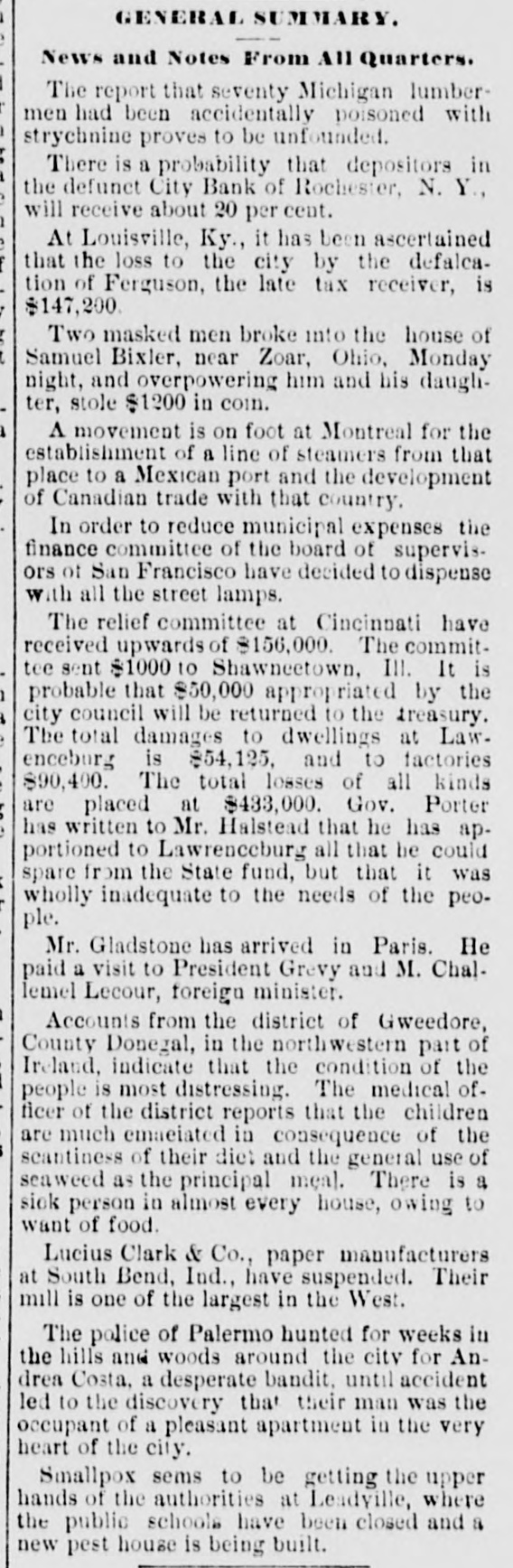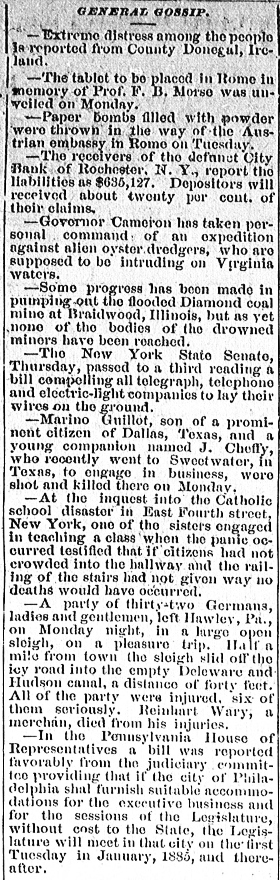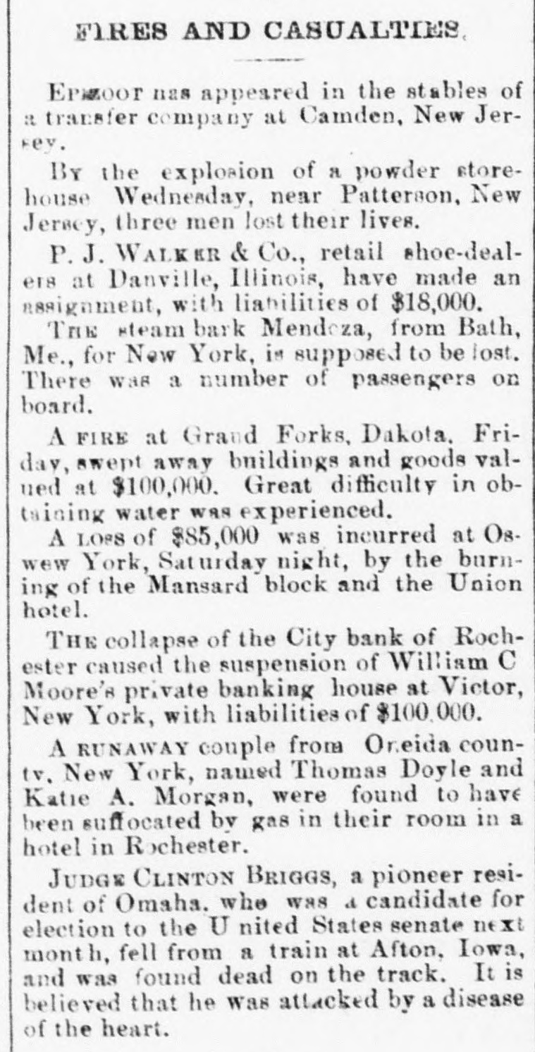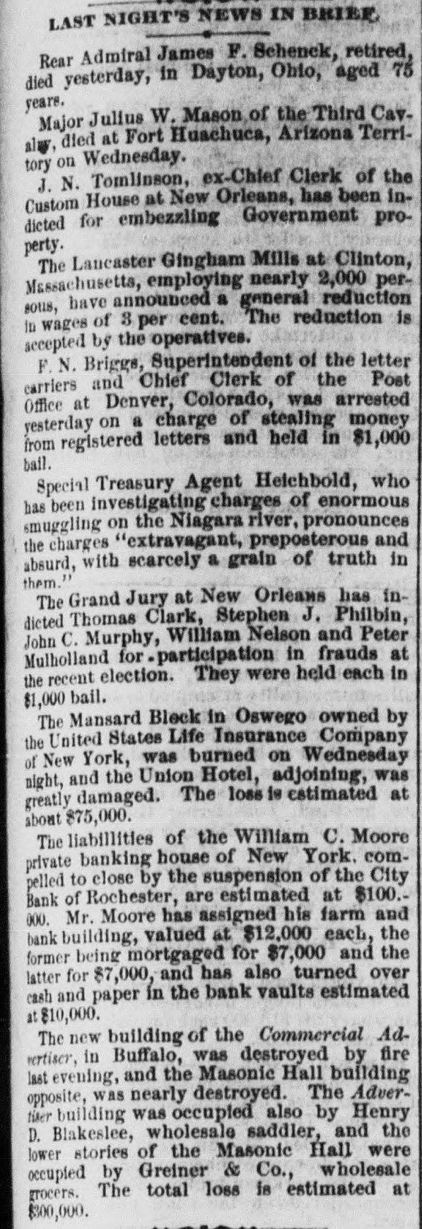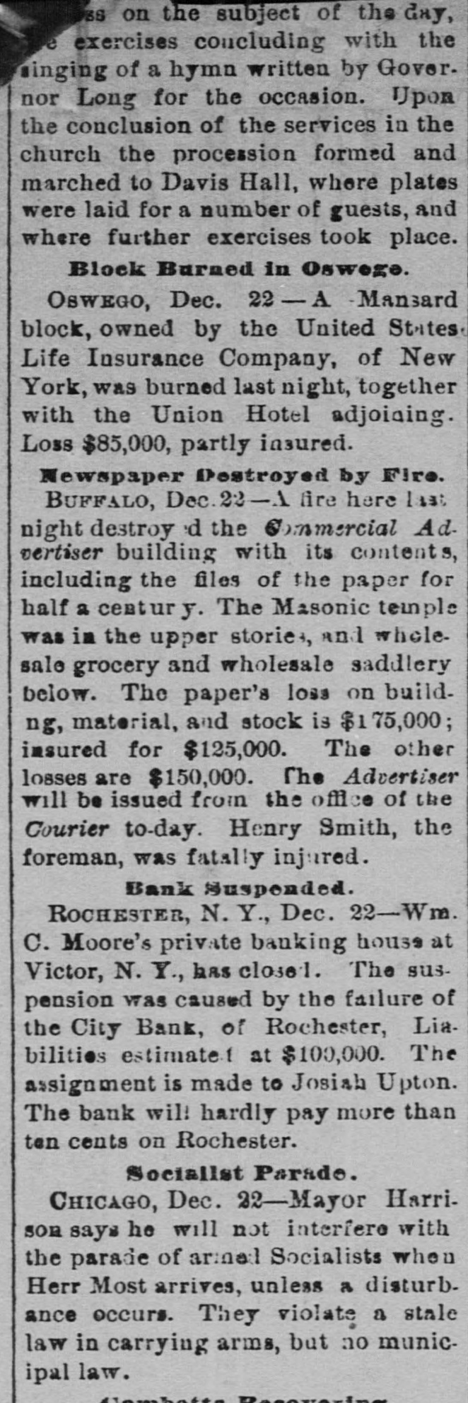 RUIN. GREASED The City Bank of Rochester, N.Y., Compelled to Close Its Doors. The Funds Used by Its Oil Truly Good President in Heavy Speculations. Something Like $330,000 Missing, Yet. and the Returns Not All in Great Indignation of the Losers by the Failure. 21 -The City bank, ROCHESTER, N. third Y., Dec. strongest in Rochester, The doas doors the yesterday morning. is said throughout the excitement people in closed Great ficiency rated its prevails to approximate of poor $500,000. city has the because of the interest No investigation suspended institution. cause of the failure, but taken place as claimed to the that Charles E. Upton, in oil stock speculations. used it president is freely of the bank, has lost heavily $350, and Investigation shows that with Upton which to carry oil his peculations 000 of the bank's money The bank held $500,in Upton paper. 000 on of deposits and the $800,000 Western New York bank. Episwas treasurer of and had its funds in had his large copal The small diocese, sa vings Upton. banks All of over the city the city the deposits with is inteuse and of increasing the bank and state one directors, excitement J B. Perkins, attorney makes the considered followi the bank of the "A month ago of the I failure was bank specu- by ment: sound The cause the funds of in the oil lately, speculated of President lation with C. E. Upton, to the amount barrels of 200,000 hundeal who dreds has of said, thousands for himself connected and a great with the a more bank. Two or three barrels, for he other parties weeks not ago there from was the heavy fall in prices. He took money after that bank to carry were formed been thrown out by of the City bank had bank, of New found the directors Exchange this. Immediately and that York the checks every- make owed We the commenced American investigationished We Upton he to thing in confusion. and he finally said of the value of a statement, and had property agreed to secure about $20,000 which he was indefinite as about bank His debt, and there mysel the amount $15,000, of the statement P. Ross and was the appar- Amer- went inthe equivocation. saw L the officers of us such ent to New Exchange York and bank They and advised gave us to what try ican formation as they could, through came and get back in money we money we with Sunday got in what furnish meeting tried and carry to Upton could ourselves At We to could execute ready var- and but We of money the directors Mr. Upto on Monday agreed at 10 the o clock, directors ious conveyances Tuesday morning to go on with the did to subscribe Mr Upton step strength then business, amount We met again in the thinking agreed not do that and it let good $100,000 would and out, it at was Mr. we or 3 keep the bank the afternoon, board that in his Upton then o'clock stated liabilities in to those the of bank the other then own Upton's name represented and $333,000 property, which $50,parties a mortgage on in some value between from the perhaps executed may $100,000. aggregate We the nderstand deposits that amount the Dou and made us that $100,000, and which, statement numbers to of paper, considered the bank bank holds account at face close value in round about Upto $800,000 we its the outside would have of had been not been compelled bank to is H.C. doors." of the directors the Continent of inental the hotel failure yesRoberts. fternoon. unexped He expected He there might terday Another altogether He was cause for at it, said institution. excepting that could President oil con- at 80 was of no on the barrels of ceive have been had a bought run 600,000 have sold $180,000, at $11. 11, but giv- he cent which profit of about per barrel, ing him to hold on for are about 84 still the latest said, margin good; the extent but of Mr. chose Upton Roberts quotations a he might Upton's knowing $1.20 would cents. decline while make This, he President thought the depositors, operations and oil the market, bePresident Upton' place in the run on the bank. which alarmed and it is learned him at From other large quantity that he is ton came had has taken sources however, made says "put" the accommod on that odations Mr. positive $1.30. $25, UpMr. Roberts, Mr. Upton bank did not tc a have larger has sum a than capital of that from his own The City bank without any will cir000 $200,000, or and is iabilities to its all of which, amount to thinks, about will be paid of in age. full. His culation. $30,000. Its $1,000,000 state bank, depositors other repu- Mr. Roberts Upton is about 50 been years good. Among the office of has always trust he holds Episcopal diocese all his possurer of the He has represent To-day a of New in his own dated April was Prefiled purportion he property positions tation property York was of Protestant to be name. sented to The his that 20, indig- 1882, wife deed the among Upon in which valued at $30,stockholders refuses and though nation depositorviewed, is and great Cashier found Barnard, No one the seems bank. in to be the hnow city, anything can not about ascertain be the the the books of names heaviest of yet the It to is impossible to Among Savings bank $50,000, 314,heavy are the Savings about $22,000. in a 000; Monroe Monroe county Upton will be learned and probable creditors County that East-Side treasurer was bauk, a arrested member of It is and Driving few Upton days. is a fast club, liver, the Rochester ntlemen' RochAssociation, of the the Rochester backers 1878 of the and club one club in in the ester held the fizzle the contest and Drivingase-Ball the Park rowing stakes and wherein to famous Court- decide 1879, Chautauqua boat apeated was in wed Washington Another bit be of of ney's had to be the $6,000 erally prize. known failure. will Last Upton's who owned history connect ection not general with the several the Rochester to bull handsomely winter interest he in was form one and railroad of enter a stock syndicate and realize bankers Hannibal to & St. by heavy Joe speculation.