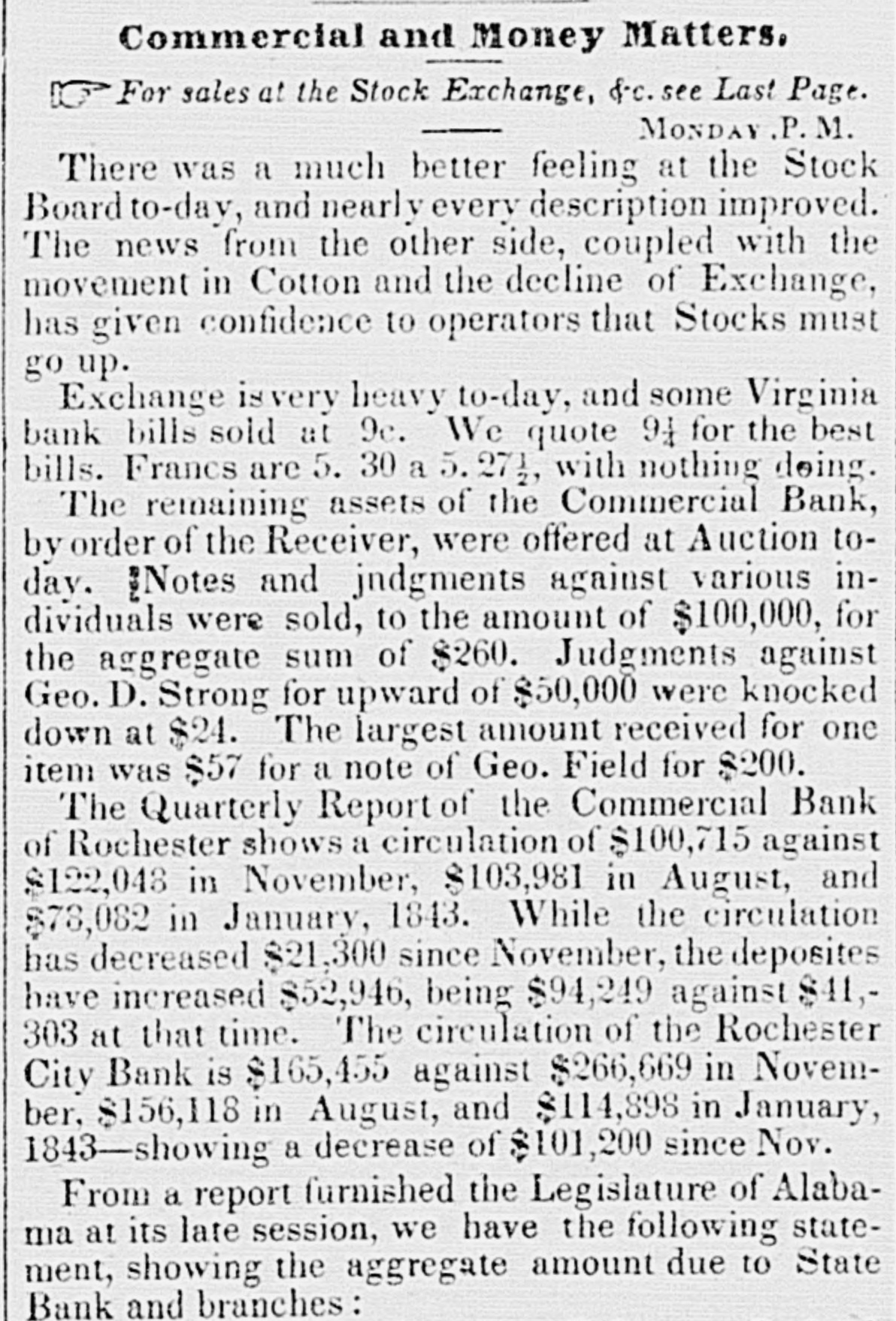 Commercial and Money Matters. For sales at the Stock Exchange, &.c. see Last Page. MONDAY P. M. There was a much better feeling at the Stock Board to-day, and nearly every description improved. The news from the other side, coupled with the movement in Cotton and the decline of Exchange, has given confidence to operators that Stocks must go up. Exchange is very heavy to-day, and some Virginia bank bills sold at 9c. We quote It for the best bills. Francs are 5. 30 a 5.271, with nothing doing. The remaining assets of the Commercial Bank, by order of the Receiver, were offered at Auction todav. [Notes and jndgments against various individuals were sold, to the amount of $100,000, for the aggregate sum of $260. Judgments against Geo. D. Strong for upward of $50,000 were knocked down at $24. The largest amount received for one item was $57 for a note of Geo. Field for $200. The Quarterly Report of the Commercial Bank of Rochester shows a circulation of $100,715 against $122,048 in November, $103,981 in August, and $78,082 in January, 1843. While the circulation has decreased $21,300 since November, the deposites have increased $52,946, being $94,249 against $41,303 at that time. The circulation of the Rochester City Bank is $165,455 against $266,669 in November, $156,118 in August, and $114,898 in January, 1843-showing a decrease of $101,200 since Nov. From a report furnished the Legislature of Alabama at its late session, we have the following statement, showing the aggregate amount due to State Bank and branches: