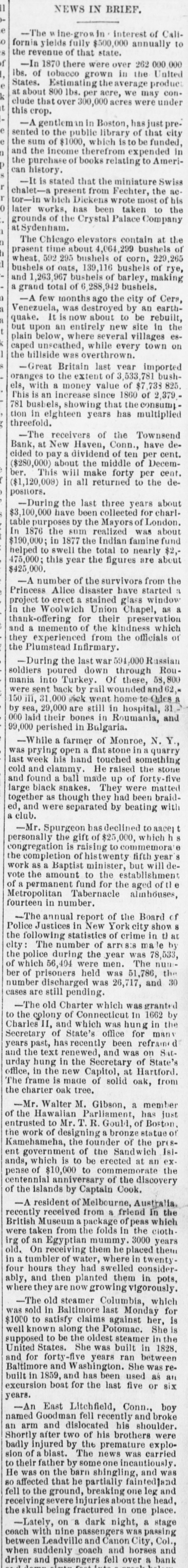 NEWS IN BRIEF. -The ine-gros in interest of Call. to fornia yields fully $500,000 annually the revenue of that state. f -In 1870 there were over 262 000 lbs. of tobacco grown in the United States. Estimating the average produc conat about 800 lbs. per acre, we may clude that over 300,000 acres were under this crop. A gentlem in Boston, has just sented to the public library of that funded, city the sum of $1000, which is to be in and the income therefrom expended Amerithe purchase of books relating to can history. -It is stated that the miniature Swiss chalet- present from Fechter, the of ac- his 0 tor-in which Dickens wrote most the later works, has been taken to grounds of the Crystal Palace Company at Sydenham. The Chicago elevators contain at the of time about 4,064, bushels I present 592 295 bushels of corn, 229,265 wheat, of oats, 139,116 bushels of rye, bushels and 1,263,967 bushels of barley, making a grand total of 6,288,945 bushels. -A few months ago the city of Cera, Venezuela, was destroyed by an rebuilt, earthIt is now about to be the quake. upon an entirely new site in esbut below, where several villages on caped plain unseathed, while every town the hillside was overthrown. Great Britain last year imported bushto the extent of 3,533,781 oranges with a money value of $7,733 825 2,379 els, an increase since 1860 of This busbels, is showing that the multiplied consumption 781 in eighteen years has threefold. The receivers of the Townsend have deat New Haven, Conn., Bank, to pay a dividend of ten per Decem- cent. cided about the middle of cent. ($280,000 This will make forty per the deber. ($1,120,009) in all returned to positors. During the last three years charl. about $3,100,000 have been colleeted for London. table purposes by the Mayors of about 1876 the sum realized famine was fund In in 1877 the Indian $190,000; to swell the total to nearly about $2,475,000; helped this year the figures are $425,000. number of the survivors started from the Alice disaster have window Princess to erect a stained glass as project in the Woolwich Union Chapel, preservation thank-offering for their kindness which memento of the officials of and they a experienced from the the Plumstead Infirmary. -During the last war 594,000 Russian Roupoured down through 58,800 soldiers into Turkey Of these, and 62 mania sent back by rail wounded te-Odes were 31,000 sick went home 150 iii, 29,000 are still in hospital, and 000 by sea, laid their bones in Roumania, 99,000 perished in Bulgaria. _While a farmer of Monroe, N. Y., prying open a flat stone in something quarry was his hand touched stone last week and clammy He raised the forty-five cold found a ball made up of matted and black snakes. They were braidlarge as though they had been with a club. ed, together and were separated by beating -Mr. Spurgeon the gift has of $25,000, declined which to aace] congregation personally is raising commemora'e fifth year the completion of histwenty will de as a Baptist minister, establishment but work the amount to the of vote permanent fund for the alinhouses, aged of Metropolitan Tabernacle fourteen in number. The annual report of the Board show of Justices in New York crime city in t) the Police following statistics of ma le by The number of arros:8 78,533, city: the police during the year was The nume 56,404 were men. the of which held was $1,786, 30 ber number of prisoners discharged was 26,717, and cases are still pending. -The old Charter which was granted In 1662 by of Connecticut in the Charles to the colony II, and which office was hung for many Secretary of State's recently been refrainic years past, text has renewed, and was of on State's Satand the hung in the Secretary at Hartford. urday in the new Capitol, oak, from office, The frame is made tree. of solid the charter oak Mr. Walter M. Gibson, a has member just of the Hawalian Mr. T. Parliament R. Gould, of statue Boston. of entrusted work of to designing a bronze of the presKamehameha, the the of founder the Sandwich 181ent government which is to be commemorate erected at an the ands, pense of $10,000 anniversary to of the discovery centennial of the islands by Captain Cook. resident of Melbourne, friend Australia. In the recently -A received package from a of peas which were taken British Museum from the folds in 3000 the cloth years irg of an Egyptian them mummy he placed them old. On receiving of water, where in twentyin a tumbler had swelled considerfour hours they planted them in pots, ably, and they then are now growing vigorously. which where steamer Columbia, for The old last Monday was sold satisfy in Baltimore claims against her, She is is $1000 to along the Potomac. the well known be the oldest steamer in 1828. supposed to She was built in United States. forty-flv years ran She between was and for and Washington. an Baltimore and has been used as six excursion built in 1859, boat for the last five or years. East Litchfield, Conn., and broke boy -An Goodm fell recently his shoulder. named dislocated were an arm after and two of his brothers exploShortly badly injured by The the news premature incautiously was carried sion of father blast. by some one and was affected to their the barn shingling, intedland one breaking He was on that he partially leg and the fell 80 to the severe ground, injuries about one the place. head, dark receiving skull being fractured night, in a stage coach _Lately, with Leadville nine on a passengers warty and Canon and horses passing Col., and and driver between when suddenly passengers coach fell over a bank