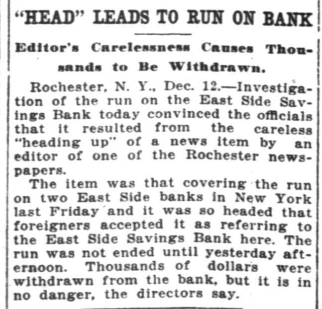 "HEAD" LEADS TO RUN ON BANK Editor's Carelessness Causes Thousands to Be Withdrawn. Rochester, N. Y., Dec. 12.-Investigation of the run on the East Side Savings Bank today convinced the officials that it resulted from the careless "heading up" of a news item by an editor of one of the Rochester newspapers. The item was that covering the run on two East Side banks in New York last Friday and it was so headed that foreigners accepted it as referring to the East Side Savings Bank here. The run was not ended until yesterday afternoon. Thousands of dollars were withdrawn from the bank, but it is in no danger, the directors say.