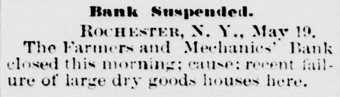 Bank Suspended. ROCHESTER, N. Y., May 19. The Farmers and Mechanics' Bank closed this morning: cause: recent failure of large dry goods houses here.
