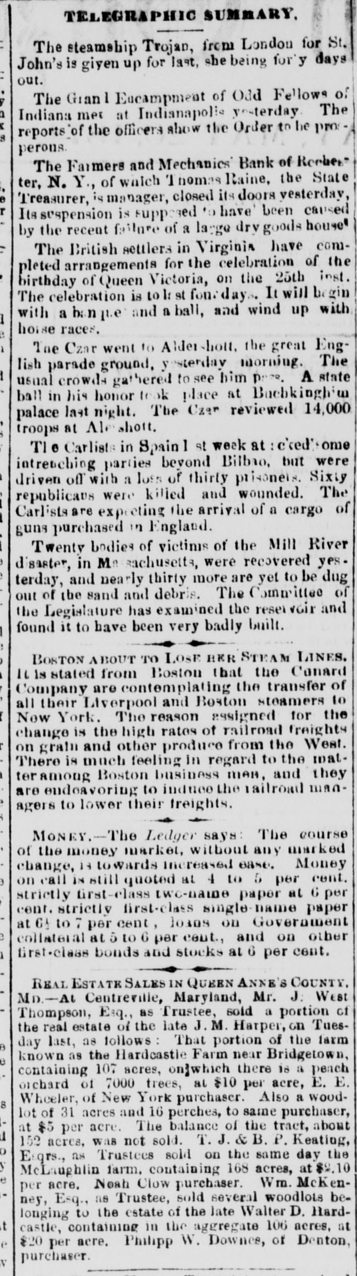 TEL EGRAPHIC SUMMARY. The steamship Trojan, from London for St. John's is giyen up for last, she being for'y days out. The Gran Eucampment of Oad Fellows of Indiana met at Indianapolis yesterday The reports of the officers show the Order to be prosperous The Farmers and Mechanics Bank of Reches ter, N. Y., of which Thomas Raine, the State is closed its e r is to have Treasurer, Its sespension manager, supposed doors been yesterday, caused by the recent failure of a large dry goods house* The British settlers in Virginia have completed arrangements for the celebration of the birthday of Queen Victoria, on the 25th inst. The celebration is to last fou. day. It will begin with a ban and a ball, and wind up with 1 hoise races. e 1 to Alder-holl, the great Engyesterday lish The parade Czar ground, went morning. The I usual crowds gathered to see him pase. A state ball in his honor to place at Bachkingbiw palace last night. The Czer reviewed 14,000 troops at Ale shott. T1 e Carlists in Spain st week at c'sed's ome intreuching parties beyond Bilbao, but were driven off with a loss of thirty prisonets. Sixty republicats were killed and wounded. The Carlists are expecting the arrival of a cargo of guns purchased in England. Twenty bodies of victims of the Mill River d'saster, in M sachusetts, were recovered yes. terday, and nearly thirty more are yet to be dug out of the sand and debris. The Committee of the Legislature has examined the reservoir and found it to have been very badly built. BOSTON ABOUT TO LOSE HKR STEAM LINES. It is stated from Boston that the Canard Company are contemplating the transfer of Liverpool and Boston steamers to The reason all New their York. assigned railroad freights for the change is the high rates of and other produce from the in to on There grain is much feeling regard and the West. they matteramong Boston business men, are endoavoring to induce the railroad managers to lower their freights. MONEY.-The Ledger says: The course of the money market, without any marked change, 13 towards increased ease. Money 3 on call is still quoted at 4 to 5 per cent. strictly first-class two-naine paper at per cent. strictly first-class single-name paper at 61 to per cent, loves on Government e collateral at 5 to 6 per cent., and on other first-class bonds and stocks at 6 per cent. REAL ESTATE SALES IN QUEEN ANNE'S COUNTY, MD.-At Centreville, Maryland, Mr. J. West Thompson, Esq., as Trustee, sold a portion of the real estate of the late J. M. Harper, on Tues8 day last, as follows : That portion of the farm known as the Hardcastle Farm near Bridgetown, e containing 107 acres, onjwhich there is a peach orchard of 7000 trees, at $10 per acre, E. E. Wheeler, of New York purchaser. Also a woodS lot of 31 acres and 16 perches, to same purchaser, at $5 per acre. The balance of the tract, about il 152 acres, was not sold. T. J. & B. P. Keating, o Eaqrs., as Trustees sold on the same day the y McLaughlin farm. containing 168 acres, at $9.10 e per acre. Noah Clow purchaser. Wm. McKenney, Esq., as Trustee, sold several woodlots belonging to the estate of the late Walter D. Hardit castle, containing in the aggregate 106 acres, at e $20 per acre. Philipp W. Downce, of Denton, purchaser.