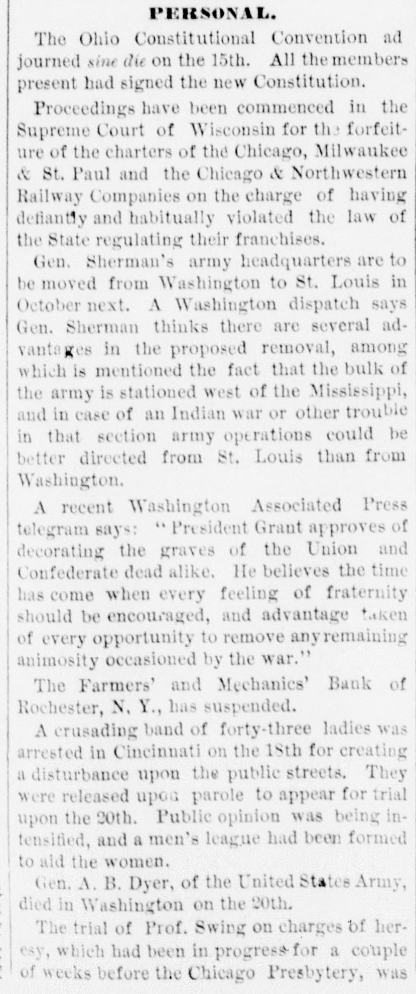 PERSONAL. The Ohio Constitutional Convention ad journed sine die on the 15th. All the members present had signed the new Constitution. Proceedings have been commenced in the Supreme Court of Wisconsin for the forfeiture of the charters of the Chicago, Milwaukee & St. Paul and the Chicago & Northwestern Railway Companies on the charge of having defiantly and habitually violated the law of the State regulating their franchises. Gen. Sherman's army headquarters are to be moved from Washington to St. Louis in October next. A Washington dispatch says Gen. Sherman thinks there are several advanta ges in the proposed removal, among which is mentioned the fact that the bulk of the army is stationed west of the Mississippi, and in case of an Indian war or other trouble in that section army operations could be better directed from St. Louis than from Washington. A recent Washington Associated Press telegram says: President Grant approves of decorating the graves of the Union and Confederate dead alike. He believes the time has come when every feeling of fraternity should be encouraged, and advantage taken of every opportunity to remove anyremaining animosity occasioned by the war." The Farmers' and Mechanics' Bank of Rochester, N. Y., has suspended. A crusading band of forty-three ladies was arrested in Cincinnati on the 18th for creating a disturbance upon the public streets. They were released upon parole to appear for trial upon the 20th. Public opinion was being intensified, and a men's league had been formed to aid the women. Gen. A. B. Dyer, of the United States Army, died in Washington on the 20th. The trial of Prof. Swing on charges of heresy, which had been in progress for a couple of weeks before the Chicago Presbytery, was
