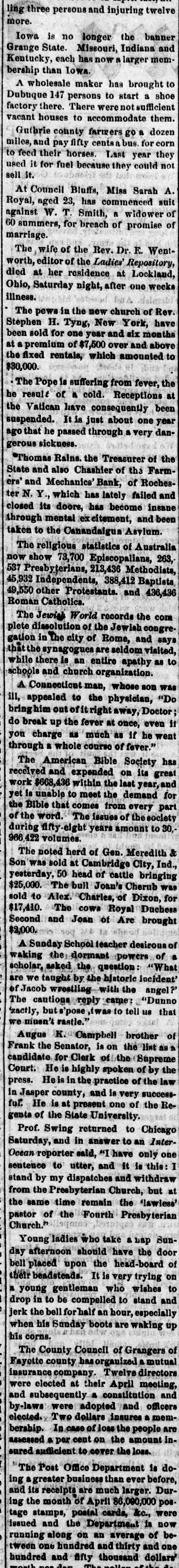 ling three persons and injuring twelve more. is no longer the banner Iowa State. Missouri, Indiana Kentucky, Grange each has now larger bership than Iowa. A wholesale maker has brought a shoe Dubuque 147 persons to start sufficient there. There were not them. factory vacant houses to accommodate dozen Guthrie county farmers go miles, and pay fifty centsabus for they feed their horses. Last year sell it. used to it for fuel because they could At Council Bluffs, Miss Sarah Royal, aged 23, has commenced W. T. Smith, a widower 60 against summers, for breach of promise marriage. The wife of the Rev. Dr E. Wentworth, editor of the Ladies' Repository, died at her residence at Lockland, Ohio, Saturday night, after one weeks illness. The pews in the new church of have Rev. H. Tyng, New York, months Stephen sold for one year and six above at been premium of $7,500 over and the a fixed rentals, which amounted $30,000. The Pope is suffering from fever, the result of a cold. Receptions been he the Vatican have consequently suspended. It is just about one dan- year ago that he passed through a very gerous sickness. Thomas Rains. the Treasurer of the State and also Chashier of the Farmers and Mechanics' Bank, of Rochester N. Y. which has lately failed and closed its doors, has become insane been through mental excitement, and taken to the Canandaigua Asylum. The religious statistics of Australia show 73,700 Episcopalians, 263, 537 now Presbyterians, 213,436 Methodists, 45,932 Independents, 388,412 Baptists 49,550 other Protestants. and 436,436 Roman Catholics. The Jewish World records the com plete dissolution of the Jewish congregation in The city of Rome, and says that the synagogues are seldom visited, while there is an entire apathy as schools and church organization. A Connecticut man, whose son appealed to the physician, "Do out of right away, the fever at once, ill, bringhim do break up Doctor; even you charge as much as if he went through a whole course of fever." The American Bible Society has and expended on its great within the last work received $668,436 demand year,and for yet is unable to meet the the Bible that comes from every part of the word. The issues of the society during fifty eight years amount to 30, 966,422 volumes. The noted herd of Gen. Meredith sold at Cambridge 50 head of cattle Son yesterday, was Cherub City, bringing Ind., was $25,000. The bull Joan's sold to Alex. Charles, of Dixon, $17,410. The cows Royal Duchess Second and Joan of Are brought $2,000. A Sunday School teacher desirous the dormant powers of asked the question by the scholar, are waking we taught historic incident' "What of Jacob wrestling with the angel? The cautions reply came: "Dunno that zactly, but 'pose , was to tell us we miuen't rastle. Augus K. Campbell brother of Frank the Senator, is on the list candidate for Clerk of the Supreme Court. He is highly spoken of by the press. Heis in the practice of the law in Jasper county, and is very successful. He is at present one of the Regents of the State University. Prof. Swing returned to Chicago Saturday, and in answer to an InterOcean reporter said, "I have only one sentence to utter, and it is this stand by my dispatches and withdraw from the Presbyterian Church, but the same time remain the 'lawless' pastor of the Fourth Presbyterian Church." Young ladies who take a Lap Sunafternoon should have day head-board the door bell placed upon the It is very gentleman who a their young beadsteads. wishes trying and drop in to be compelled to stand jerk the bell for half an hour, especially when his Sunday boots are waking up his corns. The County Council of Grangers Fayette county has organized mutual insurance company. Twelve directors were elected at their April meeting, and subsequently a constitution and by-laws were adopted and officers elected. Two dollars insures a membersbip. In case of loss the people assessed a per cent on the amount sured sufficient to cover the loss. Post Office Department is doing "The a greater business than ever before, and its receipts are much larger. During the month of April 86,000,000 postage stamps, postal cards, &c., were issued and the Department is now on an average one hundred and running tween along thirty and dollars' of one behundred and fifty thousand The moller