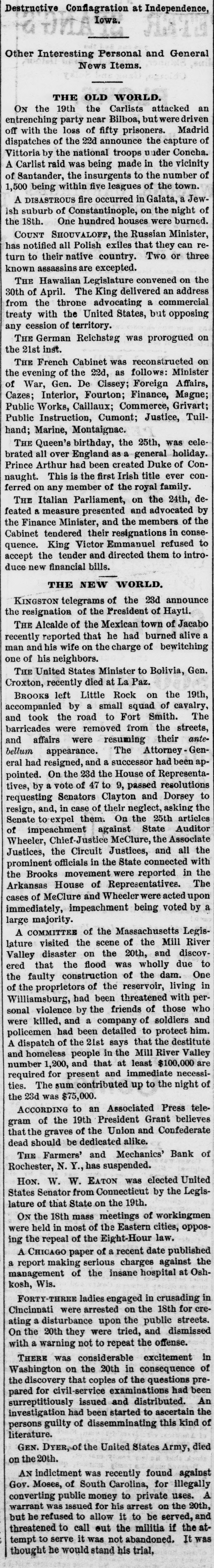Destructive Conflagration at Independence, Iowa. Other Interesting Personal and General News Items. THE OLD WORLD. the 19th the Carlists attacked an entrenching ON party near Bilboa, but were driven Madrid off with the loss of fifty prisoners. of dispatches of the 22d announce the capture Vittoria by the national troops under Concha. A Carlist raid was being made in the vicinity of of Santander, the insurgents to the number 1,500 being within five leagues of the town. A DISASTROUS fire occurred in Galata, a Jewsuburb of Constantinople, on the night of ish the 18th. One hundred houses were burned. COUNT SHOUVALOFF, the Russian Minister, renotified all Polish exiles that they can three has turn to their native country. Two or known assassins are excepted. THE Hawaiian Legislature convened on the of April. The King delivered an address 30th from the throne advocating a commercial treaty with the United States, but opposing any cession of territory. THE German Reichstag was prorogued on the 21st inst. THE French Cabinet was reconstructed on evening of the 22d, as follows: Minister Affairs, the War, Gen. De Cissey; Foreign Interior, Fourton; Caillaux; Commerce, Tuilof Cazes; Public Works, Finance, Justice, Grivart; Magne; Public Instruction, Cumont; hand; Marine, Montaignac. THE Queen's birthday, the 25th, was celebrated all over England as a general holiday. ConPrince Arthur had been created Duke of connaught. This is the first Irish title ever ferred on any member of the royal family. Italian Parliament, on the deTHE advocated 24th, a measure presented and the by feated the Finance Minister, and the members conse- of Cabinet tendered their resignations in to King Victor Emmanuel refused introaccept quence. the tender and directed them to duce new financial bills. THE NEW WORLD. KINGSTON telegrams of the 23d announce the resignation of the President of Hayti. THE Alcalde of the Mexican town of Jacabo alive reported that he had burned a recently man and his wife on the charge of bewitching one of his neighbors. THE United States Minister to Bolivia, Gen. Croxton, recently died at La Paz. BROOKS left Little Rock on the 19th, accompanied by a small squad of cavalry, The took the road to Fort Smith. and barricades were removed from the streets, anteand affairs were resuming their bellum appearance. The Attorney- been ap eral had resigned, and a successor had pointed. On the 23d the House of Representa- resolutions tives, by a vote of 47 to 9, passed to requesting Senators Clayton and Dorsey the and, in case of their neglect, asking articles resign, Senate to expel them. On the 25th Auditor impeachment against State Associate of Wheeler, Chief-Justice McClure, the all the Justices, the Circuit Justices, and with prominent officials in the State connected in the Brooks movement were reported The the Arkansas House of Representatives. of MeClure and Wheeler were acted upon cases immediately, impeachment being voted by a large majority. COMMITTEE of the Massachusetts Legis- River A visited the scene of the Mill lature disaster on the 20th, and discovthe flood was wholly construction of the ered the Valley faulty that dam. living due One in to of of the reservoir, had been violence by the friends of sonal Williamsburg, the proprietors threatened soldiers those with who per- and and a company of were had been detailed to of the 21st says policemen dispatch killed, that the protect destitute Valley him. A homeless people in the Mill River are and number 1,200, and that at least $100,000 necessifor present and immediate of required ties. The sum contributed up to the night the 23d was $75,000. to an Associated Press believes teleACCORDING of the 19th President Grant gram that the graves of the Union and Confederate dead should be dedicated alike. THE Farmers' and Mechanics' Bank of Rochester, N. Y., has suspended. HON. W. W. EATON was elected United States Senator from Connecticut by the Legislature of that State on the 19th. ON the 18th mass meetings of workingmen held in most of the Eastern cities, opposwere ing the repeal of the Eight-Hour law. CHICAGO paper of a recent date published the A making serious charges against Osha management report of the insane hospital at kosh, Wis. FORTY-THREE ladies engaged in crusading for cre- in Cincinnati were arrested on the 18th streets. ating a disturbance upon the public dismissed On the 20th they were tried, and with a warning not to repeat the offense. in THERE was considerable excitement Washington on the 20th in consequence of discovery that copies of the questions had been prethe for civil-service examinations An pared surreptitiously issued and distributed. investigation had been started to ascertain kind the of persons guilty of dissemminating this literature. GEN. DYER, of the United States Army, died on the 20th. AN indictment was recently found against Gov. Moses, of South Carolina, for illegally A public money to private uses. 20th, was issued for his arrest on warrant converting but he served, the refused to allow it to be and atthreatened to call out the militia if the tempt to serve it was not abandoned. was thought he would stand his trial.