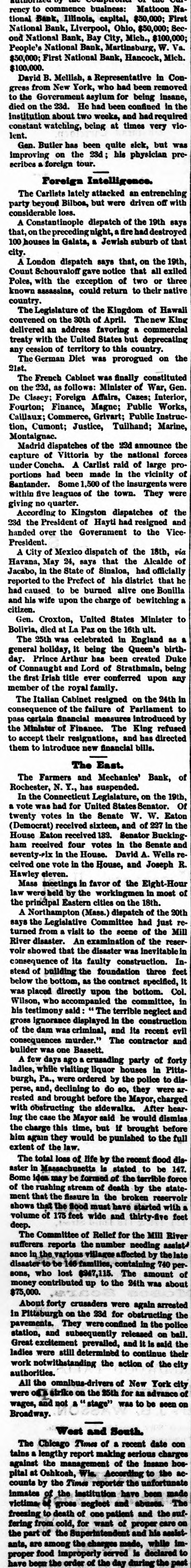 rency to commence business: Mattoon National Bank, Illinois, capital, $50,000; First National Bank, Liverpool, Ohio, $50,000; Second National Bank, Bay City, Mich., $100,000; People's National Bank, Martinsburg, W. Va. $50,000; First National Bank, Hancock, Mich. $100,000. David B. Mellish, a Representative in Congress from New York, who had been removed to the Government asylum for being insane, died on the 23d. He had been confined in the institution about two weeks, and had required constant watching, being at times very violent. Gen. Butler has been quite sick, but was improving on the 23d; his physician prescribes a foreign tour. Foreign Intelligence. The Carlists lately attacked an entrenching party beyond Bilboa, but were driven off with considerable loss. A Constantinople dispatch of the 19th says that, on the preceding nig fire had destroyed 100 houses in Galata, a Jewish suburb of that city. A London dispatch says that, on the 19th, Count Schouvaloff gave notice that all exiled Poles, with the exception of two or three known assassins, could return to their native country. The Legislature of the Kingdom of Hawaii convened on the 30th of April. Thenew King delivered an address favoring a commercial treaty with the United States but deprecating any cession of territory to this country. The German Diet was prorogued on the 21st. The French Cabinet was finally constituted on the 22d, as follows: Minister of War, Gen. De Clasey; Foreign Affairs, Cazes; Interior, Fourton; Finance, Magne; Public Works, Caillaux; Commerce, Grivart; Public Instruction, Cumont; Justice, Tuilhand; Marine, Montaignac. Madrid dispatches of the 22d announce the capture of Vittoria by the national forces under Concha. A Carlist raid of large proportions had been made in the vicinity of Santander. Some 1,500 of the insurgents were within five leagues of the town. They were giving no quarter. According to Kingston dispatches of the 23d the President of Hayti had resigned and handed over the Government to the VicePresident. A City of Mexico dispatch of the 18th, via Havana, May 24, says that the Alcalde of Jacabo, in the State of Sinaloa, had officially reported to the Prefect of his district that he had caused to be burned alive one Bonilla and his wife upon the charge of bewitching a citizen. Gen. Croxton, United States Minister to Bolivia, died at La Paz on the 16th ult. The 25th was celebrated in England as a general holiday, it being the Queen's birthday. Prince Arthur has been created Duke of Connaught and Lord of Strathmain, being the first Irish title ever conferred upon any member of the royal family. The Italian Cabinet resigned on the 24th in consequence of the failure of Parliament to pass certain financial measures introduced by the Minister of Finance. The King refused to accept their resignations, and has directed them to introduce new financial bills. The East. The Farmers and Mechanics' Bank, of Rochester, N. Y., has suspended. In the Connecticut Legislature, on the 19th, a vote was had for United States Senator. Of twenty votes in the Senate W. W. Eaton (Democrat) received sixteen, and of 227 in the House Eaton received 132. Senator Bucking. ham received four votes in the Senate and seventy-six in the House. David A. Wells received one vote in the House, and Joseph R. Hawley eleven. Mass meetings in favor of the Eight-Hour law held by the workingmen in most of the principal Eastern cities on the 18th. A Northampton (Mass.) dispatch of the 20th says the Legislative Committee had just returned from a visit to the scene of the Mill River disaster. An examination of the reservoir showed that the disaster was inevitable in consequence of its faulty construction. Instead of building the foundation three feet below the bottom, as the contract specified, it was placed directly upon the bottom. Col. Wilson, who accompanied the committee, in his testimony said The terrible neglect and gross ignorance displayed in the construction of the dam was criminal, and its recent evil consequences murder." The contractor and builder was one Bassett. A few days ago a crusading party of forty ladies, while visiting liquor houses in Pittsburgh, Pa., were ordered by the police to disperse, and, declining to do so, they were arrested and brought before the Mayor, charged with obstructing the sidewalks. After hearing the case the Mayor said be would dismiss the charge this time, but if brought before him again they would be punished to the full extent of the law. The total loss of life by the recent flood disaster in Massachusetts is stated to be 147. Some idea may be formed of the terrible force of the rushing stream of death by the statement that the fissure in the broken reservoir shows that the flood must have started with a volume of 175 feet wide and thirty-five feet deep. The Committee of Relief for the Mill River sufferers reports the number needing assist ance in the various villages affected by the late disaster to be 46 families, containing 740 persons, who lost $247,115. The amount of money contributed up to the 24th was about $75,000. About forty crusaders were again arrested in Pittsburgh on the 23d for obstructing the pavements. They confined in the police station, and subsequently released on bail. Great excitement prevailed, and it is said the ladies were still determined to continue their work notwithstanding the action of the city authorities. All the omnibus-drivers of New York city were strike on the 25th for an advance of wages, and not a "stage" was to be seen on Broadway. West and South. The Chicago Times of a recent date con tains a lengthy report making serious charges against the management of the insane hospital at Oshkosh, Wis. According to the accounts by the Times reporter the unfortunate inmates of the institution have been made victims of gross neglect and abuses. The freezing to death of one patient and the suffering from cold, for want of proper care on the part of the Superintendent an