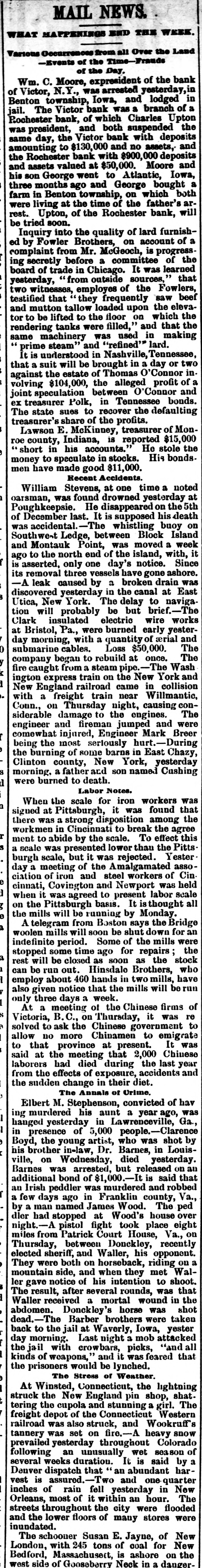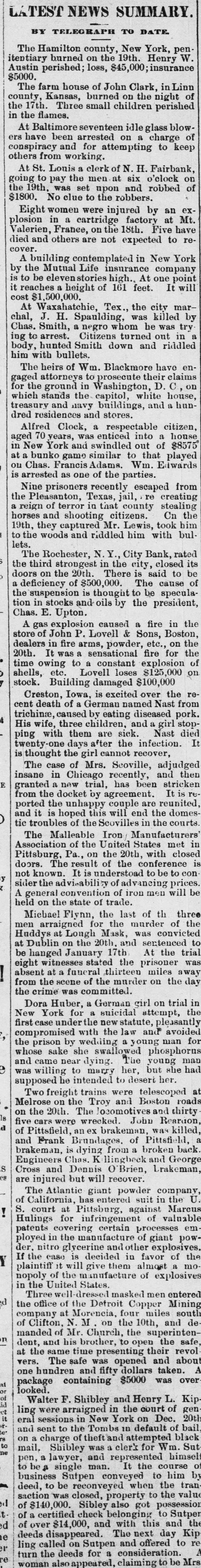 LATEST BY NEWS SUMMARY The TELEGRAPH TO DATE itentiary Austin Hamilton burned county, on the New York, $5000. perished; loss, $45,000; 19th. insurance Henry county, The farm Kansas, house of John Clark, perished the in the 17th. flames, Three small burned children the of ers At Baltimore have been arrested seventeen others conspiracy At from and working.Attempting for on a charge to keep of going the 19th, St. to Louis pay was the a clerk men of at N.H. six Fairbank, $1800, No clue set to upon the and o'clock robbed plosion women in a were injured have Valerien, Eight cartridge robbers. by an not to reexpected died and others France, are on the 18th. factory Five at Mt. excover. by A the building Mutual contemplated in point 161 It feet. is it reaches to be eleven a height Life of insurance high. At New one company York cost $1,500,000. by chal, At Waxahatchie, J. Tex. H. Spanlding, the city riddled bullets. ing body. Chas. him to with hunted Smith. arrest. a Smith Citizens negro down whom turned was and he killed mar- try The for gaged the attorneys heirs of Wm. to Blackmore and which treasury stands ground the in Washington, capitol, dred residences navy and buildings, in New York years, was enticed respectable aged Alfred 70 Clock, stores. into citizen, house is arrested Francis as one Wm. that played from escaped recently at ou Nine Chas. bunko prisoners game and similar swindled of the parties. to out of Edwards a $8575 the Texas. Pleasanton, a horses reign and of terror in that jail, re creating 19th, they captured shooting citizens. county stealing Cn lets. to the woods and riddled Mr. Lewis, him with took him the the third N.Y. City a on the 20th. in the city, closed rated doors The Rochester strongest There Bank bul its the deficiency suspension of $500,000. is said to tion in stocks and 18 thought to The be cause be of Chas, A E. Upton. oils the president, speculagas dealers store of John explosion P. Lovell caused a fire in It in was fire arms, powder, & Sons, $125,000 stock. 20th. shells, time owing etc. to Lovell a sensational constant loses explosion fire etc., Boston, for the the the Building damaged Creston, death of Iowa. a $100,000 over the It trichinre, ping His wife, with caused three children. by eating diseased pork. stop- reThe the girl cannot the infection. twenty-one is thought case days them of Mrs. after are sick. and recover. a Nast girl died E granted insane in Chicago Seoville, adjudged from the a new trial, recently, has and then ported the docket by been stricken D tic troubles of the this will end are the reunited and The it is Malleable hoped unhappy Scovilles agreement. couple in the courts It is domes of the Manufacturers doors. Association Pittsburg, Pa., on United Iron the 20th, States met closed not known. The result It of the with of advancing sider the ad held A general convention advisability understoad of iron conference men to prices, Michael on the state of trade. men arraigned Flynn. the last of th was s convicted the 20th. on at Huddys Dublin Longh for Mask the murder of three the be hanged a from absent the eight witnessunnary crime the at scene a was funeral committed. of stated the thirteen 17th the prisoner sentenced miles on the the away Dora German Huber, York New first case under for the suicidal girl attempt on trial the in avoided a wedding compromised the prison by with the law and pleasantly sake whose e was willing and came near to she dying. marry Tue young young phosphorns man for supposed Two he intended to her, but she on the 20th on the Troy and telescoped Melrose freight The trains were desert Boston d five cars were locomotives roads is of was killed. back of brakeman. and Pittsfield Frank Brundages, anex wrecked brakeman, John Pittsfield, and thirty Reartion Is es Engineers Cross are injured and Chas Dennis but dying will K llingbeck from O'Brien, a broken and Lakeman ! S. court at has entered powder suit of Hulings The California, Atlantic Pittsburg, giant recover company patents for against Marcus in the mg certain der, ployed covering manufacture ringement processes of valuable Y If the nitro case is other of giant nopoly of it will give in favor of the plaintiff the decided almost explosives. d in Three well-dreaten the United manufacture of explosives mocompany office of the Detroit masked men of Clifton, at Morencia, four Copper entered Mining in manded of Mr. on the 10th, miles and south dent. N. M Church, superintenat the and same his time brother. to the open the vers, one hundren The safe was presenting opened their revol safe was over package looked. containing and tifty $5000 dollars and taken. about F. Kip Walter eral and ling on sent sessions in were arraigned charge to the Shibley Tombs New in York and the Henry on court Dec. of gen- 20th Sut for Wm. a and himsel mail, pen. Shibley of theft was attempted default of lawyer. be to a the man. course single by to him business Sutpen to be the when deed. reconveyed was closed. saction d t ed of $14,000, check belonging to e deeds ling of of a $140,000. certified disappeared. Sibley and property also with got this to possession the and Sutper tran the er re turn called the deeds on Sutpen The and next offered day Kip woman also appeared for a consideration claiming to be to Mrs re