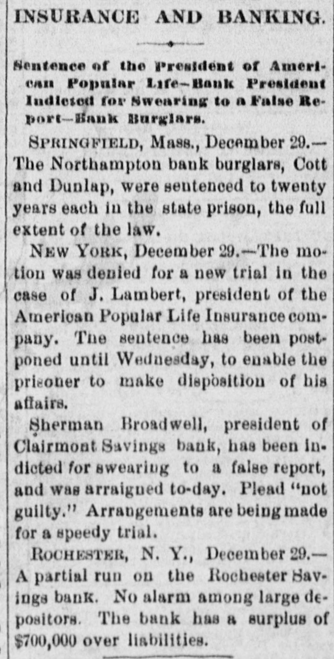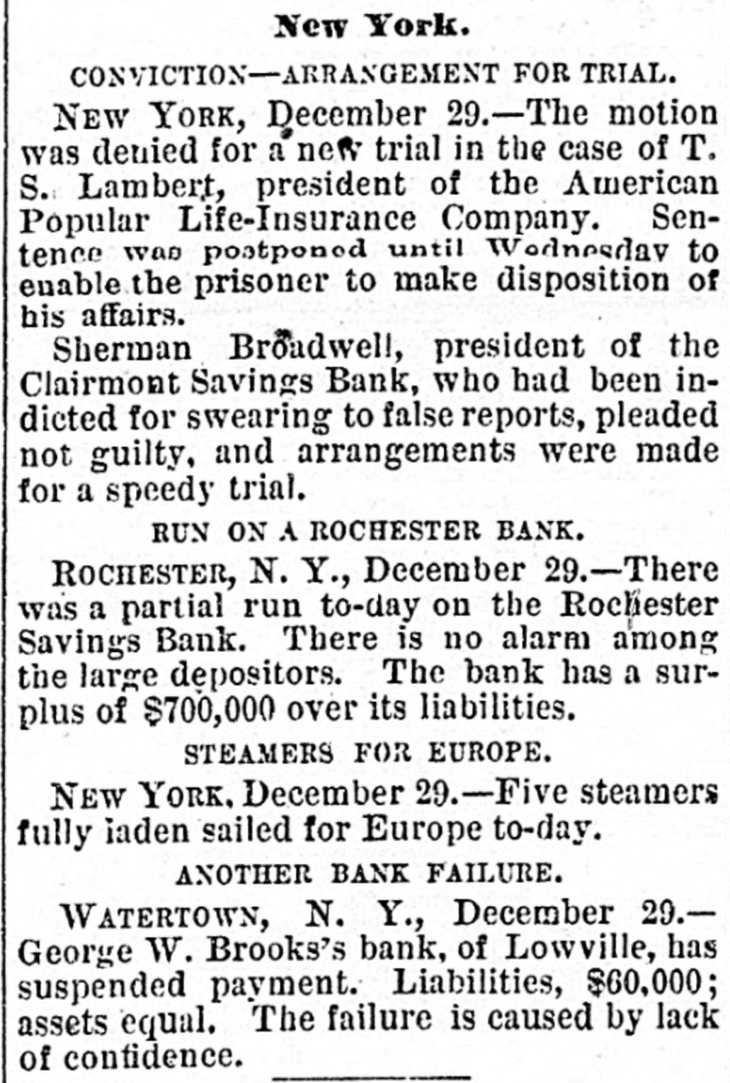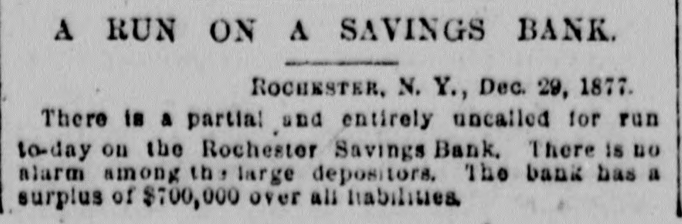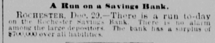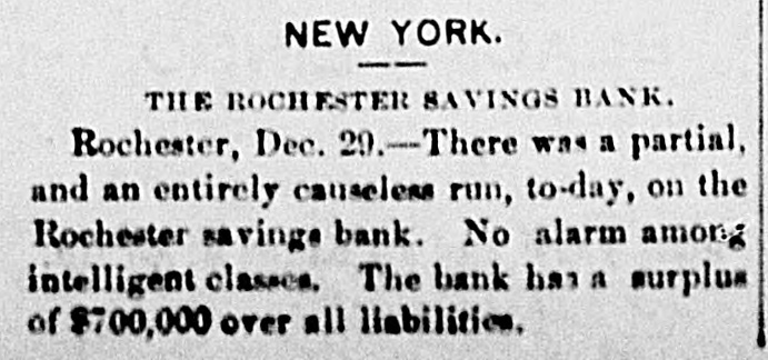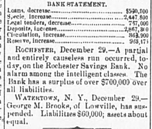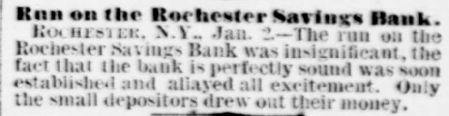 One great trouble seems to be a want of confi-dence. Men do not know whom to trust. If one has a demand against another he wants it paid; then, if he gets the money in hand, he does not know with whom to trust it. A short run was made not long ago upon the Rochester Savings Bank, the oldest and strongest institution of the kind in the city, but all demands were met so promptly that it soon subsided. Those who drew their money lost several thousand dollars by drawing before the interest of the month matured, and then they could not re-deposit it, because no other bank of the city would take it A little later, in the same bank, it was discovered that the paying teller was a defaulter in the sum of ten thousand dollars. Fast living and desire for speculation were the cause.