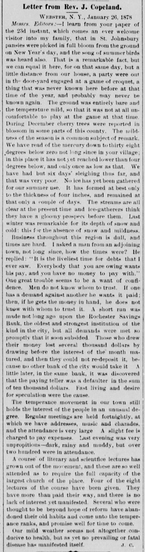 Messrs. Editors: -I learn from your paper of the 23d instant, which comes an ever welcome visitor into my family, that in St. Johnsbury pansies were picked in full bloom from the ground on New Year's day, and the song of summer birds was heard also. That is a remarkable fact, but we can equal it here, for on that same day, but a little distance from our house, a party were out in the door-yard engaged at a game of croquet, a thing that was never known here before at that time of the year, and probably may never be known again. The ground was entirely bare and the temperature mild, so that it was not at all un-comfortable to play at the game at that time. During December cherry trees were reported in blossom in some parts of this county. The mildness of the season is a common subject of remark. We have read of the mercury down to thirty eight degrees below zero not long since in your village; in this place it has not yet reached lower than four degrees below, and only once as low as that. We have had but six days' sleighing thus far, and that was very poor. No ice has yet been gathered for our summer use. It has formed at best only to the thickness of four inches, and remained at that only a couple of days. The streams are all clear at the present time and ice-gatherers think they have a gloomy prospect before them. Last winter was remarkable for its depth of snow and cold: this for the absence of snow and mildness.