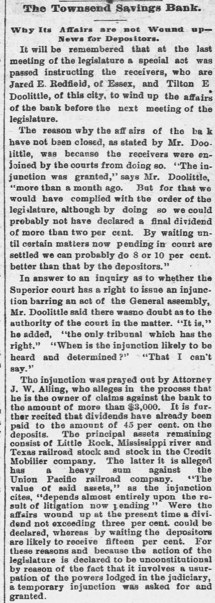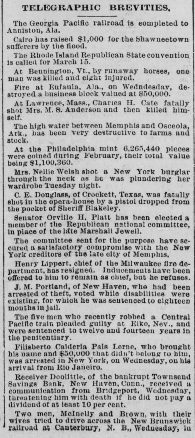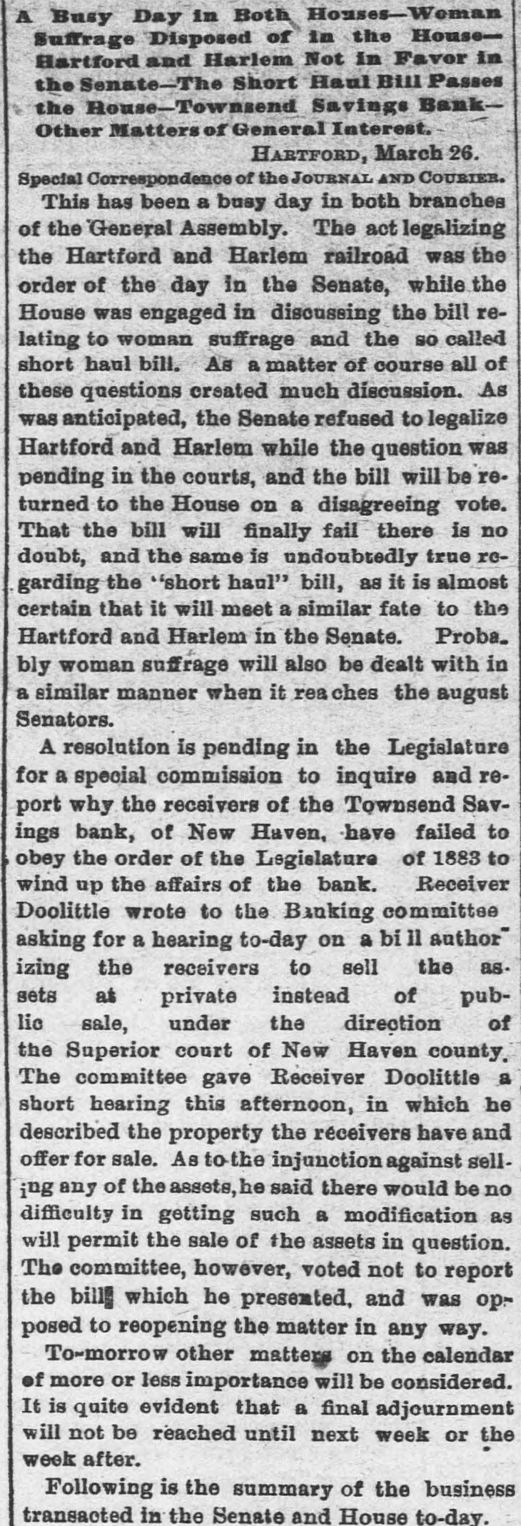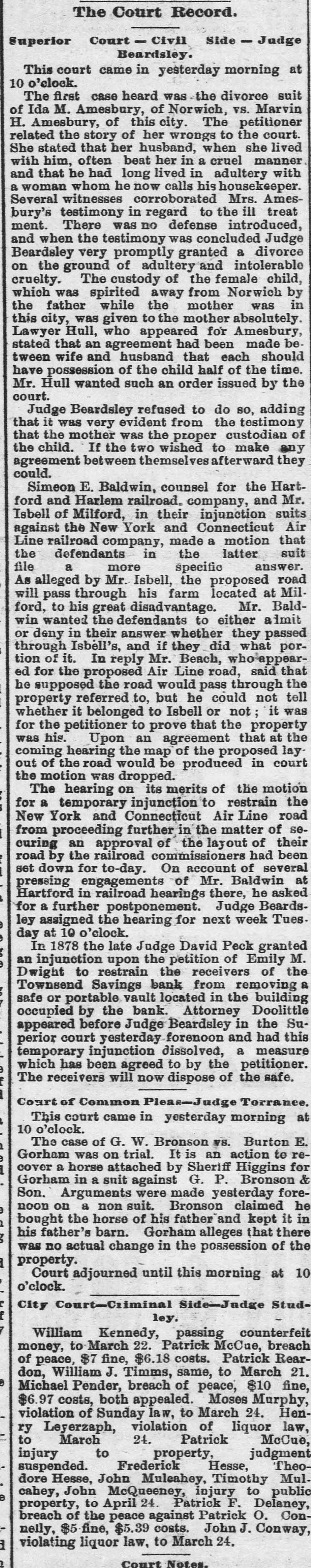 The Court Record. Superior Court - Civil Side - Judge Beardsley. This court came in yesterday morning at 10 o'clock. The first case heard was the divorce suit of Ida M. Amesbury, of Norwich, VS. Marvin H. Amesbury, of this city. The petitioner related the story of her wrongs to the court. She stated that her husband, when she lived with him, often beat her in a cruel manner and that he had long lived in adultery with a woman whom he now calls his housekeeper. Several witnesses corroborated Mrs. Amesbury's testimony in regard to the ill treat ment. There was no defense introduced, and when the testimony was concluded Judge Beardsley very promptly granted a divorce on the ground of adultery and intolerable cruelty. The custody of the female child, which was spirited away from Norwich by the father while the mother was in this city, was given to the mother absolutely. Lawyer Hull, who appeared for Amesbury, stated that an agreement had been made between wife and husband that each should have possession of the child half of the time. Mr. Hull wanted such an order issued by the court. Judge Beardsley refused to do so, adding that it was very evident from the testimony that the mother was the proper custodian of the child. If the two wished to make any agreement between themselves afterward they could. Simeon E. Baldwin, counsel for the Hartford and Harlem railroad. company, and Mr. Isbell of Milford, in their injunction suits against the New York and Connecticut Air Line railroad company, made a motion that the defendants in the latter suit a file answer. more specific As alleged by Mr. Isbell, the proposed road will pass through his farm located at Milford, to his great disadvantage. Mr. Baldwin wanted the defendants to either admit or deny in their answer whether they passed through Isbell's, and if they did what portion of it. In reply Mr. Beach, who appeared for the proposed Air Line road, said that he supposed the road would pass through the property referred to, but he could not tell whether it belonged to Isbell or not; it was for the petitioner to prove that the property was his. Upon an agreement that at the coming hearing the map of the proposed lay out of the road would be produced in court the motion was dropped. The hearing on its merits of the motion for a temporary injunction to restrain the New York and Connecticut Air Line road from proceeding further in the matter of securing an approval of the layout of their road by the railroad commissioners had been set down for to-day. On account of several pressing engagements of Mr. Baldwin at Hartford in railroad hearings there, he asked for a further postponement. Judge Beardsley assigned the hearing for next week Tues. day at 10 o'clock. In 1878 the late Judge David Peck granted an injunction upon the petition of Emily M. Dwight to restrain the receivers of the Townsend Savings bank from removing a safe or portable vault located in the building occupied by the bank. Attorney Doolittle appeared before Judge Beardsley in the Superior court yesterday forenoon and had this temporary injunction dissolved, a measure which has been agreed to by the petitioner. The receivers will now dispose of the safe. Court of Common Pleas-Judge Torrance. This court came in yesterday morning at 10 o'clock. The case of G. W. Bronson vs. Burton E. Gorham was on trial. It is an action to re1 cover a horse attached by Sheriff Higgins for Gorham in a suit against G. P. Bronson & Son. Arguments were made yesterday foree noon on a non suit. Bronson claimed he n bought the horse of his father and kept it in his father's barn. Gorham alleges that there 3 was no actual change in the possession of the property. i Court adjourned until this morning at 10 o'clock. City Court-Ciiminal Side-Judge Studley. William Kennedy, passing counterfeit money, to March 22. Patrick McCue, breach of peace, $7 fine, $6.18 costs. Patrick Reardon, William J. Timms, same, to March 21. e Michael Pender, breach of peace, $10 fine, $6.97 costs, both appealed. Moses Murphy, violation of Sunday law, to March 24. Henry Leyerzaph, violation of liquor law, to 24. Patrick March McCue, to injury property, judgment suspended. Frederick Hesse, Theodore Hesse, John Muleahey, Timothy Mule cahey, John McQueeney, injury to public property, to April 24. Patrick F. Delaney, breach of the peace against Patrick O. Connelly, $5 fine, $5.39 costs. John J. Conway, a violating liquor law, to March 24. Court Notes.