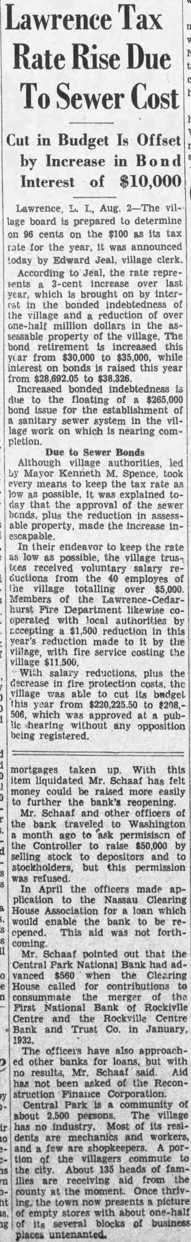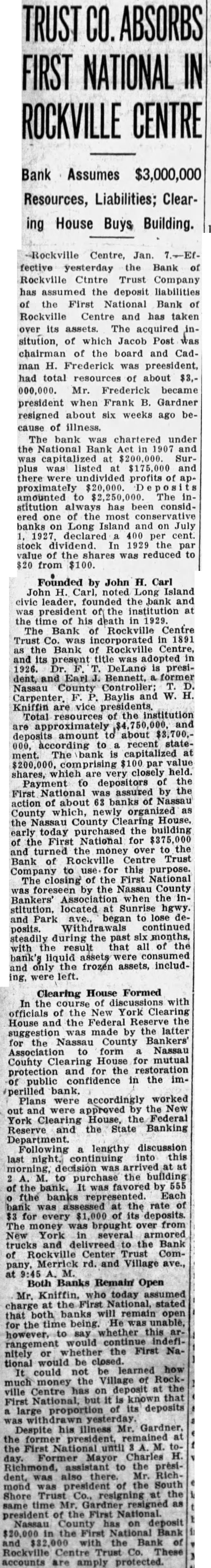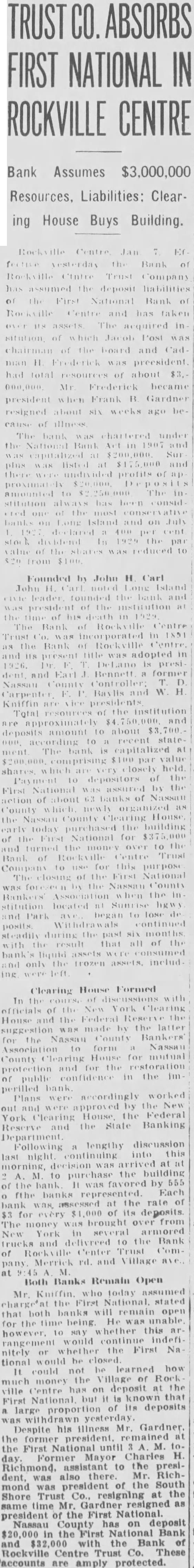 TRUST ABSORBS FIRST NATIONAL IN ROCKVILLE CENTRE Bank Assumes $3,000,000 Resources, Liabilities; Clearing House Buys Building. -Rockville Centre, Jan. fective yesterday the Bank of Rockville Ctntre Trust Company has the deposit liabilities the First National Bank of Rockville Centre and has taken over assets. The acquired sitution, of which Jacob Post was chairman of the board and Cadman H. Frederick preesident, had total resources of about $3,000,000. Mr. Frederick became president when Frank B. Gardner resigned about six weeks ago because illness. The bank chartered under the National Bank Surplus listed and there undivided profits proximately $20,000. amounted $2,250,000. The stitution has been considered one of the most conservative banks Long Island on July declared cent. stock dividend the par value of the was reduced to $20 from $100. Founded by John H. Carl John Island the and president institution at the of his death 1929. The Bank of Rockville Centre Trust Co. incorporated in 1891 Bank of Rockville Centre, present DeLano presiBennett, former Nassau Baylis and W. Carpenter. Kniffin are vice Total resources the institution amount about according recent stateThe capitalized $100 par closely held. shares, which are Payment depositors National the First was action about County which, organized the County House, purchased the building today First National for and turned the money over the Rockville Centre Trust Bank of Company this purpose. closing of the First National The the Nassau County Bankers' when the inlocated Sunrise Park began to lose posits. Withdrawals continued steadily during the past months, with the that bank's assets only the frozen assets, includwere left. Clearing House Formed In the of the New York Clearing House the Federal was made by the latter suggestion Nassau County Bankers' for Association form Nassau County Clearing House for mutual protection and the confidence in the imPlans accordingly worked were approved the House, the Federal York Clearing Reserve the State Banking Department. lengthy discussion Following last into purchase the building the was favored by fthe banks represented. Each assessed the for every its deposits. The brought from York several trucks delivreed the Bank Center Trust Company, Merrick and Village ave., Both Banks Remain Open Mr. Kniffin, today assumed time being. whether however, would First nitely tional would be learned the Village money Centre has deposit known that National, deposits proportion Despite his illness Mr. until Former Mayor Charles assistant to the of president First National. County has deposit First Bank the Trust Co. These accounts are amply protected.