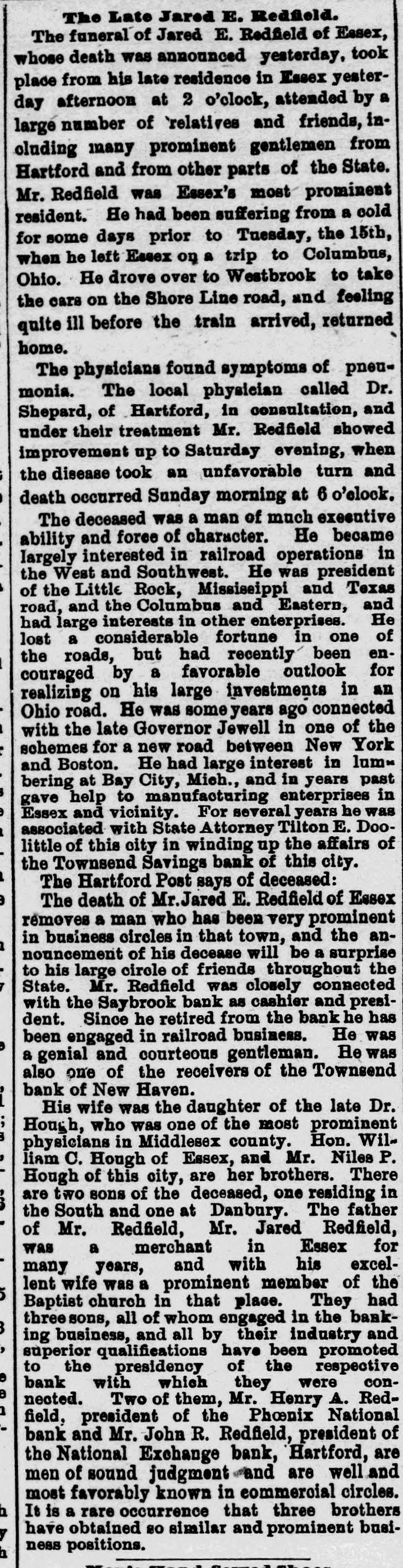 # The Late Jared E. Redfield. The funeral of Jared E. Redfield of Essex, whose death was announced yesterday, took place from his late residence in Essex yesterday afternoon at 2 o'clock, attended by a large number of 'relatives and friends, including many prominent gentlemen from Hartford and from other parts of the State. Mr. Redfield was Essex's most prominent resident. He had been suffering from a cold for some days prior to Tuesday, the 15th, when he left Essex on a trip to Columbus, Ohio. He drove over to Westbrook to take the cars on the Shore Line road, and feeling quite ill before the train arrived, returned home. The physicians found symptoms of pneumonia. The local physician called Dr. Shepard, of Hartford, in consultation, and under their treatment Mr. Redfield showed improvement up to Saturday evening, when the disease took an unfavorable turn and death occurred Sunday morning at 6 o'clock. The deceased was a man of much executive ability and force of character. He became largely interested in railroad operations in the West and Southwest. He was president of the Little Rock, Mississippi and Texas road, and the Columbus and Eastern, and had large interests in other enterprises. He lost a considerable fortune in one of the roads, but had recently been encouraged by a favorable outlook for realizing on his large investments in an Ohio road. He was some years ago connected with the late Governor Jewell in one of the schemes for a new road between New York and Boston. He had large interest in lumbering at Bay City, Mich., and in years past gave help to manufacturing enterprises in Essex and vicinity. For several years he was associated with State Attorney Tilton E. Doolittle of this city in winding up the affairs of the Townsend Savings bank of this city. The Hartford Post says of deceased: The death of Mr. Jared E. Redfield of Essex removes a man who has been very prominent in business circles in that town, and the announcement of his decease will be a surprise to his large circle of friends throughout the State. Mr. Redfield was closely connected with the Saybrook bank as cashier and president. Since he retired from the bank he has been engaged in railroad business. He was a genial and courteous gentleman. He was also one of the receivers of the Townsend bank of New Haven. His wife was the daughter of the late Dr. Hough, who was one of the most prominent physicians in Middlesex county. Hon. William C. Hough of Essex, and Mr. Niles P. Hough of this city, are her brothers. There are two sons of the deceased, one residing in the South and one at Danbury. The father of Mr. Redfield, Mr. Jared Redfield, was a merchant in Essex for many years, and with his excellent wife was a prominent member of the Baptist church in that place. They had three sons, all of whom engaged in the banking business, and all by their industry and superior qualifications have been promoted to the presidency of the respective bank with which they were connected. Two of them, Mr. Henry A. Redfield, president of the Phoenix National bank and Mr. John R. Redfield, president of the National Exchange bank, Hartford, are men of sound judgment and are well and most favorably known in commercial circles. It is a rare occurrence that three brothers have obtained so similar and prominent business positions.