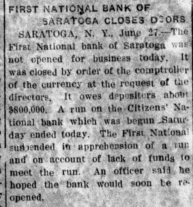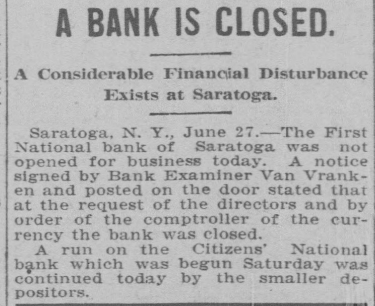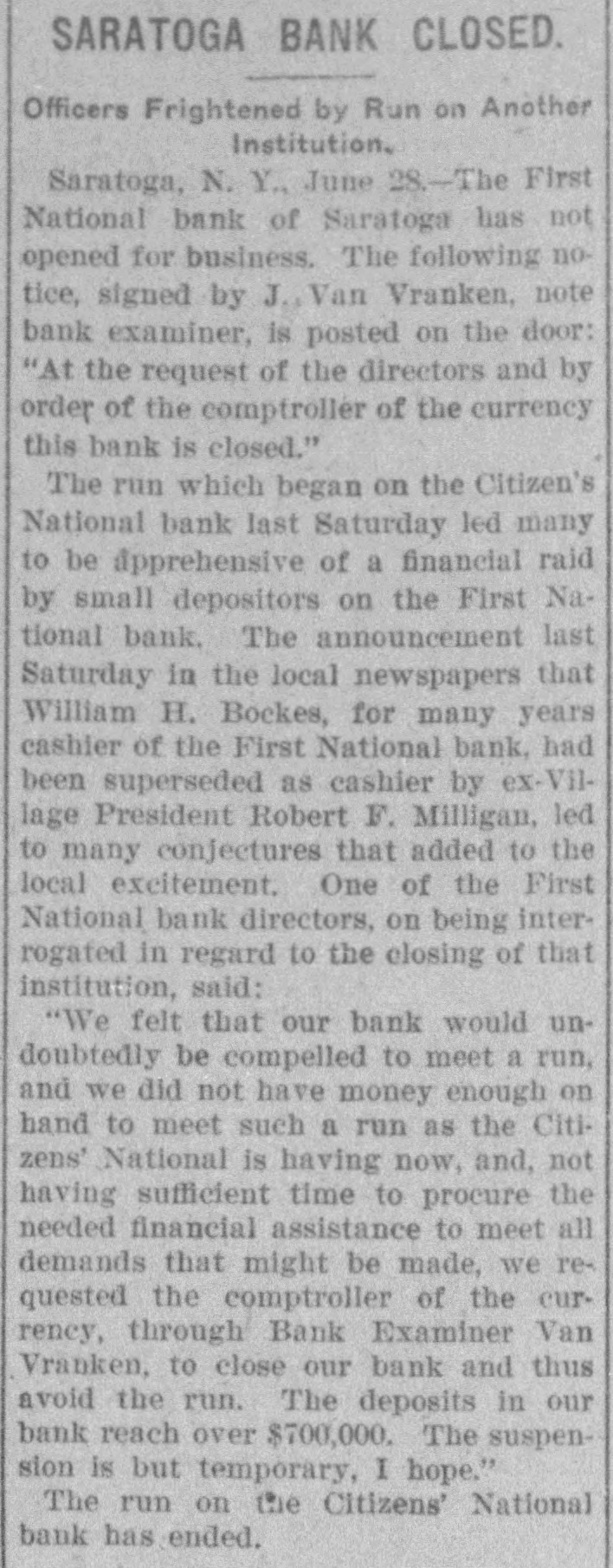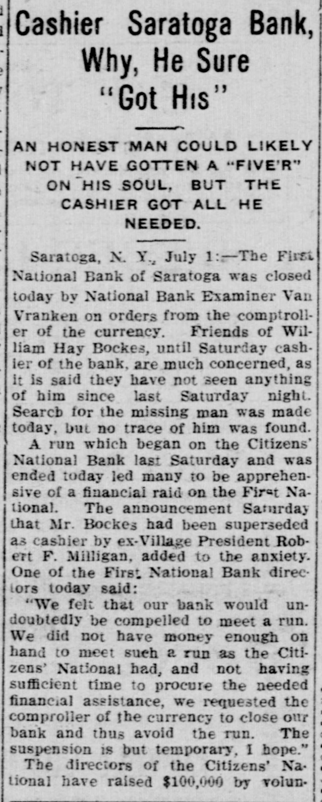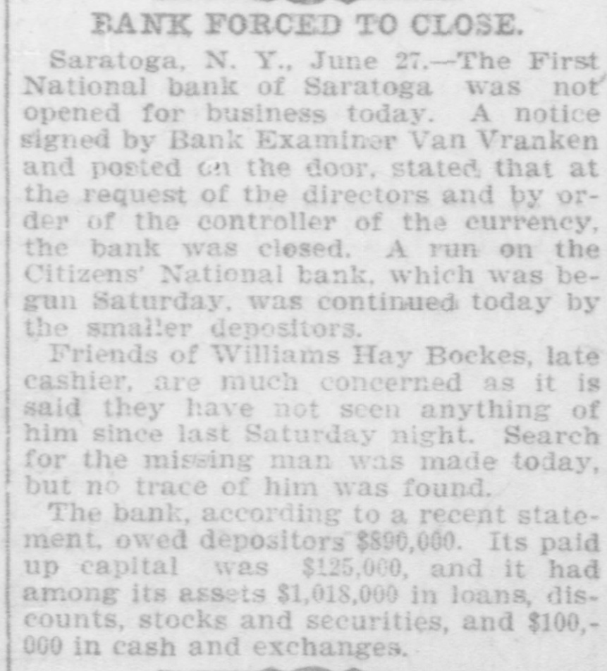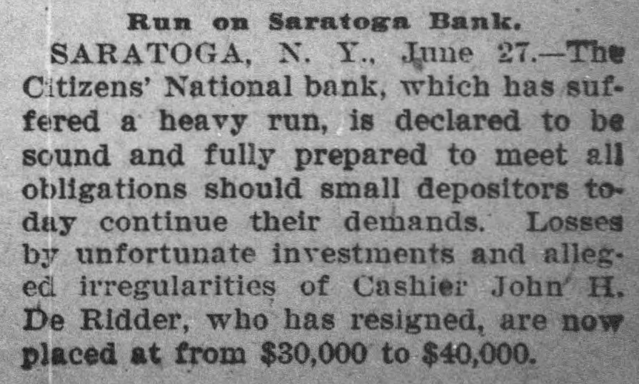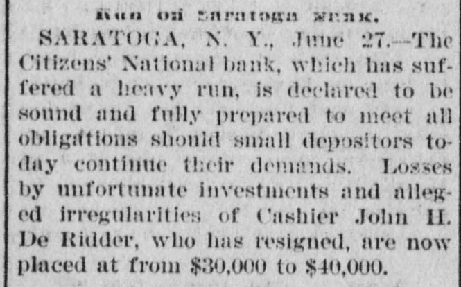 Bank Declared All Right. Saratoga, N. Y., June 26.-The Citizens' National bank, which suffered a heavy run yesterday, is declared to be sound and fully prepared to meet all obligations should small depositors tomorrow continue their demands. Losses by unfortunate investments and alleged irregularities of Cashier John H. DeRidder, who has resigned, are now placed at from $30,000 to $40.000, The American Surety company of New York is upon DeRidder's bond as cashier to the amount of $20,000, and has been officially notified to meet it.