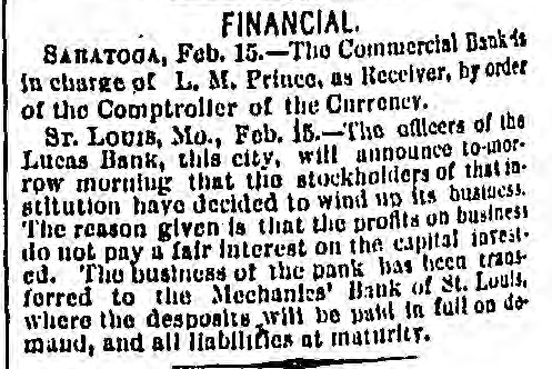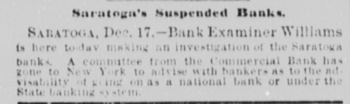 Defalcation of a County Treasurer and Consequent Run on Banks. SARATOGA. N. Y.. Dec. 3.-The suspension and defaleation of Jame H. Wright, county treasurer, was made public last Monday. There have been serious reports of loss on the part or the banks and others growing out of complications with Mr. Wright as his bondsmen and endorsers. A run began on the First National Bank on Friday, and continued until $50,000 had been drawn out. After an examination of the assets by the directors, they decided them more than sufficient to meet all liabilities and leave a surplus. Telegrams were sent and funds came this morning in response thereto, bat as the excitement was increasing the directors concluded to return them and stop basiness. It is possible the bank may now go into liquidation. The shrinkage in the value or real estate hereduring the past five years has left a proportion of overdue paper, which has rendered this course advisable, A run began on the Commerclal Bank as soon as the First Nath II il stopped, and now that has also stopped.