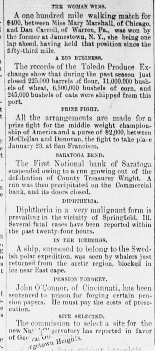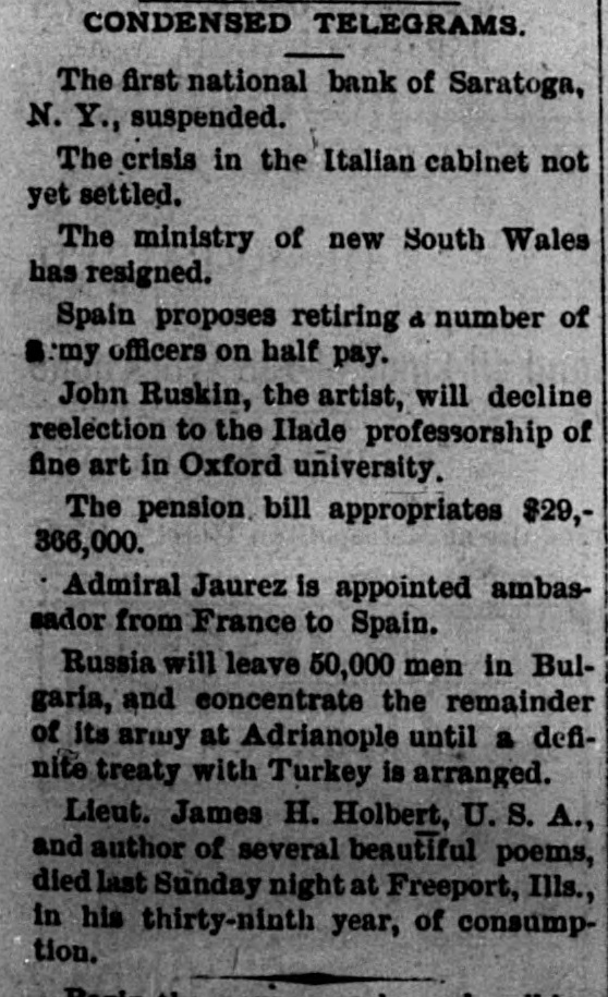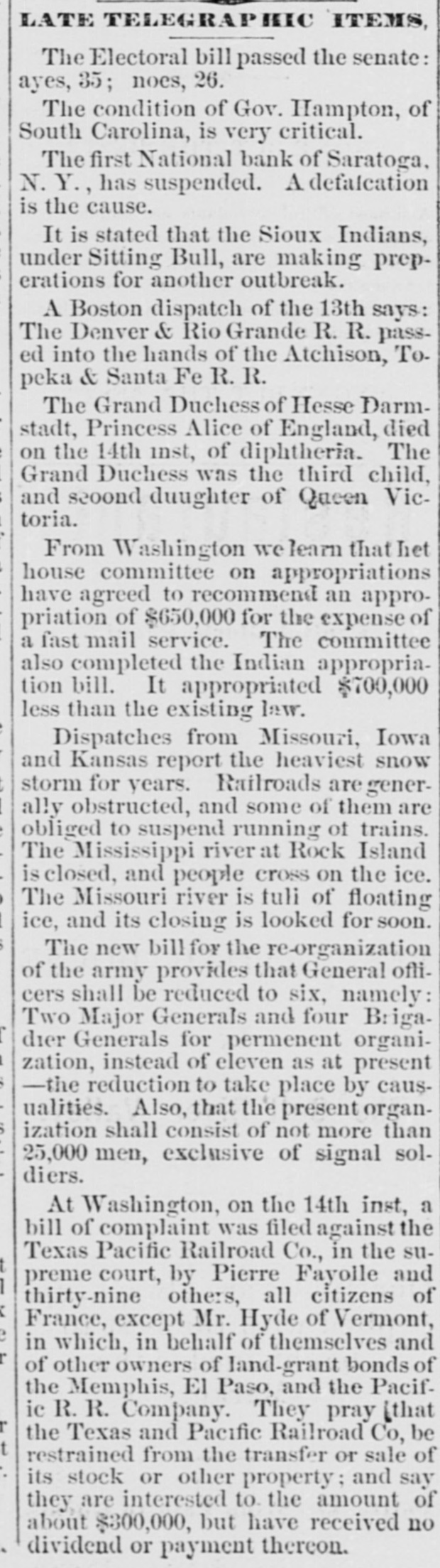 LATE TELEGRAPHIC ITEMS, The Electoral bill passed the senate: ayes, 35; noes, 26. The condition of Gov. Hampton, of South Carolina, is very critical. The first National bank of Saratoga, N. Y., has suspended. A defalcation is the cause. It is stated that the Sioux Indians, under Sitting Bull, are making preperations for another outbreak. A Boston dispatch of the 13th says: The Denver & Rio Grande R. R. passed into the hands of the Atchison, Topeka & Santa Fe R. R. The Grand Duchess of Hesse Darmstadt, Princess Alice of England, died on the 14th inst, of diphtheria. The Grand Duchess was the third child, and second duughter of Queen Victoria. From Washington we learn that Liet house committee on appropriations have agreed to recommend an appropriation of $650,000 for the expense of a fast mail service. The committee also completed the Indian appropriation bill. It appropriated $700,000 less than the existing law. Dispatches from Missouri, Iowa and Kansas report the heaviest snow storm for years. Railroads are generally obstructed, and some of them are obliged to suspend running of trains. The Mississippi river at Rock Island is closed, and people cross on the ice. The Missouri river is fuli of floating ice, and its closing is looked for soon. $ The new bill for the re-organization of the army provides that General oflicers shall be reduced to six, namely: Two Major Generals and four Brigaf dier Generals for permenent organization, instead of eleven as at present -the reduction to take place by causualities. Also, that the present organ$ ization shall consist of not more than 25,000 men, exclusive of signal soldiers. At Washington, on the 14th inst, a bill of complaint was filed against the Texas Pacific Railroad Co., in the supreme court, by Pierre Fayolle and thirty-nine others, all citizens of France, except Mr. Hyde of Vermont, e in which, in behalf of themselves and r of other owners of land-grant bonds of the Memphis, El Paso, and the Pacific R. R. Company. They pray [that the Texas and Pacific Railroad Co, be t restrained from the transfer or sale of its stock or other property; and say they are interested to the amount of about $300,000, but have received no dividend or payment thereon.