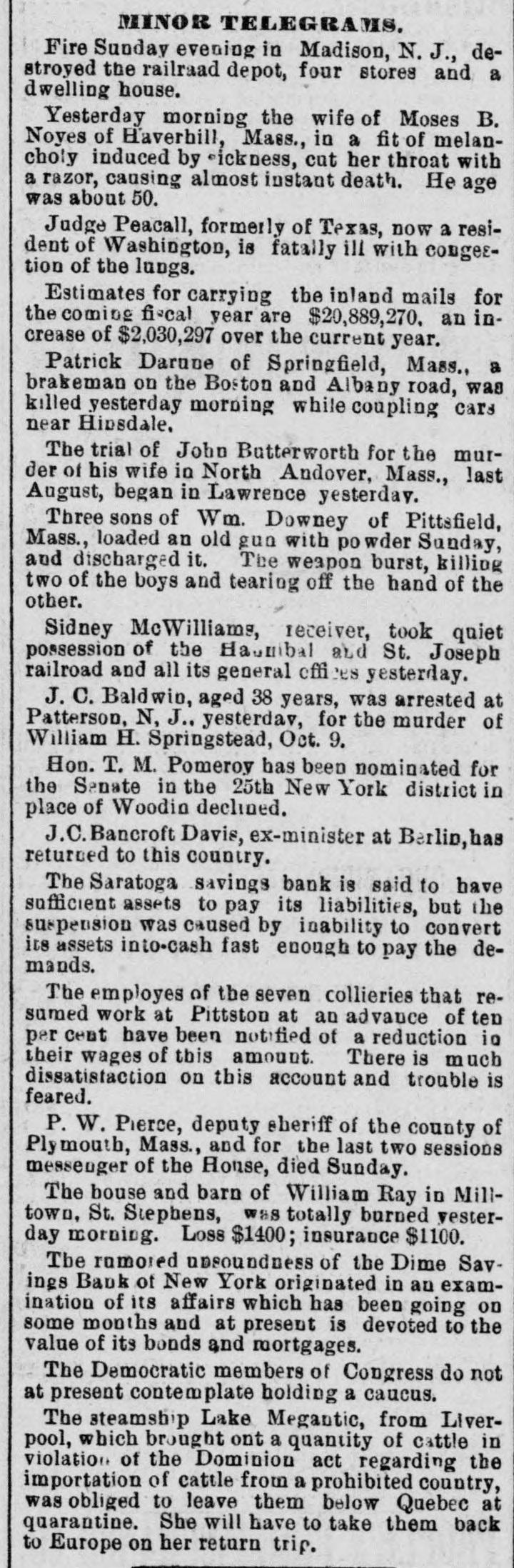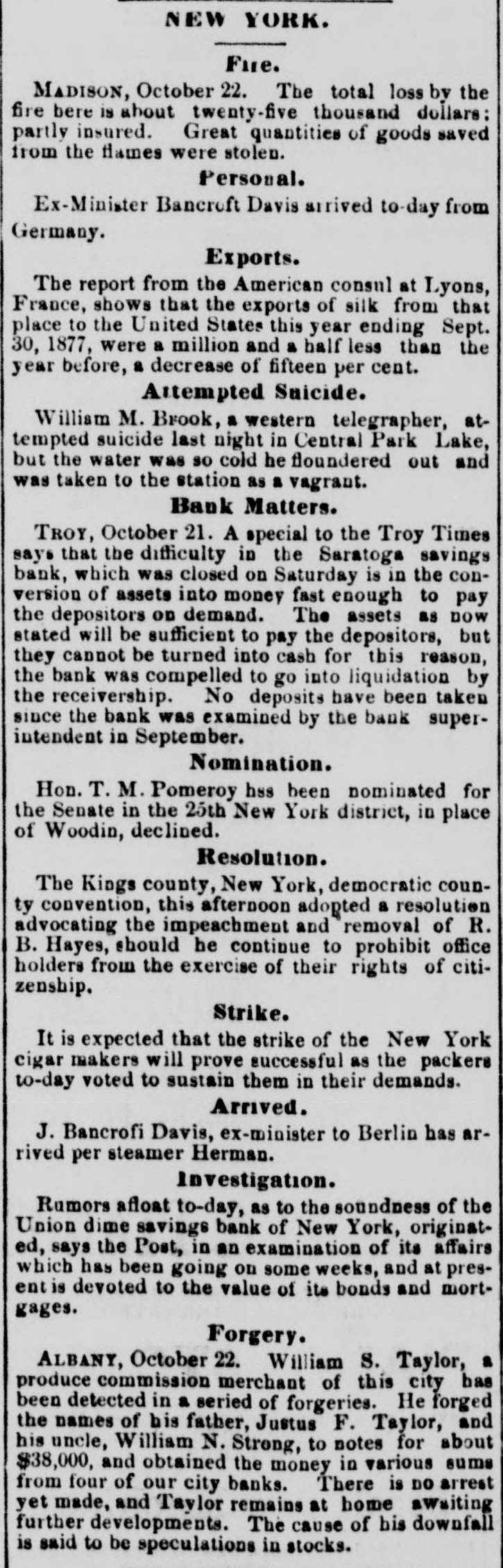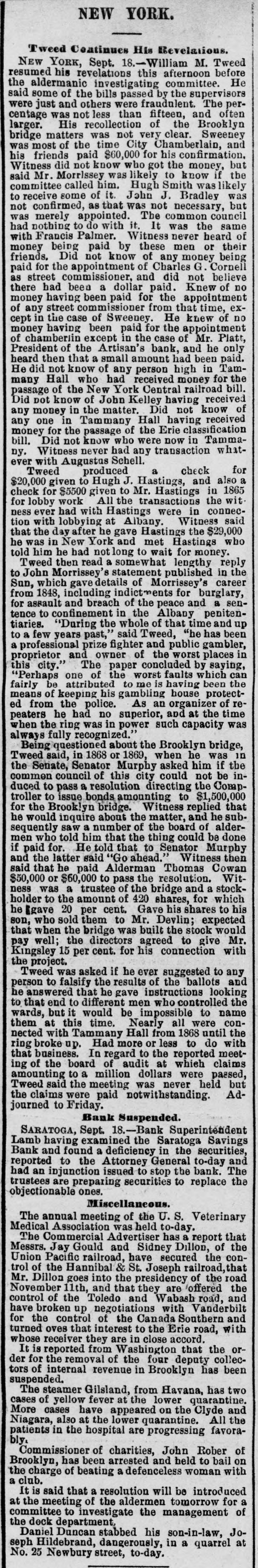NEW YORK. Tweed Continues His Revelations. NEW YORK, Sept. 18.-William M. Tweed resumed his revelations this afternoon before the aldermanic investigating committee. He said some of the bills passed by the supervisors were just and others were fraudulent. The percentage was not less than fifteen, and often larger. His recollection of the Brooklyn bridge matters was not very clear. Sweeney was most of the time City Chamberlain, and his friends paid $60,000 for his confirmation. Witness did not know who got the money, but said Mr. Morrlssey was likely to know if the committee called him. Hugh Smith was likely to receive some of it. John J. Bradley was not confirmed, as that was not necessary, but was merely appointed. The common council had nothing to do with it. It was the same with Francis Palmer. Witness never heard of money being paid by these men or their friends. Did not know of any money being paid for the appointment of Charles G. Cornell as street commissioner, and did not believe there had been a dollar paid. Knew of no money having been paid for the appointment of any street commissioner from that time, except in the case of Sweeney. He knew of no money having been paid for the appointment of chamberlin except in the case of Mr. Platt, President of the Artisan's bank, and he only heard then that a small amount had been paid. He did not know of any person high in Tammany Hall who had received money for the passage of the New York Central railroad bill. Did pot know of John Kelley having received any money in the matter. Did not know of any one in Tammany Hall having received money for the passage of the Erie classification bill. Did not know who were now in Tammany. Witness never had any transaction whatever with Augustus Schell. Tweed produced a check for $20,000 given to Hugh J. Hastings, and also a check for $5500 given to Mr. Hastings in 1865 for lobby work All the transactions the wit. ness ever had with Hastings were in connection with lobbying at Albany. Witness said that the day after he gave Hastings the $29,000 he was in New York and met Hastings who told him he had not long to wait for money. Tweed then read a somewhat lengthy reply to John Morrissey's statement published in the Sun, which gave details of Morrissey's career from 1848, including indictments for burglary, for assault and breach of the peace and a sentence to confinement in the Albany penitentiaries. "During the whole of that time and up to a few years past," said Tweed, "he has been a professional prize fighter and public gambler, proprietor and owner of the worst places in this city." The paper concluded by saying, "Perhaps one of the worst faults which can fairly be attributed to me is having been the means of keeping his gambling house protected from the police. As an organizer of repeaters he had no superior, and at the time when the ring was in power such capacity was always fully recognized." Being questioned about the Brooklyn bridge, Tweed said, in 1868 or 1869, when he was in the Senate, Senator Murphy asked him if the common council of this city could not be induced to pass a resolution directing the Comptroller to issue bonds amounting to $1,500,000 for the Brooklyn bridge. Witness replied that he would inquire about the matter, and he subsequently saw a number of the board of aldermen who told him that the thing could be done if paid for. He told that to Senator Murphy and the latter said "Go ahead.' Witness then said that he paid Alderman Thomas Cowan $50,000 or $60,000 to pass the resolution. Witness was a trustee of the bridge and a stockholder to the amount of 420 shares, for which he Egave 20 per cent. Gave his shares to his son, who sold them to Mr. Devlin; expected that when the bridge was built the stock would pay well; the directors agreed to give Mr. Kingsley 15 per cent. for his connection with the project. Tweed was asked if he ever suggested to any person to falsify the results of the ballots and he answered that he gave instructions looking to that end to different men who controlled the wards, but it would be impossible to name them at this time. Nearly all were connected with Tammany Hall from 1868 until the ring broke up. Had more or less to do with that business. In regard to the reported meeting of the board of audit at which claims amounting to a million dollars were passed, Tweed said the meeting was never held but the claims were paid notwithstanding. Adjourned to Friday. Bank Suspended. SARATOGA, Sept. 18.-Bank Superintendent Lamb having examined the Saratoga Savings Bank and found a deficiency in the securities, reported to the Attorney General to-day and had an injunction issued to stop the bank. The trustees are preparing securities to replace the objectionable ones. Miscellaneous. The annual meeting of the U. S. Veterinary Medical Association was held to-day. The Commercial Advertiser has a report that Messrs. Jay Gould and Sidney Dillon, of the Union Pacific railroad, have secured the control of the Hannibal & St. Joseph railroad, that Mr. Dillon goes into the presidency of the road November 11th, and that they are offered the control of the Toledo and Wabash road, and have broken up negotiations with Vanderbilt for the control of the Canada Southern and turned oves that interest to the Erie road, with whose receiver they are in close accord. It is reported from Washington that the order for the removal of the four deputy collectors of internal revenue in Brooklyn has been suspended. The steamer Gilsland, from Havana, has two cases of yellow fever at the lower quarantine. More cases have appeared on the Clyde and Niagara, also at the lower quarantine. All the patients in the hospital are progressing favorably. Commissioner of charities, John Rober of Brooklyn, has been arrested and held to bail on the charge of beating a defenceless woman with a club. It is said that a resolution will be introduced at the meeting of the aldermen tomorrow for a committee to investig