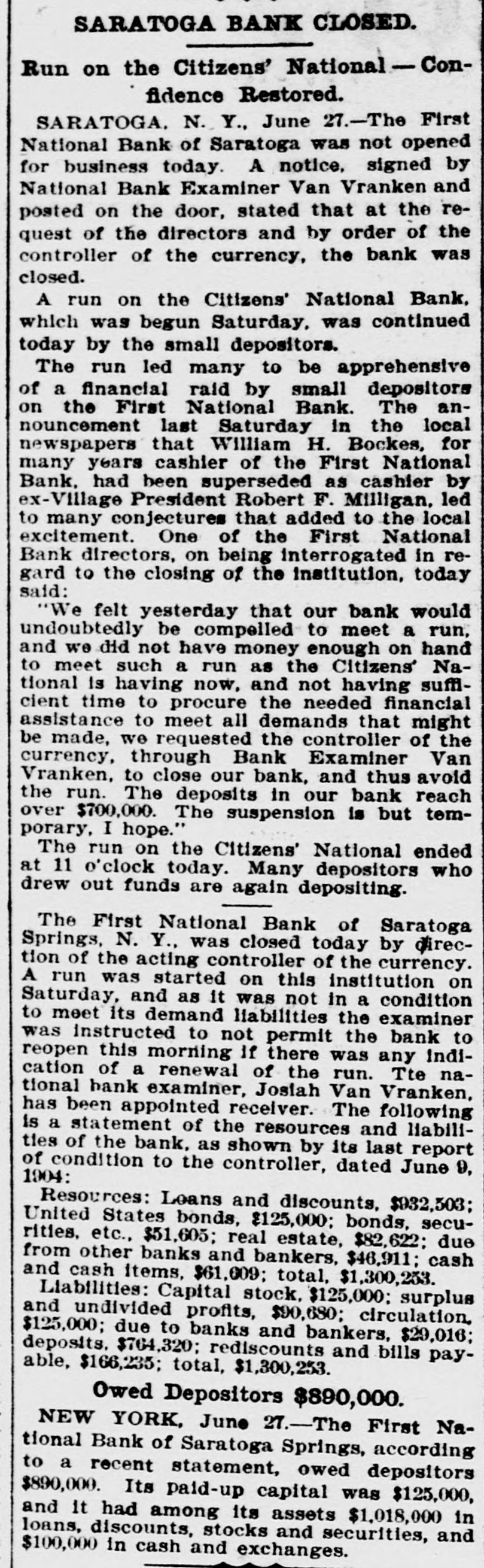 SARATOGA BANK CLOSED. Run on the Citizens' National - Confidence Restored. SARATOGA. N. Y., June 27.-The First National Bank of Saratoga was not opened for business today. A notice. signed by National Bank Examiner Van Vranken and posted on the door, stated that at the request of the directors and by order of the controller of the currency, the bank was closed. A run on the Citizens' National Bank, which was begun Saturday, was continued today by the small depositors. The run led many to be apprehensive of a financial raid by small depositors on the First National Bank. The announcement last Saturday in the local newspapers that William H. Bockes, for many years cashier of the First National Bank, had been superseded as cashier by ex-Village President Robert F. Milligan, led to many conjectures that added to the local excitement. One of the First National Bank directors, on being interrogated in regard to the closing of the institution, today said: "We felt yesterday that our bank would undoubtedly be compelled to meet a run, and we did not have money enough on hand to meet such a run as the Citizens' National is having now, and not having sufficient time to procure the needed financial assistance to meet all demands that might be made, we requested the controller of the currency, through Bank Examiner Van Vranken, to close our bank, and thus avoid the run. The deposits in our bank reach over $700,000. The suspension is but temporary, I hope." The run on the Citizens' National ended at 11 o'clock today. Many depositors who drew out funds are again depositing. The First National Bank of Saratoga Springs, N. Y., was closed today by direction of the acting controller of the currency. A run was started on this institution on Saturday, and as it was not in a condition to meet its demand liabilities the examiner was instructed to not permit the bank to reopen this morning if there was any Indication of a renewal of the run. Tte national bank examiner, Josiah Van Vranken, has been appointed receiver. The following is a statement of the resources and liabilities of the bank, as shown by its last report of 1904: condition to the controller, dated June 9, Resources: Loans and discounts, $932,503; United States bonds, $125,000; bonds, securities, etc., $51,605; real estate, $82,622: due from other banks and bankers, $46,911; cash and cash items, $61,609; total, $1,300,253. Liabilities: Capital stock, $125,000; surplus and undivided profits, $90,680; circulation, $125,000; due to banks and bankers, $29,016; deposits. $764,320; rediscounts and bills payable, $166,235; total, $1,300,253. Owed Depositors $890,000. NEW YORK, June 27.-The First National Bank of Saratoga Springs, according to a recent statement, owed depositors $890,000. Its paid-up capital was $125,000, and it had among its assets $1,018,000 in loans, discounts, stocks and securities, and $100,000 in cash and exchanges.