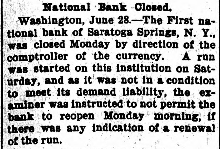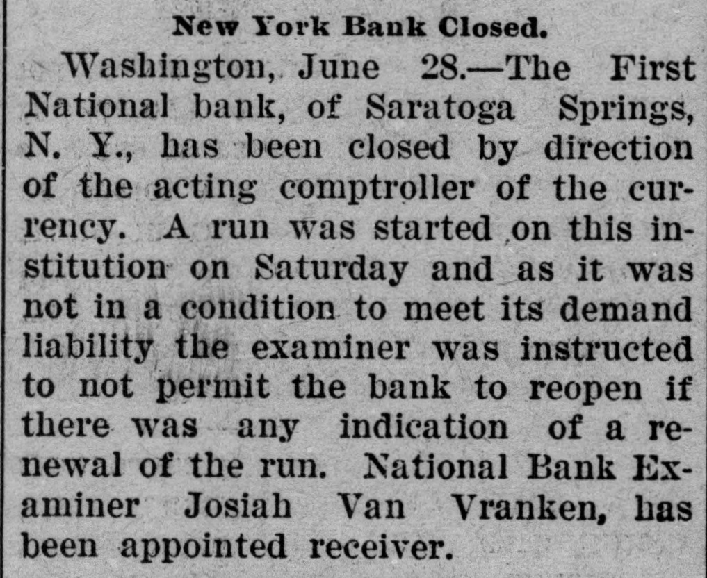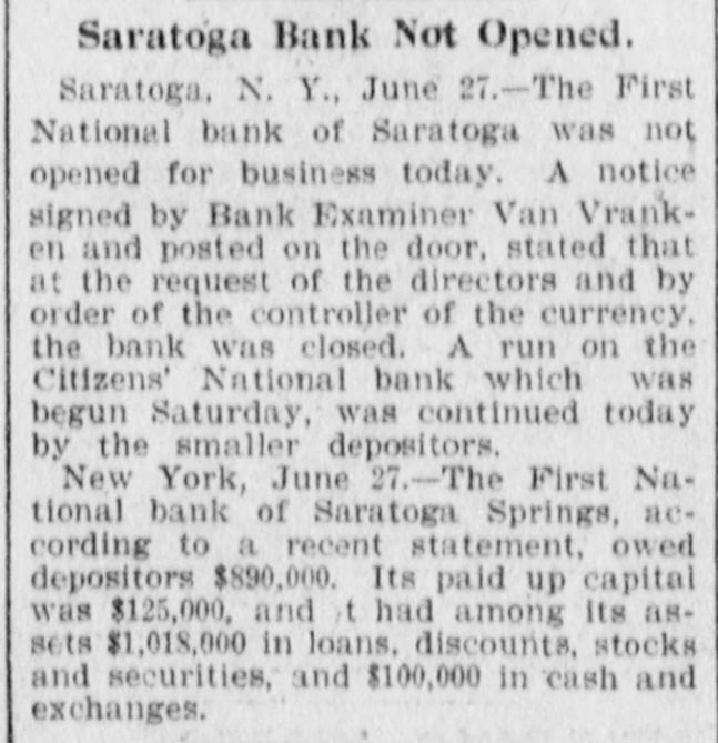NEW YORK BANK CLOSES. Saratoga Institute Does Not Open for Business-Owes Depositors $890,000. Saratoga, N. Y., June 27.-The First National bank of Saratoga was not opened for business today. A notice signed by National Bank Examiner Van Vranken and posted on the door stated that at the request of the directors and by order of the controller of the currency the bank was closed. A run on the Citizens' National bank, which was begun Saturday, was continued today by the smaller depositors. New York, June 27.-The First National bank of Saratoga Springs, according to a recent statement, owed depositors $890,000. Its paid-up capital was $125,000 and it had among its assets $1,018,000 in loans, discounts, stocks and securities and $100,000 in cash and exchanges.