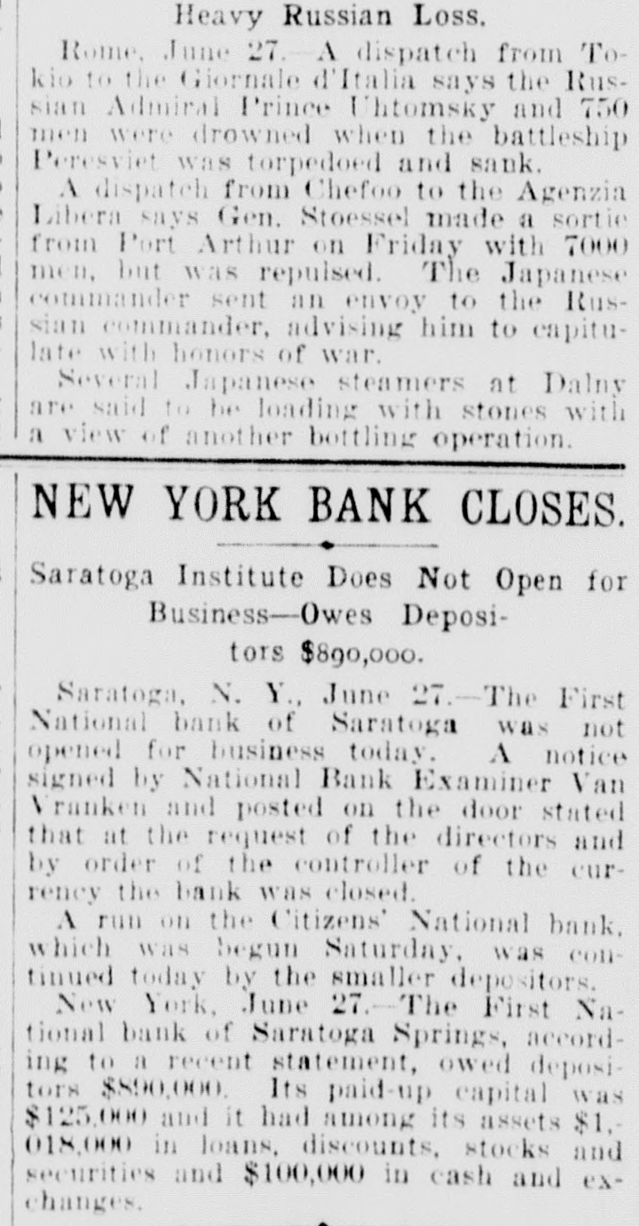 Heavy Russian Loss. Rome, June 27.-A dispatch from Tokio to the Giornale d'Italia says the Russian Admiral Prince Uhtomsky and 750 men were drowned when the battleship Peresviet was torpedoed and sank. A dispatch from Chefoo to the Agenzia Libera says Gen. Stoessel made a sortie from Port Arthur on Friday with 7000 men, but was repulsed. The Japanese commander sent an envoy to the Russian commander, advising him to capitulate with honors of war. Several Japanese steamers at Dalny are said to be loading with stones with a view of another bottling operation. NEW YORK BANK CLOSES. Saratoga Institute Does Not Open for Business-Owes Depositors $890,000. Saratoga, N. Y., June 27.-The First National bank of Saratoga was not opened for business today. A notice signed by National Bank Examiner Van Vranken and posted on the door stated that at the request of the directors and by order of the controller of the currency the bank was closed. A run on the Citizens' National bank, which was begun Saturday, was continued today by the smaller depositors. New York, June 27.-The First National bank of Saratoga Springs, according to a recent statement, owed depositors $890,000. Its paid-up capital was $125,000 and it had among its assets $1,018,000 in loans, discounts, stocks and securities and $100,000 in cash and exchanges.