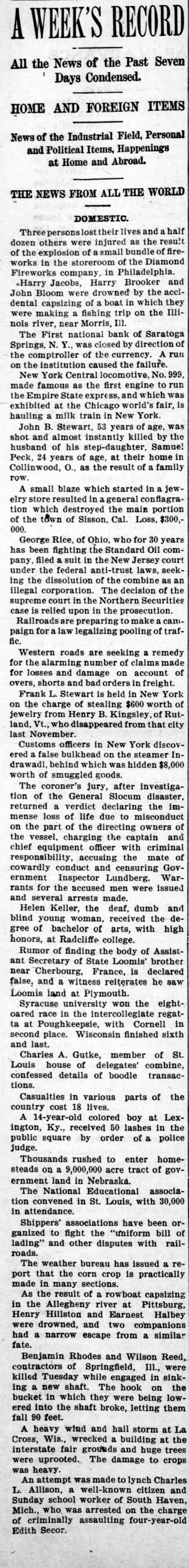 A WEEK'S RECORD All the News of the Past Seven Days Condensed. HOME AND FOREIGN ITEMS News of the Industrial Field, Personal and Political Items, Happenings at Home and Abroad. THE NEWS FROM ALL THE WORLD DOMESTIC. Three persons lost their lives and half dozen others were injured as the result of the explosion of a small bundle of fireworks in the storeroom of the Diamond Fireworks company in Philadelphia .Harry Jacobs, Harry Brooker and John Bloom were drowned by the accidental capsizing of a boat in which they were making a fishing trip on the Illinois river, near Morris, Ill. The First national bank of Saratoga Springs, N. Y., was closed by direction of the comptroller of the currency. A run on the institution caused the failure. New York Central locomotive, No. 999 made famous as the first engine to run the Empire State express, and which was exhibited at the Chicago world's fair, is hauling a milk train in New York. John B. Stewart, 53 years of age, was shot and almost instantly killed by the husband of his step-daughter, Samuel Peck, 24 years of age, at their home in Collinwood, O., as the result of a family row. A small blaze which started in a jewelry store resulted in a general conflagration which destroyed the main portion of the town of Sisson, Cal. Loss, $300,000. George Rice, of Ohio, who for 30 years has been fighting the Standard Oil company, filed a suit in the New Jersey court under the federal anti-trust laws, seeking the dissolution of the combine as an illegal corporation. The decision of the supreme court in the Northern Securities case is relied upon in the prosecution Railroads are preparing to make a campaign for a law legalizing pooling of traffic Western roads are seeking a remedy for the alarming number of claims made for losses and damage on account of overs, shorts and bad orders in freight. Frank L. Stewart is held in New York on the charge of stealing $600 worth of jewelry from Henry B. Kingsley of Rutland, Vt. who disappeared from that city last November Customs officers in New York discovered a false bulkhead on the steamer Indrawadi, behind which was hidden $8,000 worth of smuggled goods. The coroner's jury, after investigation of the General Slocum disaster, returned a verdict declaring the immense loss of life due to misconduct on the part of the directing owners of the vessel, charging the captain and chief equipment officer with criminal responsibility, accusing the mate of cowardly conduct and censuring Government Inspector Lundberg. Warrants for the accused men were issued and several arrests made. Helen Keller, the deaf, dumb and blind young woman, received the degree of bachelor of arts, with high honors, at Radcliffe college. Rumor of finding the body of Assistant Secretary of State Loomis' brother near Cherbourg, France, is declared false, and a witness reiterates he saw Loomis land at Plymouth. Syracuse university won the eightoared race in the intercollegiate regatta at Poughkeepsie, with Cornell in second place. Wisconsin finished sixth and last. Charles A. Gutke, member of St. Louis house of delegates' combine, confessed details of boodle transactions. Casualties in various parts of the country cost 18 lives. A 14-year-old colored boy at Lexington, Ky. received 50 lashes in the public square by order of a police judge. Thousands rushed to enter homesteads on a 9,000,000 acre tract of government land in Nebraska. The National Educational association convened in St. Louis, with 30,000 in attendance. Shippers' associations have been organized to fight the "uniform bill of lading" and other disputes with railroads. The weather bureau has issued a report that the corn crop is practically made in many sections. As the result of a rowboat capsizing in the Allegheny river at Pittsburg, Henry Hillston and Earnest Halbey were drowned, and two companions had a narrow escape from a similar fate. Benjamin Rhodes and Wilson Reed, contractors of Springfield, Ill., were killed Tuesday while engaged in sinking a new shaft. The hook on the bucket in which they were being lowered into the shaft broke, letting them fall 90 feet. A heavy wind and hail storm at La Cross, Wis., wrecked a building at the interstate fair grounds and huge trees were uprooted. The damage to crops was heavy. An attempt was made to lynch Charles L. Allison, a well-known citizen and Sunday school worker of South Haven, Mich. who was arrested on the charge of criminally assaulting four-year-old Edith Secor.