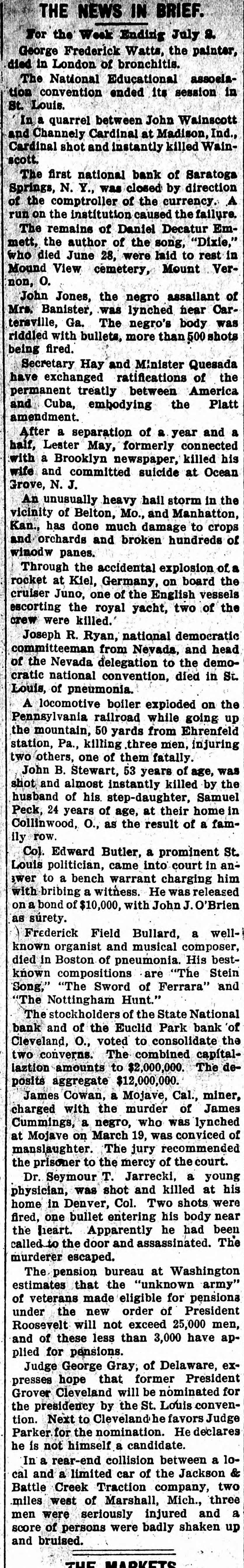 THE NEWS IN BRIEF. For the Week Ending July 3. George Frederick Watts, the painter, died in London of bronchitis. The National Educational assoelation convention ended its session in St. Louis. In a quarrel between John Wainscott and Channely Cardinal at Madison, Ind., Cardinal shot and instantly killed Wainscott. The first national bank of Saratoga Springs, N. Y., was closed by direction of the comptroller of the currency. A run on the institution caused the failure. The remains of Daniel Decatur Emmett, the author of the song, "Dixie," who died June 28, were laid to rest in Mound View cemetery, Mount Vernon, O. John Jones, the negro assailant of Mrs. Banister, was lynched near Cartersville, Ga. The negro's body was riddled with bullets, more than 500 shots being fired. Secretary Hay and Minister Quesada have exchanged ratifications of the permanent treatly between America and Cuba, embodying the Platt amendment. After a separation of a year and a half, Lester May, formerly connected with a Brooklyn newspaper, killed his wife and committed suicide at Ocean Grove, N. J. An unusually heavy hall storm in the vicinity of Belton, Mo., and Manhatton, Kan., has done much damage to crops and orchards and broken hundreds of winodw panes. Through the accidental explosion of a rocket at Kiel, Germany, on board the cruiser Juno, one of the English vessels escorting the royal yacht, two of the crew were killed. Joseph R. Ryan, national democratic committeeman from Nevada, and head of the Nevada delegation to the democratic national convention, died in St. Louis, of pneumonia. A locomotive boiler exploded on the Pennsylvania railroad while going up the mountain, 50 yards from Ehrenfeld station, Pa., killing three men, injuring two others, one of them fatally. John B. Stewart, 53 years of age, was shot and almost instantly killed by the husband of his step-daughter, Samuel Peck, 24 years of age, at their home in Collinwood, O., as the result of a family row. Col. Edward Butler, a prominent St. Louis politician, came into court in answer to a bench warrant charging him with bribing a witness. He was released on a bond of $10,000, with John J. O'Brien as súrety. ) Frederick Field Bullard, a wellknown organist and musical composer, died in Boston of pneumonia. His bestknown compositions are "The Stein Song," "The Sword of Ferrara" and "The Nottingham Hunt." The stockholders of the State National bank and of the Euclid Park bank of Cleveland, O., voted to consolidate the two converns. The combined capitallaztion amounts to $2,000,000. The deposits aggregate $12,000,000. James Cowan, a Mojave, Cal., miner, charged with the murder of James Cummings, a negro, who was lynched at Mojave on March 19, was conviced of manslaughter. The jury recommended the prisoner to the mercy of the court. Dr. Seymour T. Jarrecki, a young physician, was shot and killed at his home in Denver, Col. Two shots were fired, one bullet entering his body near the heart. Apparently he had been called to the door and assassinated. The murderer escaped. The pension bureau at Washington estimates that the "unknown army" of veterans made eligible for pensions under the new order of President Roosevelt will not exceed 25,000 men, and of these less than 3,000 have applied for pensions. Judge George Gray, of Delaware, expresses hope that former President Grover Cleveland will be nominated for the presidency by the St. Louis convention. Next to Cleveland he favors Judge Parker for the nomination. He declares he is not himself a candidate. In a rear-end collision between a local and a limited car of the Jackson & Battle Creek Traction company, two miles west of Marshall, Mich., three men were seriously injured and a score of persons were badly shaken up and bruised. THE MARKETS