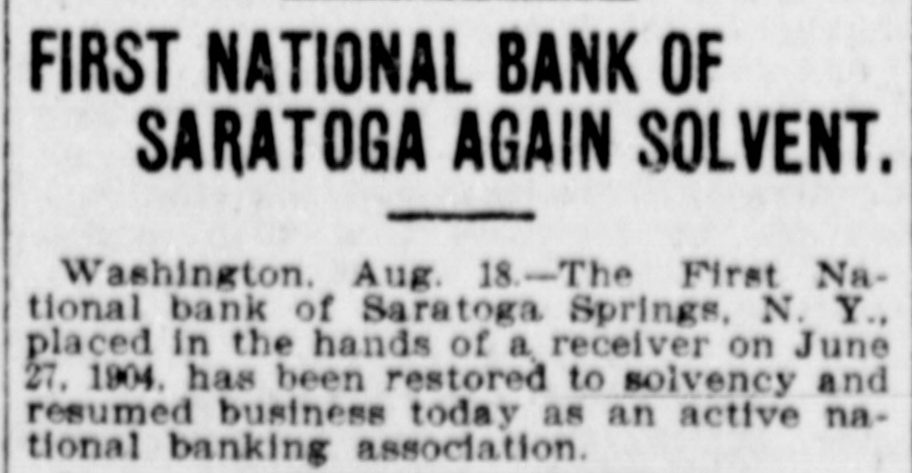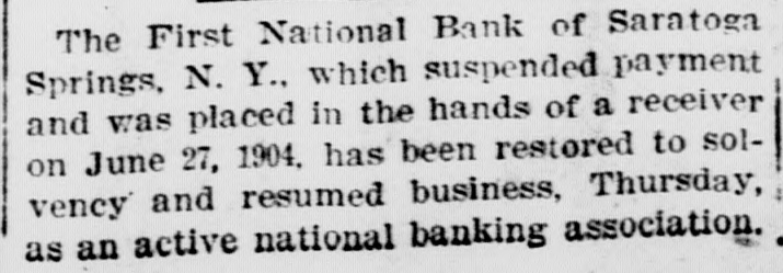 The First National Bank of Saratoga Springs, N. Y., which suspended payment and was placed in the hands of a receiver on June 27, 1904. has been restored to solvency and resumed business, Thursday, as an active national banking association.