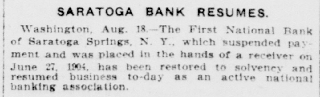 SARATOGA BANK RESUMES. Washington, Aug. 18.-The First National Bank of Saratoga Springs, N. Y., which suspended payment and was placed in the hands of a receiver on June 27. 1904. has been restored to solvency and resumed business to-day as an active national banking association.